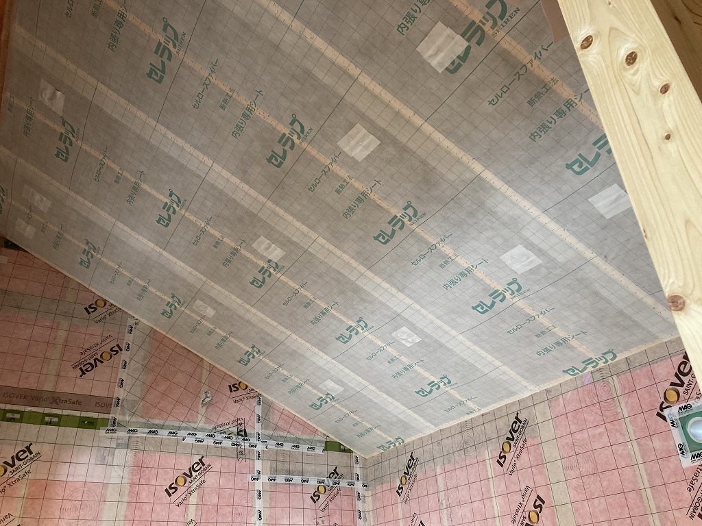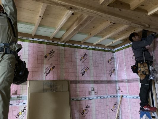 s幸棟梁は、3日間の間に1階の充填断熱グラスウールを入れ終えて調湿気密シートも張り終えています。2階の床にも、プラスターボードを張り終えています。早っ💦