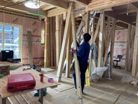 2階の吹抜け勾配天井部分です。勾配天井は大工さん達、皆さん段々の足場を掛けて作業しています。ちょっとした劇場の観客席みたいです。長い道板は乗るとフワフワするので、室内の作業も結構危険です。