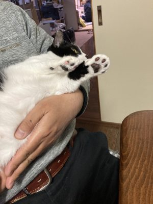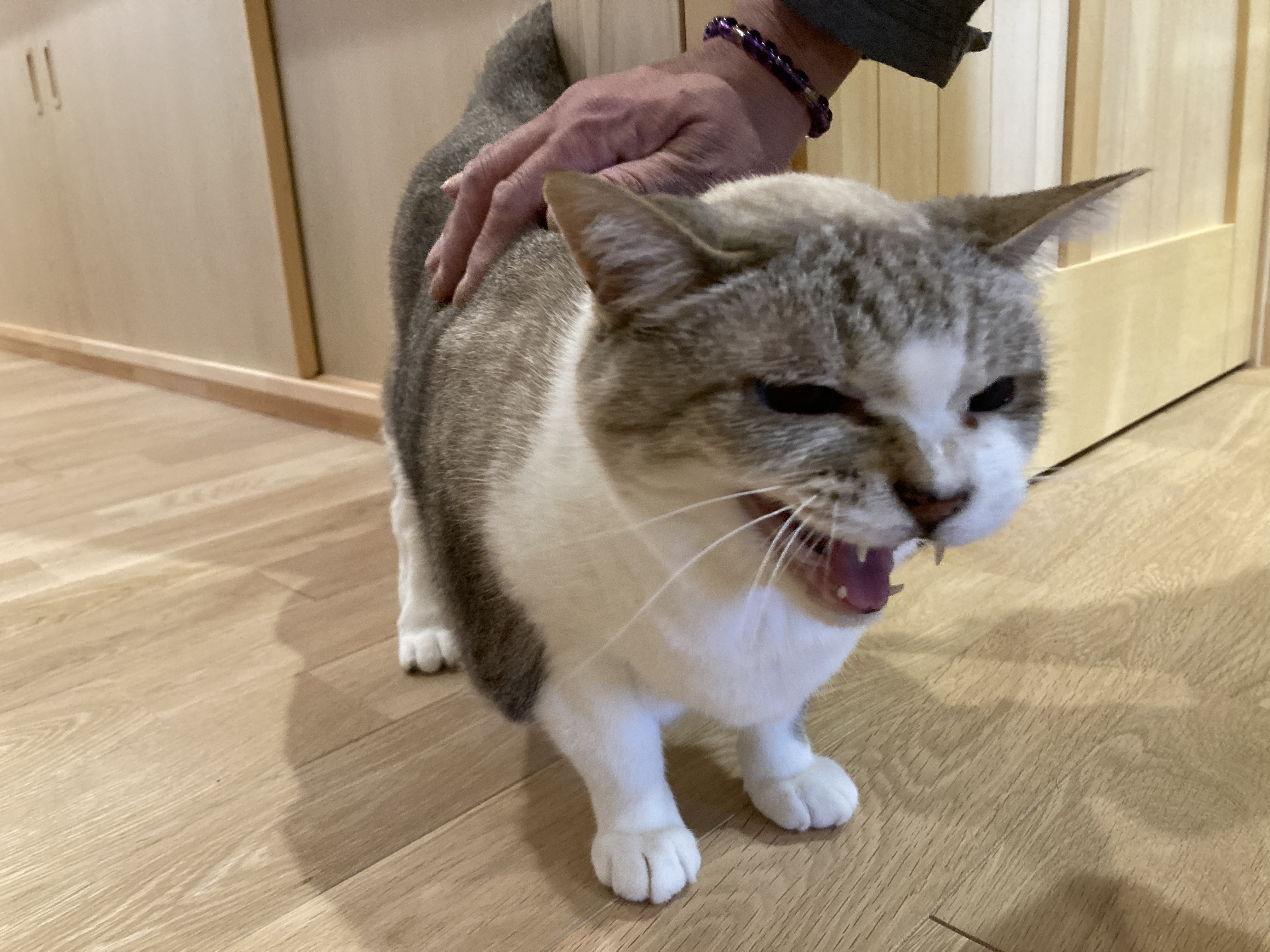 さて、室内ではf井電気のh場さんが来ています。3年前から人懐っこくなったまるちゃんが、スリスリしに来ました。可愛いのにハスキー声です(笑)
