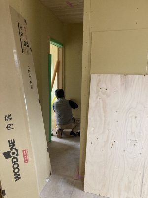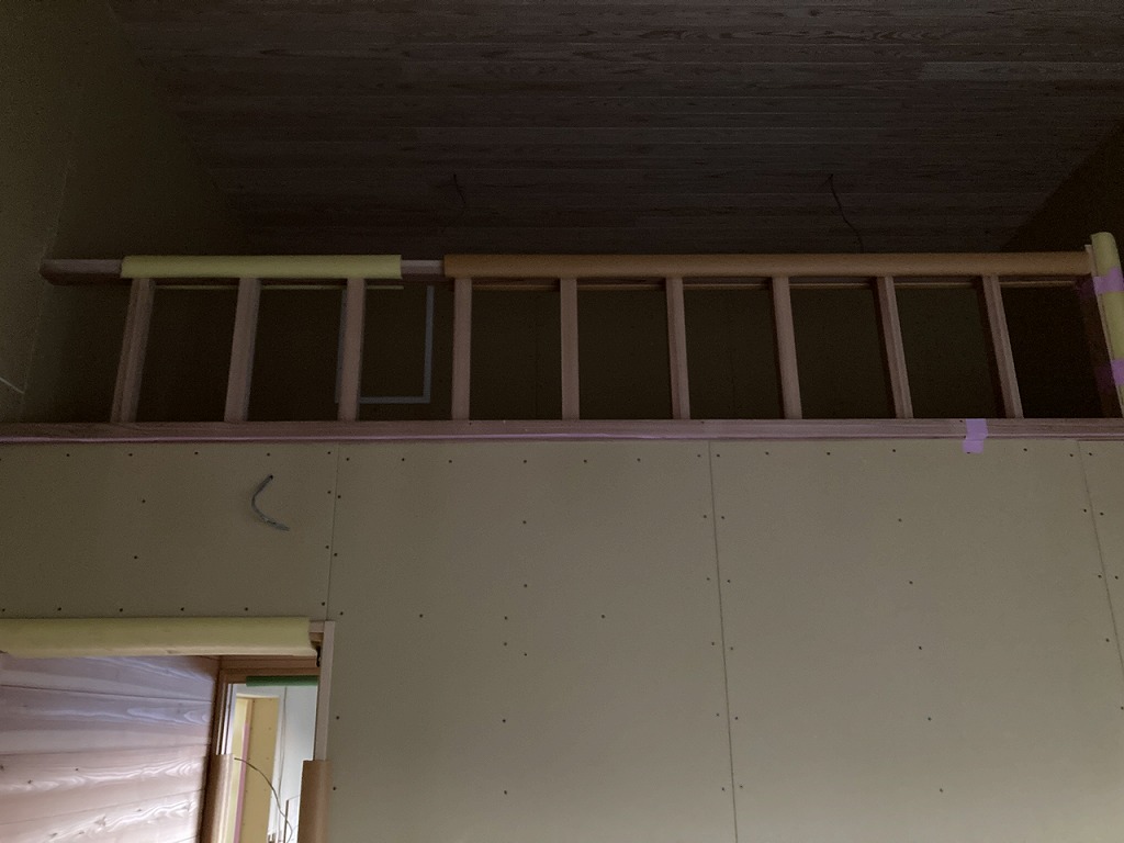 手摺の受け材が取り付くところは、プラスターボードが凹んでしまうといけないので、クロスベニヤと言う合板下地に張り替えてます。s幸棟梁の気遣い凄いです~