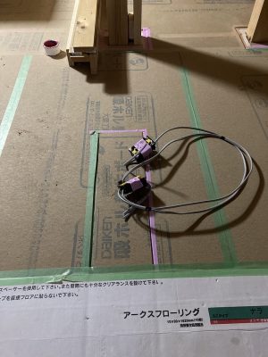 ダイニングに壁掛けテレビを設置する予定なので、「ダイニングテーブルの高さが大体70cmなので~」とスケールを当てると「え~こんなに低いっけ?」とi様ご夫婦の第一声。まだ天井も壁も出来ていない室内は広々しているので、70cmが小さくみえてしまうんですね。これは、電気打合せで結構皆さん疑われるので、これから何人「え~」と言われるかカウントして楽しんでみようかと思います👍