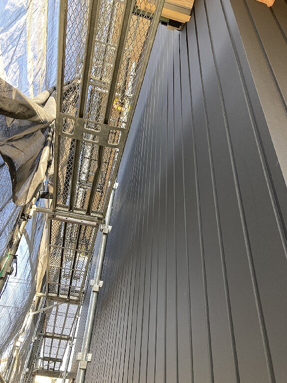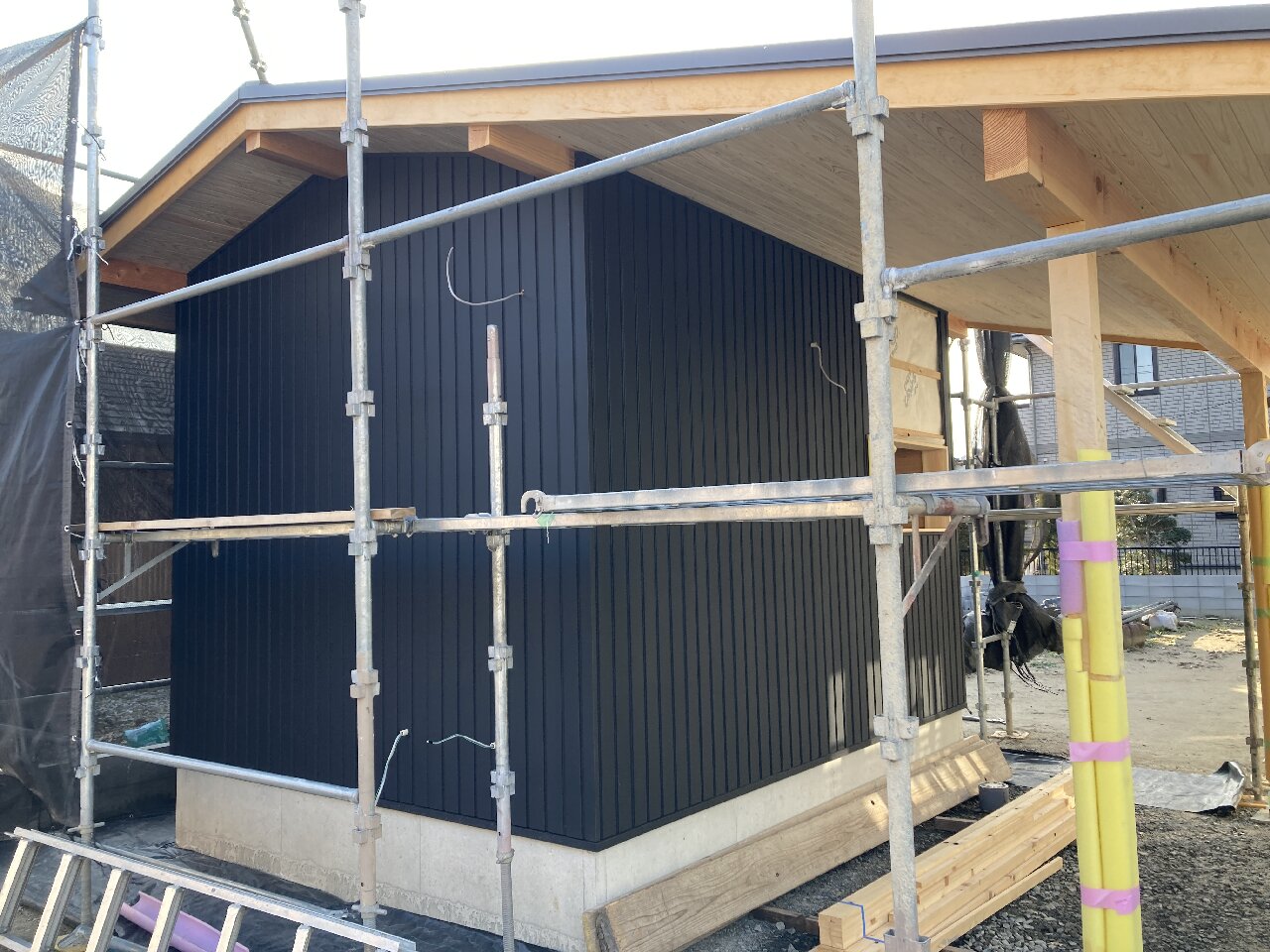 平屋部分は、モルタル下地に吹付リシン仕上げ。総2階部分は、ガルバリウム鋼板張りです。ガルバリウム鋼板は、縦張りにしましたので、通気胴縁をタテに張ってから、板金用の下地を横に入れています。こちらも下地なのにキレイな正方形です👍