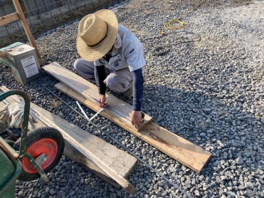 こちらは、昨日のt広さんの作業風景です。i様邸は、母屋も小屋も軒が長い部分があり、外ですが化粧柱を設けます。そのベースとなる部分の型枠を木で造っています。(またの名の多いhさん撮影)