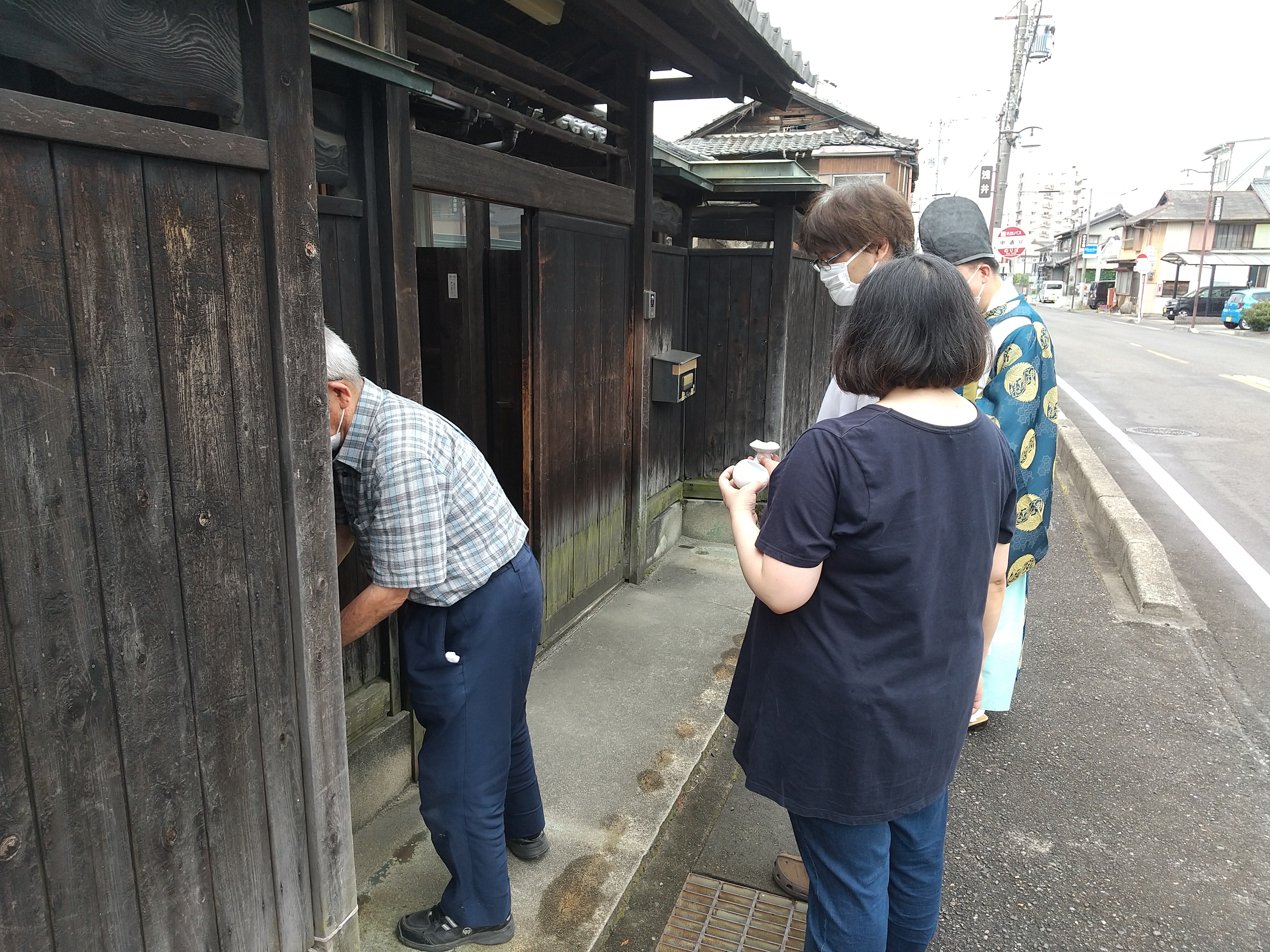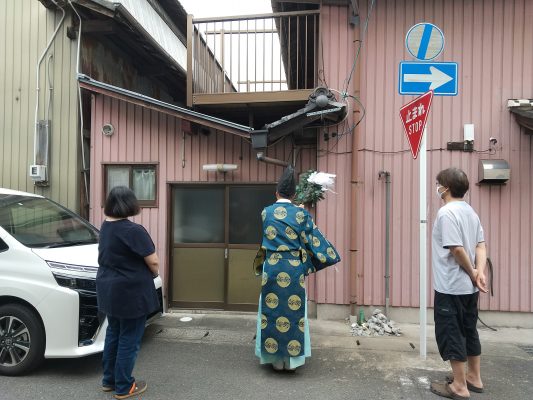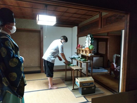 玄関先をお祓いします。こちらも通常なら1か所のところ、3カ所。お神酒とお塩、お水がなみなみに注がれていていましたが、皆さん遠慮がちに撒かれて最後までなみなみでした。
