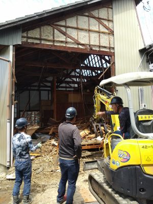 重機が入って行けるように、工場の出入り口から壊しにかかります。