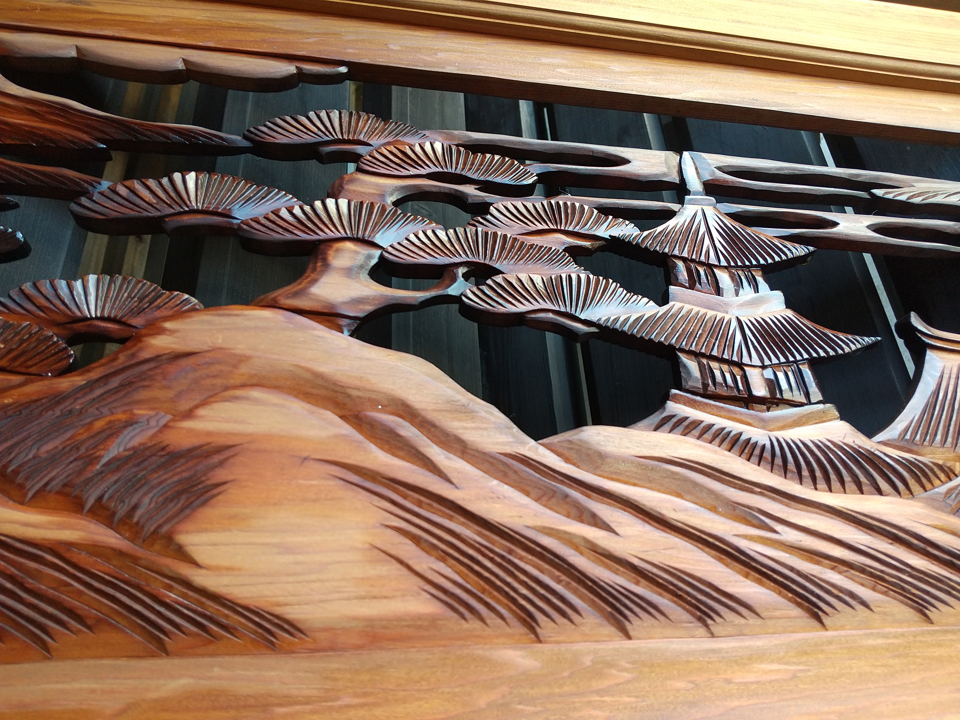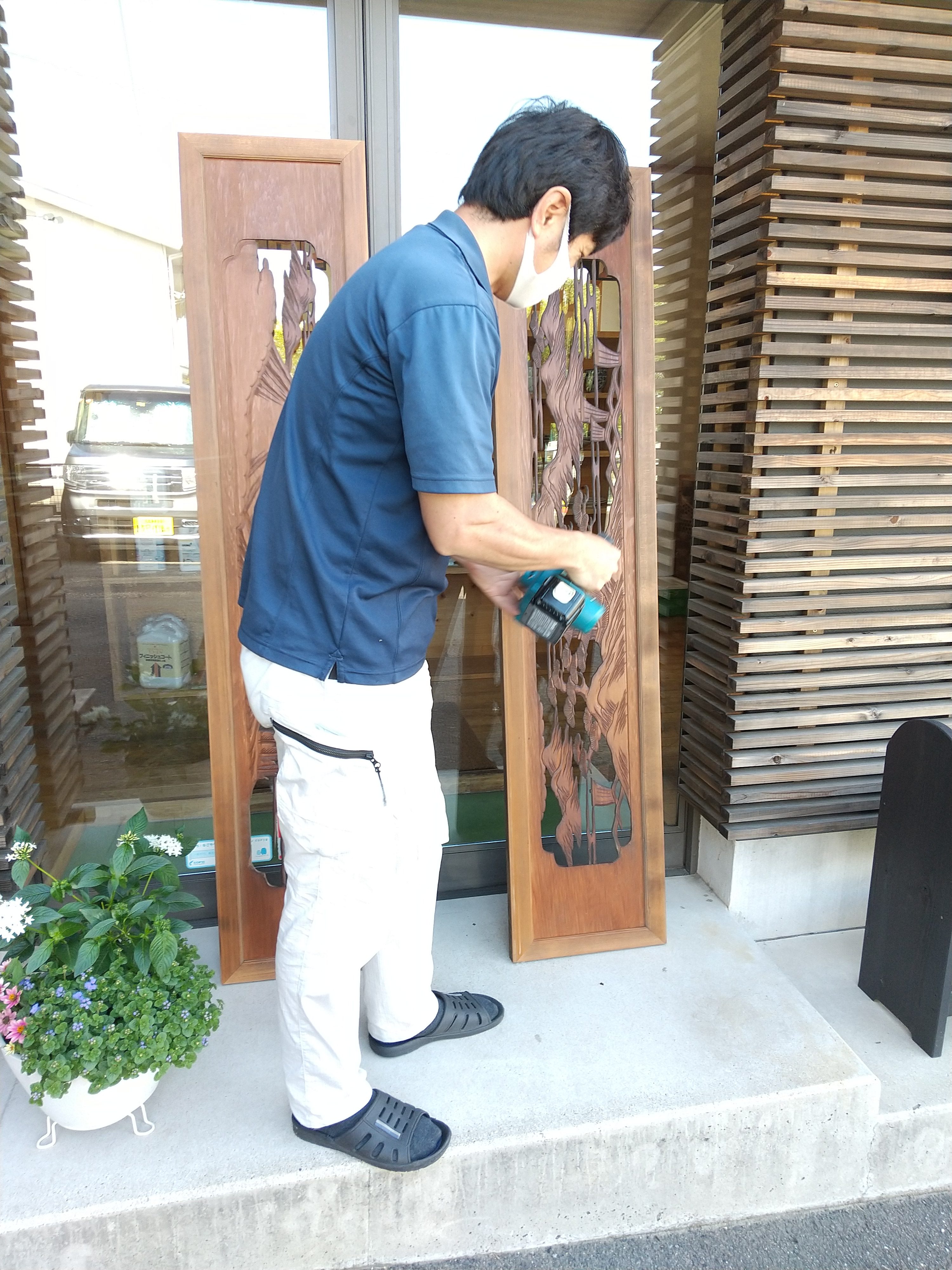 こちらにも「ハンターh氏」登場!なんて(笑) 今回は、i様から既存の欄間を使いたいとのご要望があり、引き上げてきました。ハンターh氏に埃を払ってもらい、水洗いをしました。少々割れもありますので、a朗監督が補修してくれる予定です👍夢が膨らみますなぁ。