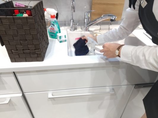 コロナの影響でショールーム滞在時間に制限があり、1回目では見えれなかったお手入れ方法も案内してもらいました。見た目やシンクと天板の継ぎ目がない事から、人大のシンクを選ばれてる方が多いですが、実際に汚れが付いた時はどうするのか、経年劣化した際のお手入れはどうしたらよいかなども聞きました。タカラさんのホーローキッチンはキレイに長く使える商品なので、シンクや天板も長くキレイに使いたいですもんね。