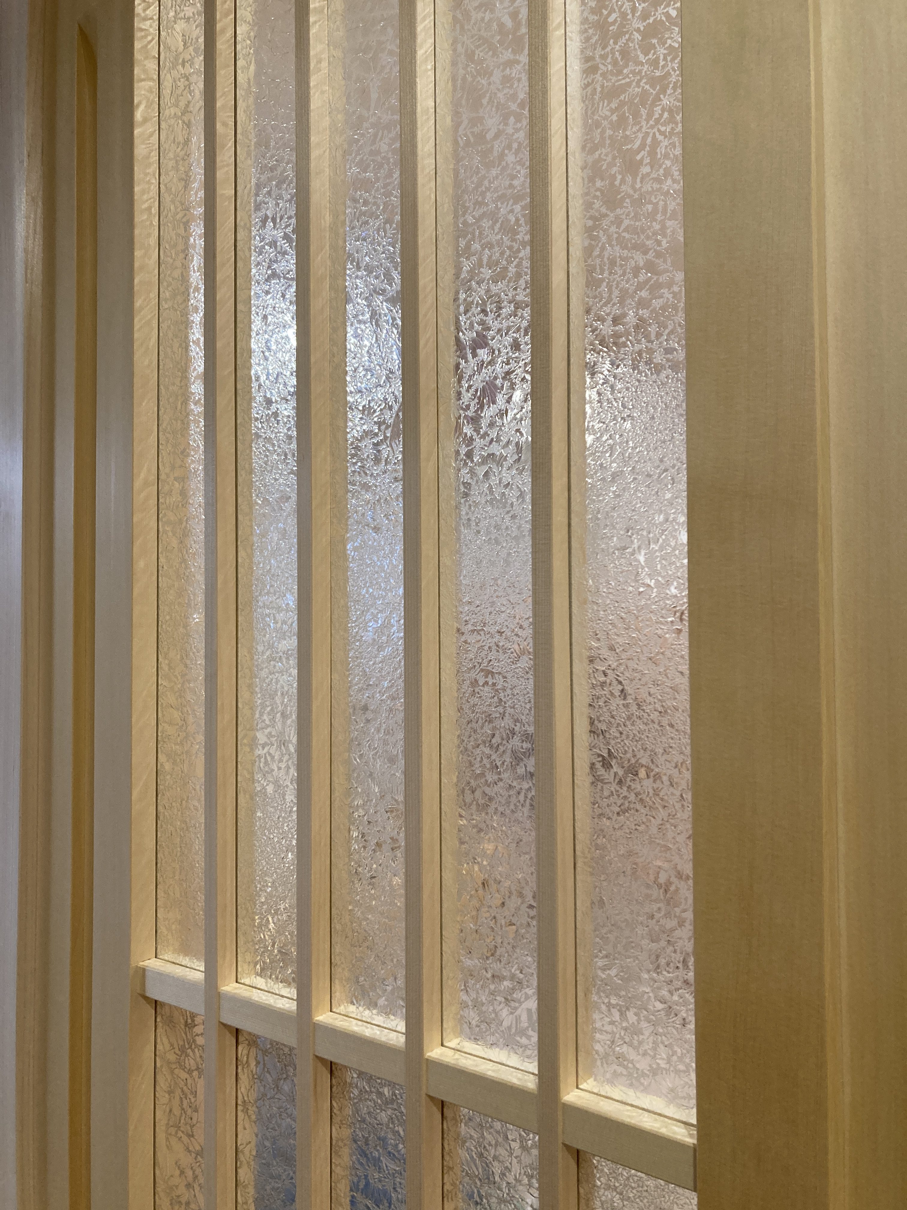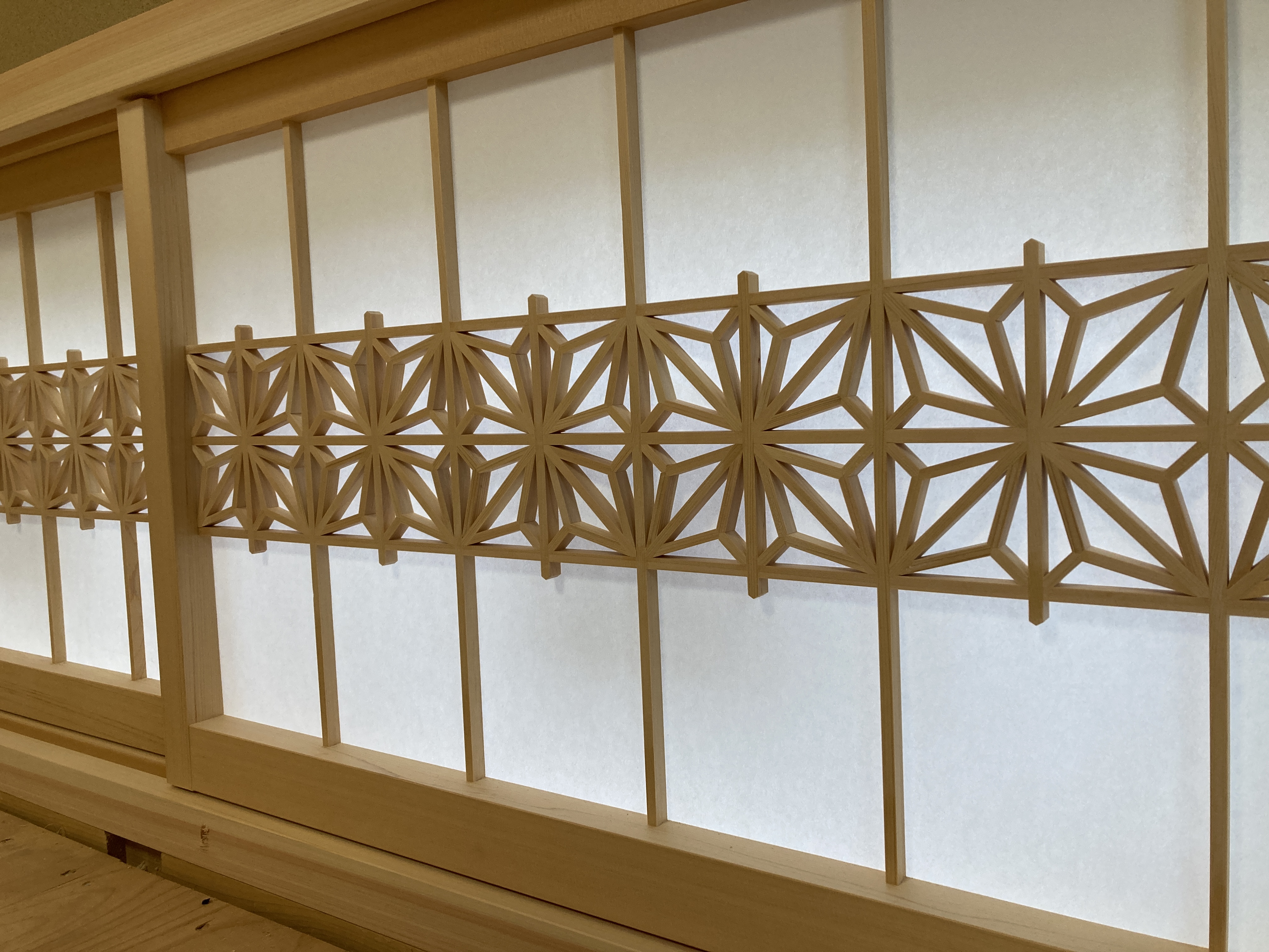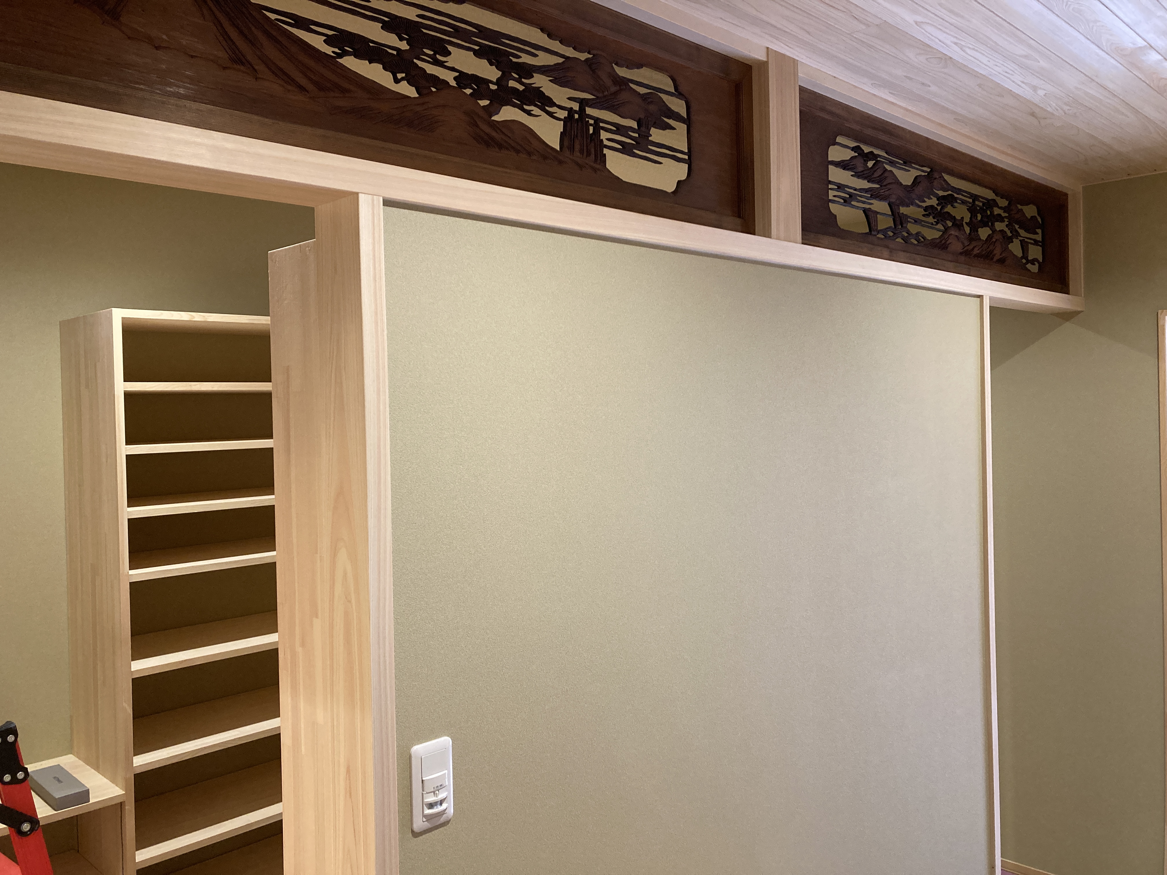 障子の組子は今回、f井建具さんのお父さんの力作です👍玄関からLDKに入る扉には、旧家に使われていた建具のガラスを再利用しました。今はこの様な型ガラスはデザインガラス(ステンドガラス)扱いで輸入品が多いです。玄関とSCLの間には、yo様にとって思い出深い欄間を取り付けました。取れてしまった部分も修復してもらっています👍