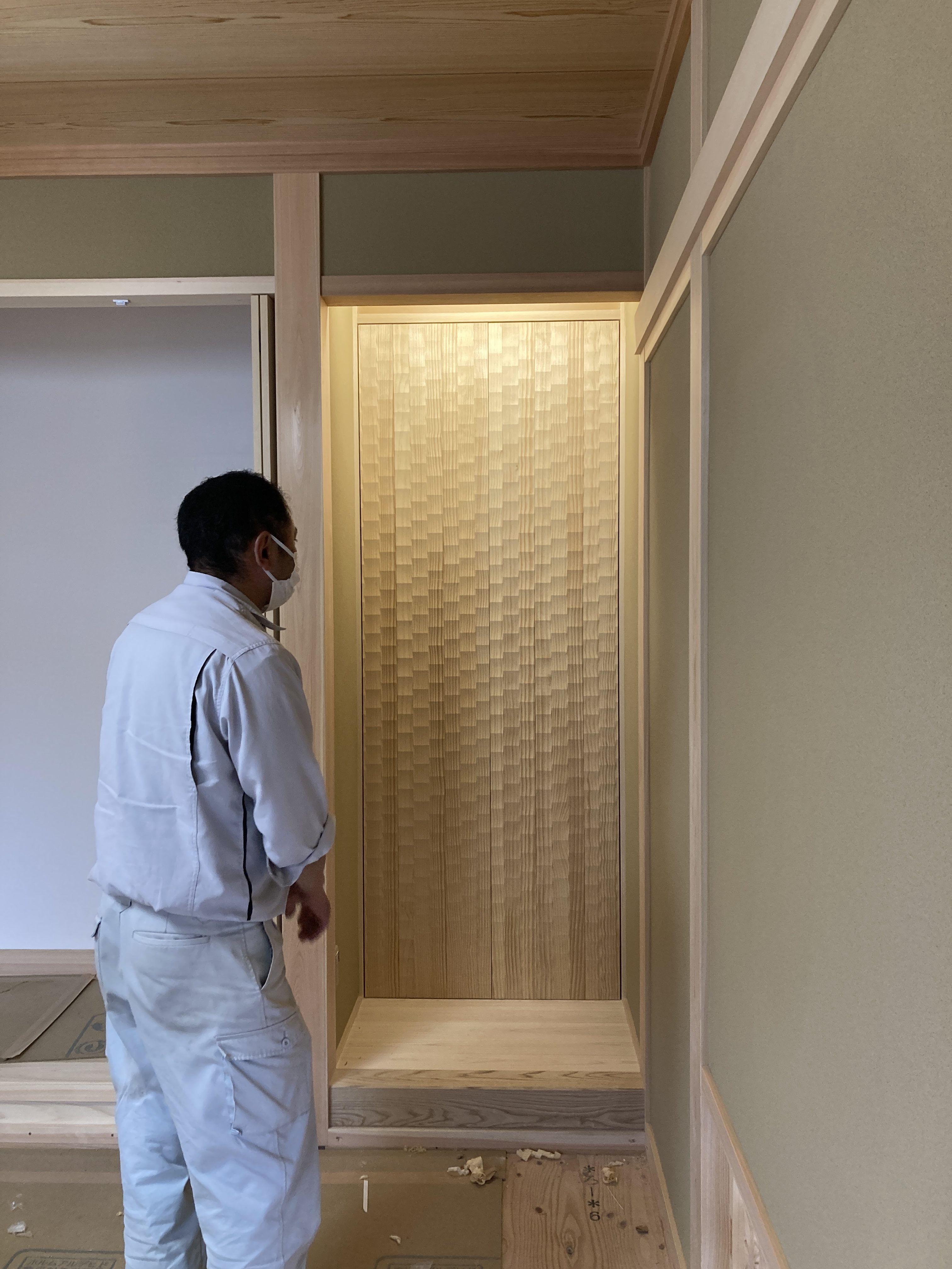 和室の造作が完了しています👍今回は、建具が2mなので長押を付けるのかどうか、建物に伸びが付いていて材料の幅が足りないなど、全体のバランスがおかしくならないか心配でしたが、棟梁のアドバイスもありいい感じになりました👍
