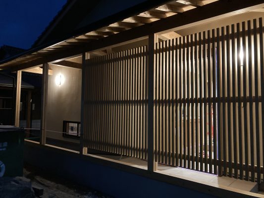 工事も大詰め。昨夜のyi様邸です。外壁に設けた照明が灯され、格子やポーチ庇の垂木に陰影ついて、とても良い雰囲気です。点灯式は、昨日の夕方行われた様です。これが、神戸のルミナリエくらいの感動があるんですよ~今回は立ち会えず残念💦