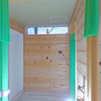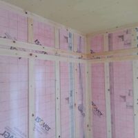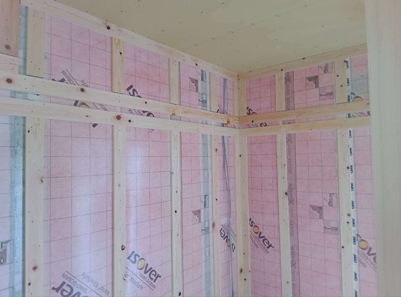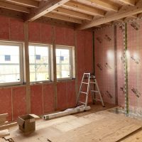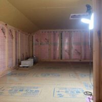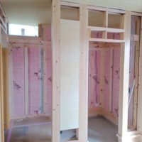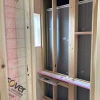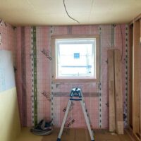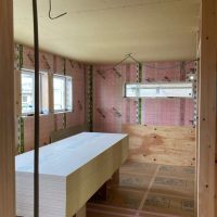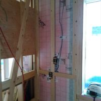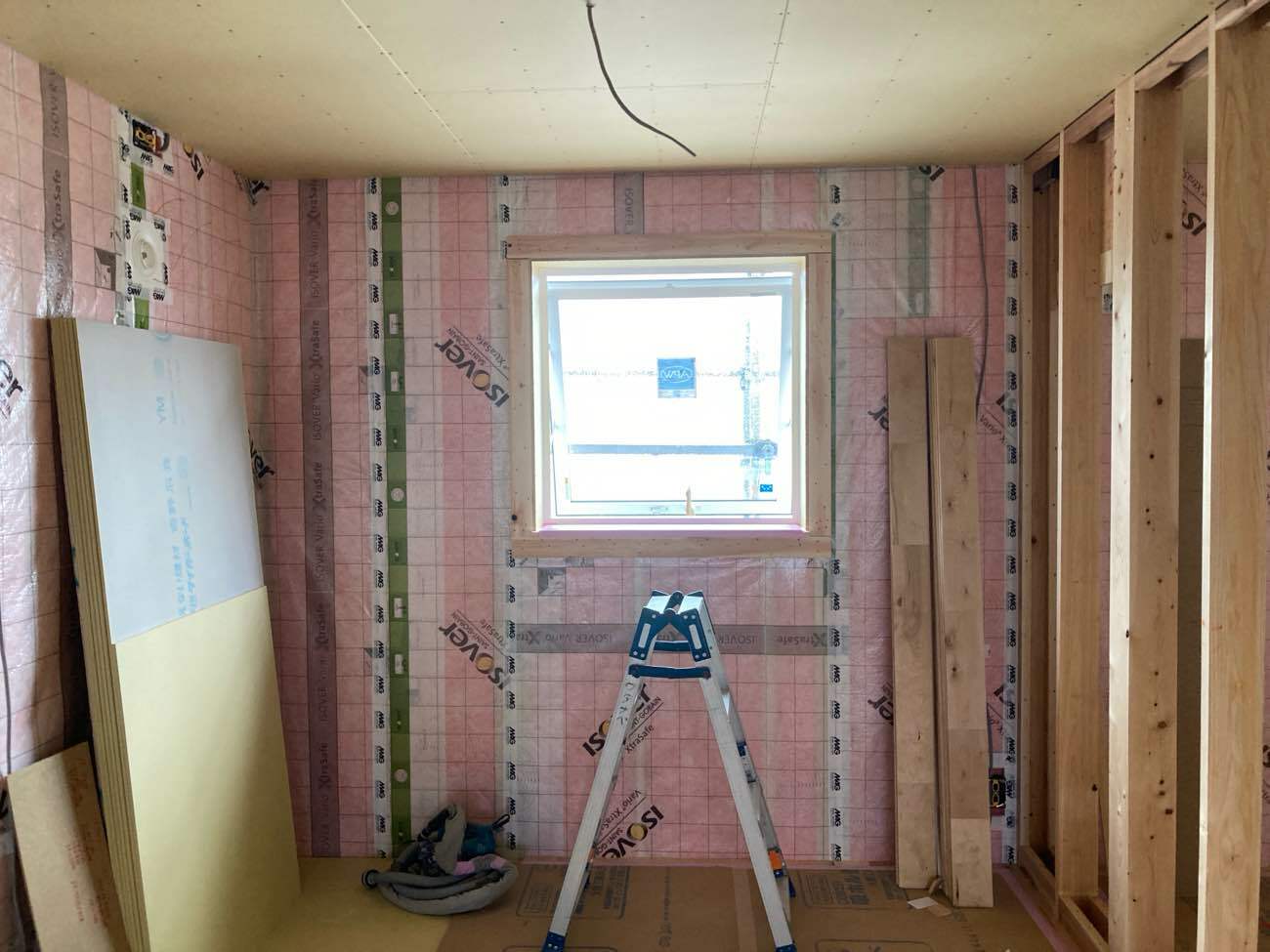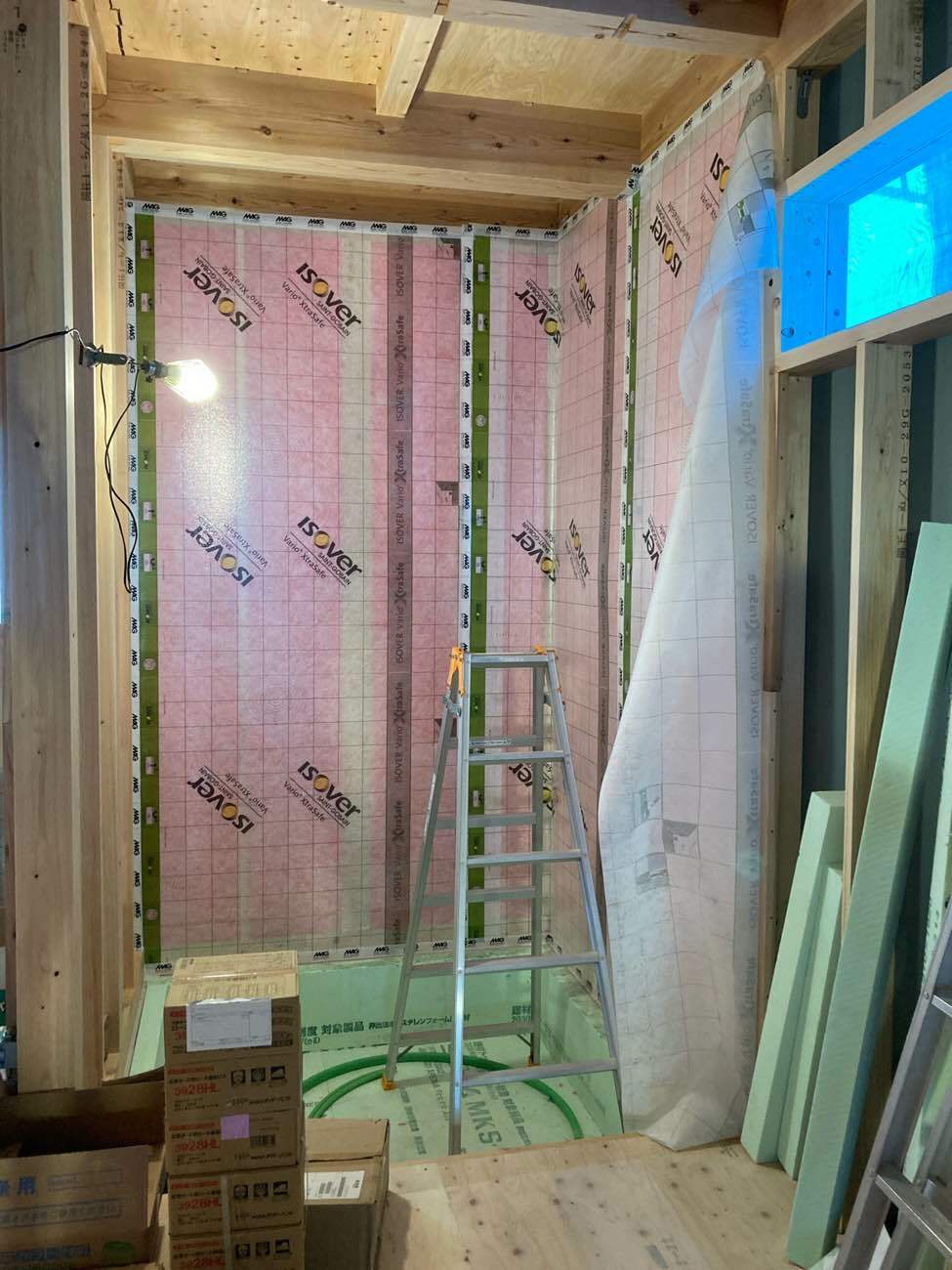 ユニットバスの設置をするため、その部分は先行して壁の充填断熱と気密工事を行いました。120角の柱と間柱の間に高性能グラスウール120㎜を充填し、可変性調湿気密シートを施します。可変性調湿気密シートは、室内で発生した水蒸気が壁体内に流入するのを防ぎ、壁体内の湿気を室内に逃がしてくれて、空気は通さないと言う優れものです。室内の温熱環境のために気密性を高くすることはもちろん、壁体内に湿気が滞ると結露が発生し、柱や梁などの構造材が腐る原因になりますので、とても大切な工程になります。