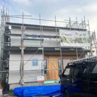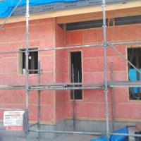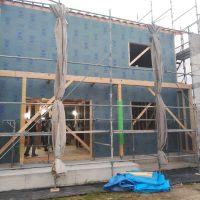 外部は、付加断熱を入れ終えて、透湿防水シートが張られました。『新住協の高断熱住宅』の文字がきれいに揃っています。よい宣伝にもなりますね。