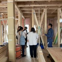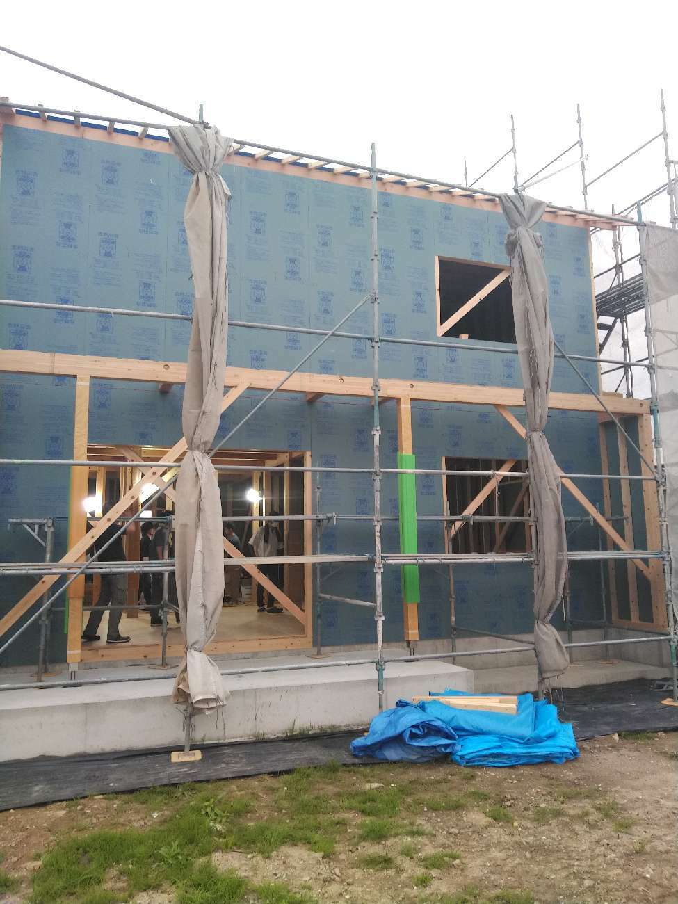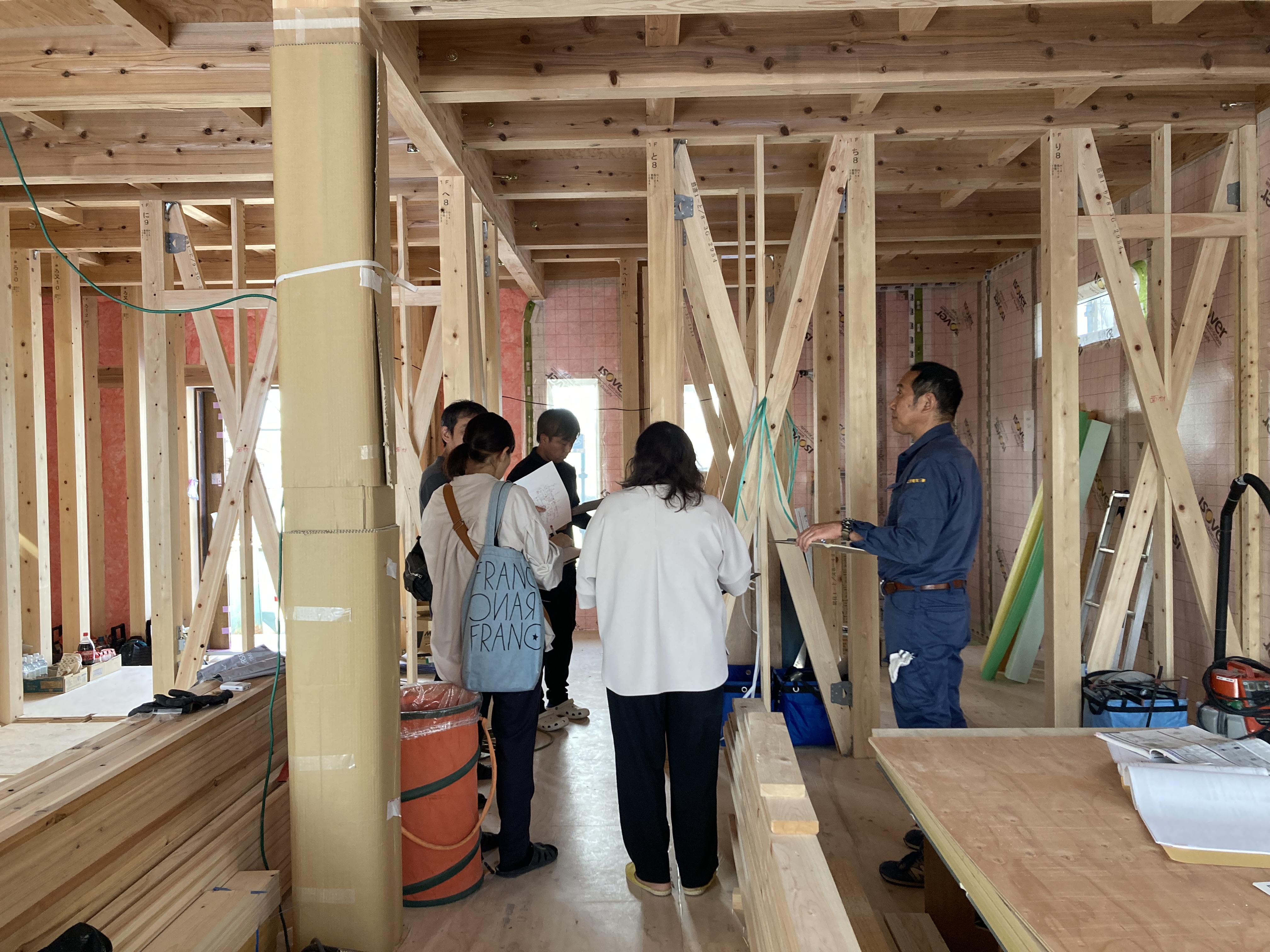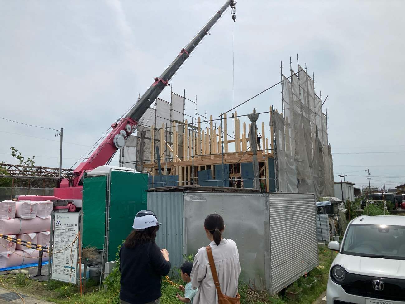 営業のkと奥様。上棟の様子を見ながら、いろんなお話をさせていただいたようです。ご主人も奥様も、元々は県外の方。就職を期にこちらに来られたそうで、4人ものお子様をお二人で育てられています。奥様もお仕事がとてもお好きだそう。見学会に来られても、計画的にご自身の家のプランと空間など比較してみえました👍お仕事に子育て、そして新築工事まで。しっかりこなされており、ご立派です👍