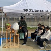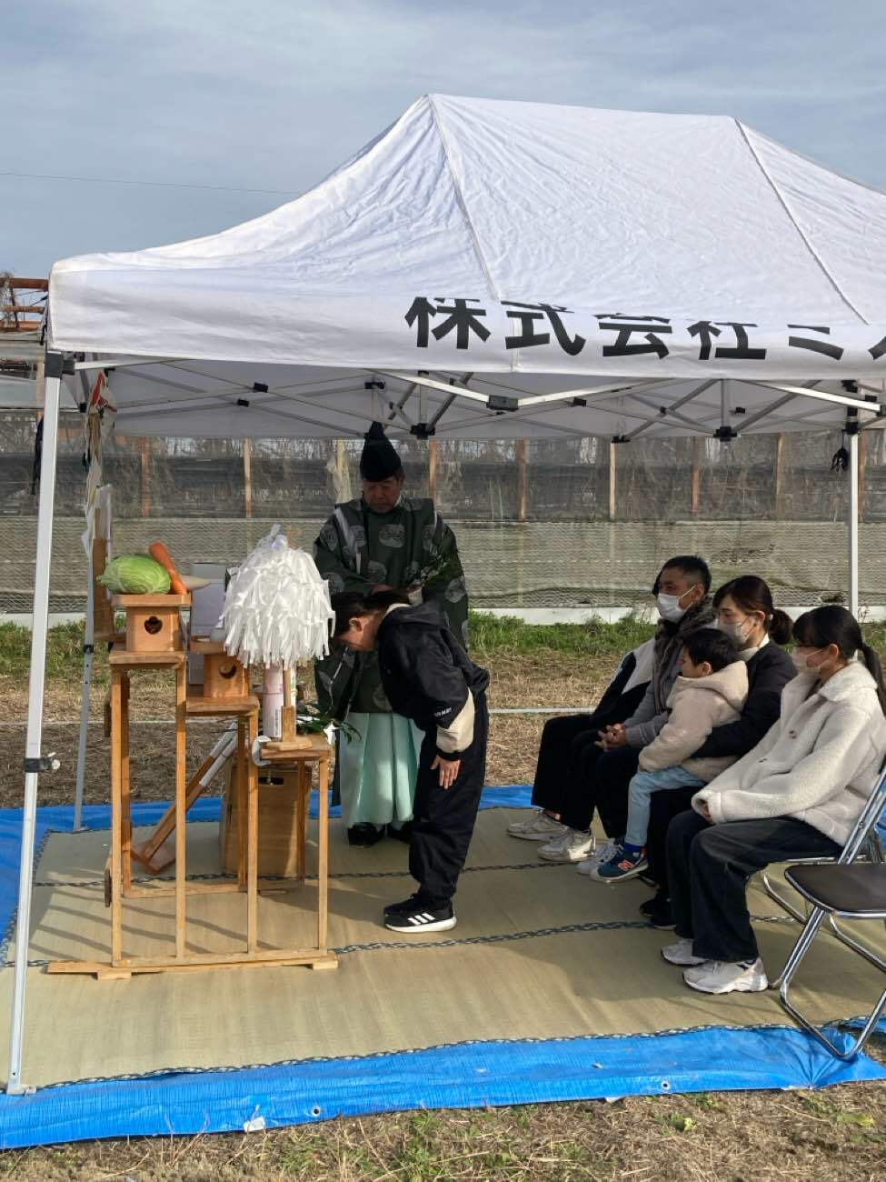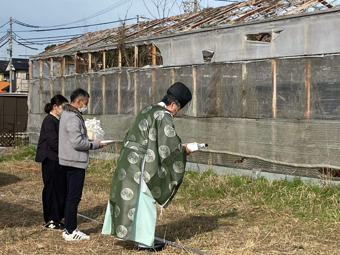 24日㈯先負けの一粒万倍日に、地鎮祭が行われました。3連休はお天気が悪い予報でしたが、中日だけ晴天。先負けのため午後に行う事にされたので、土も乾いて幸先が良いですね👍地縄を張って建物の位置をご確認いただき、近隣の方へ工事着手の挨拶に一緒に回っていただきました。