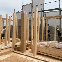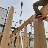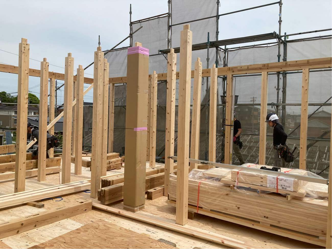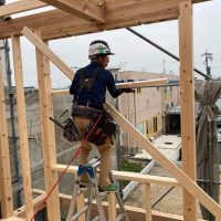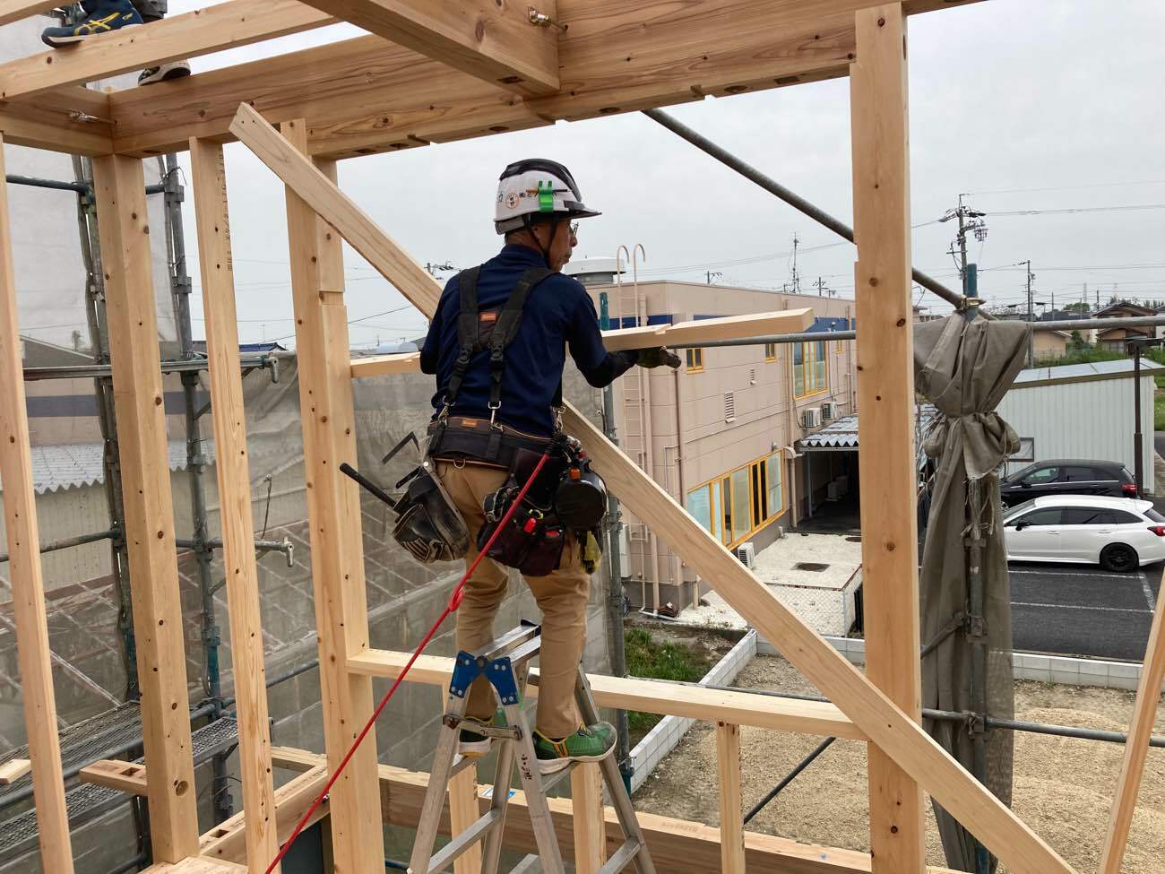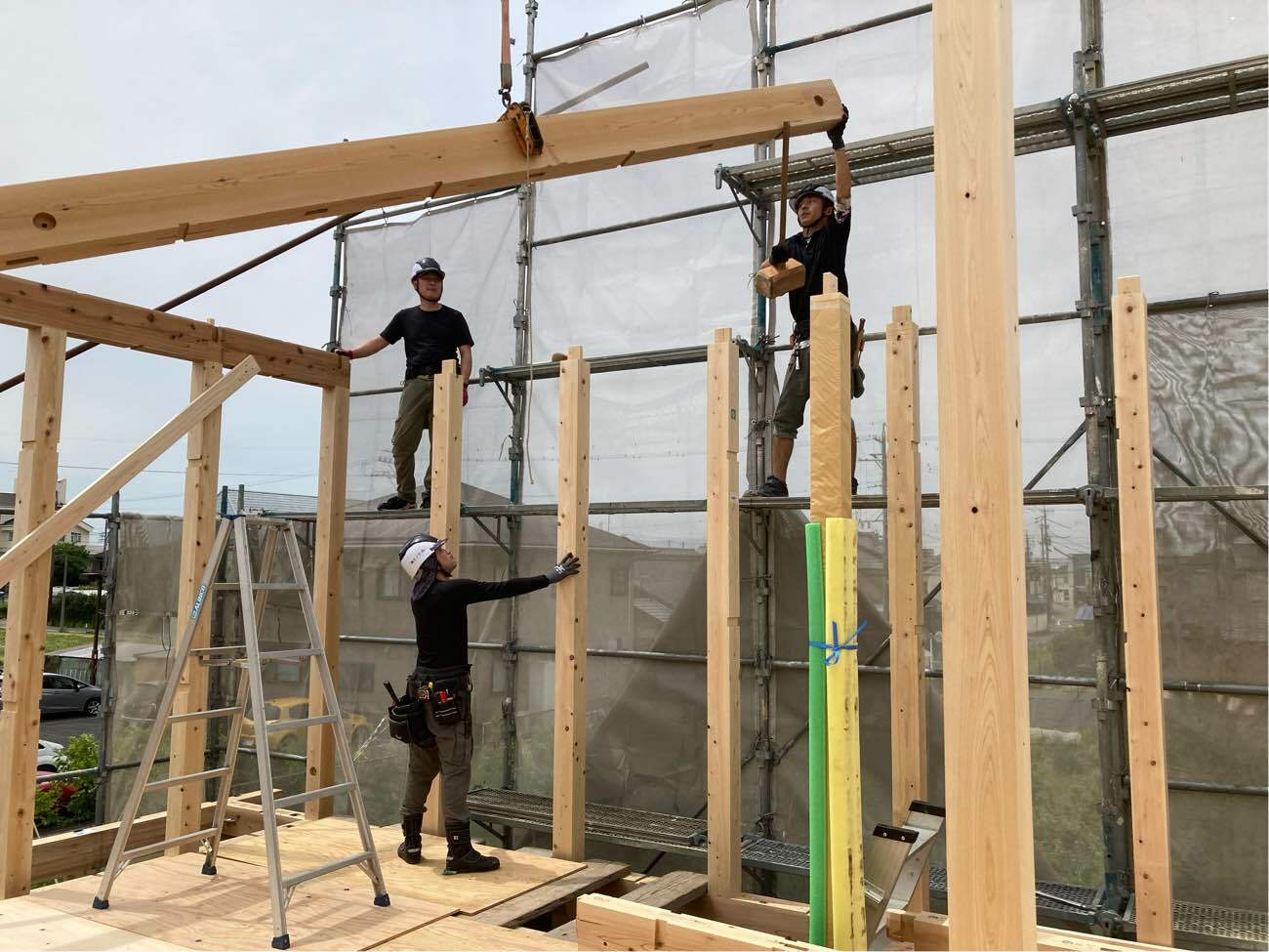 昨日と本日の2日間で建て方工事を行っています。お天気が気になる工程ですが、昨日は日差しがあり暑くなる予報が少しはずれて、薄曇りで少し蒸し暑い程度。炎天下よりも作業がしやすく順調に工事が進んでいます。