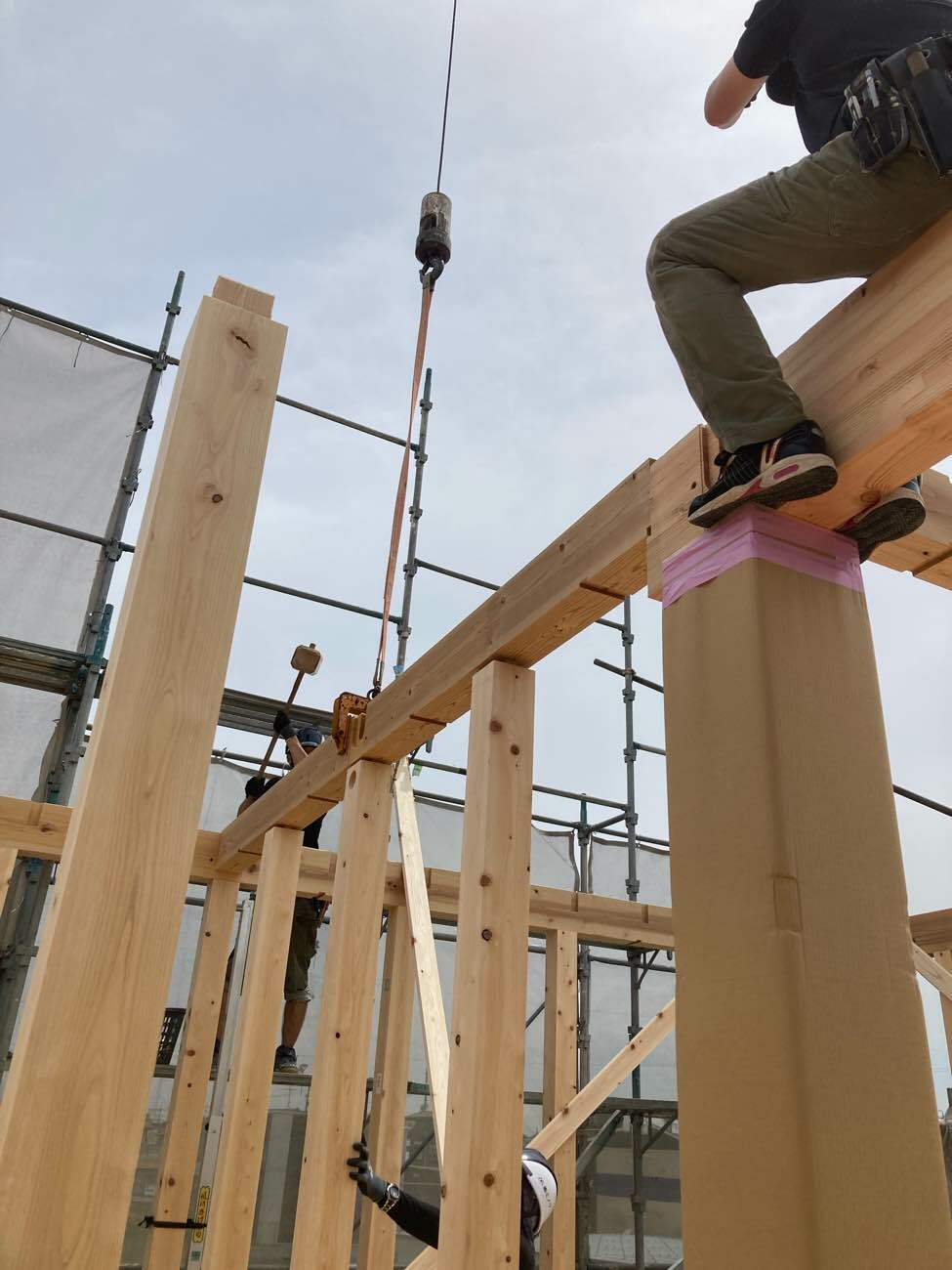 上棟の見どころは、何といっても梁材を掛けるところ。フラフラ固定されていない柱に、梁を掛ける技は何回見ても、凄いなぁと感動します。お~y様のお宅も中央に大黒柱があるんですね👍240角の桧の柱💦なかなか手に入れる事ができる業者さんは少ないと思います。