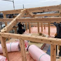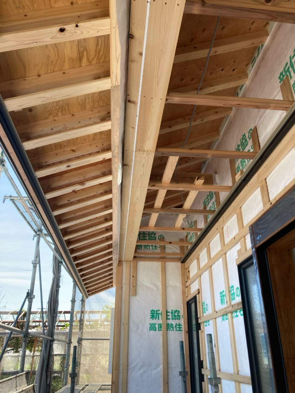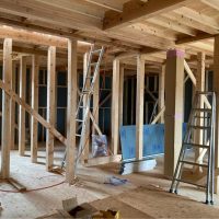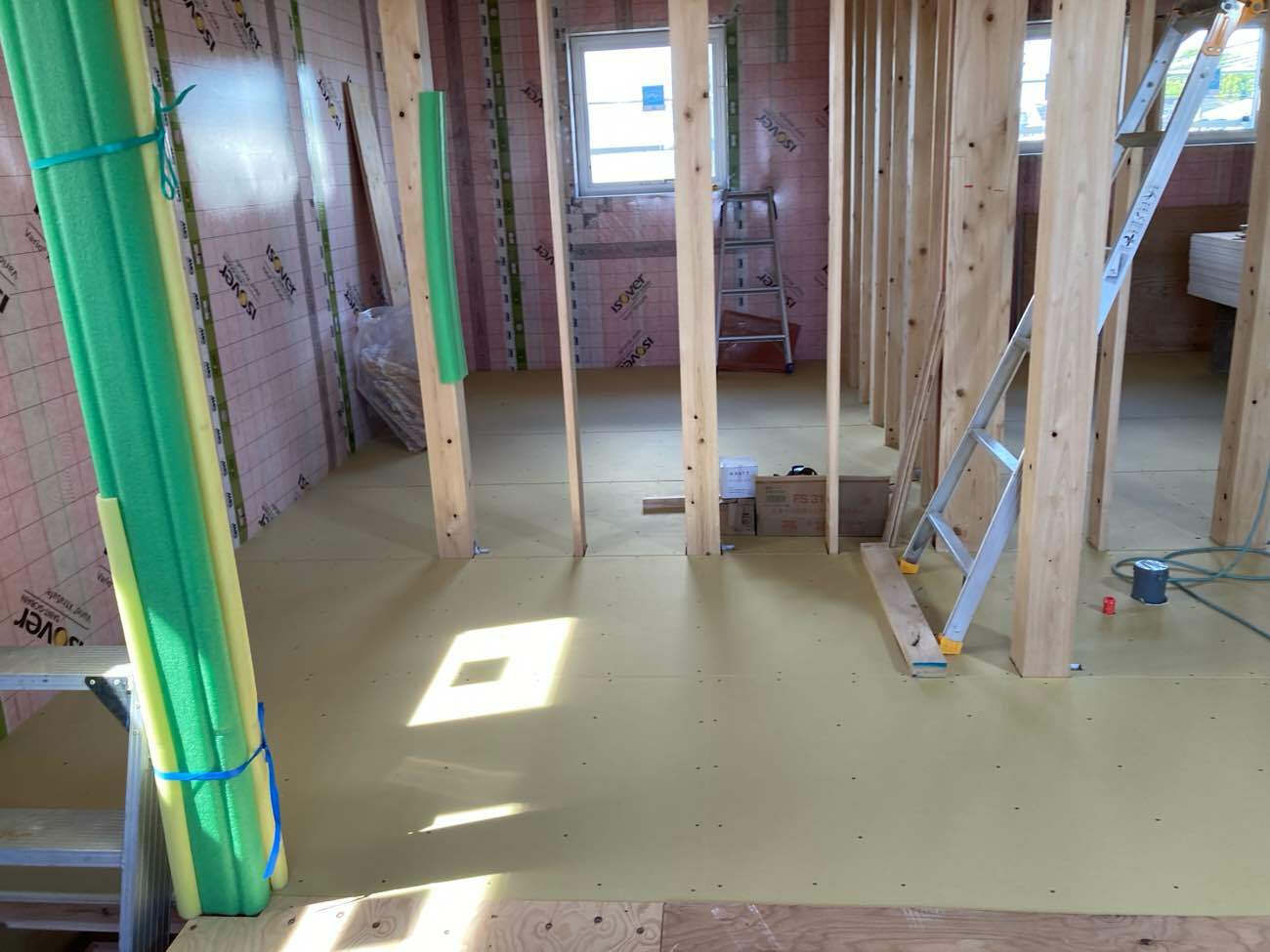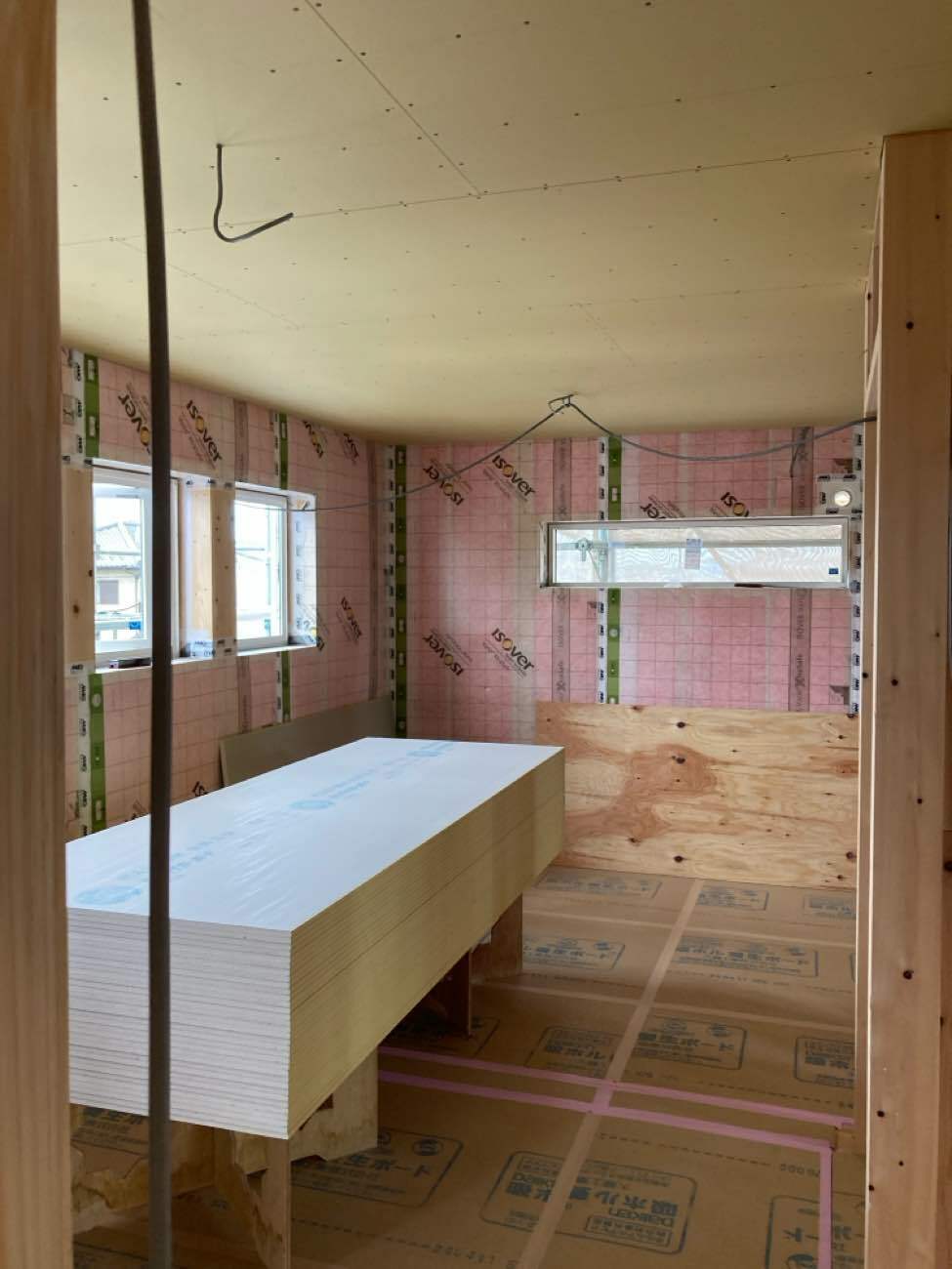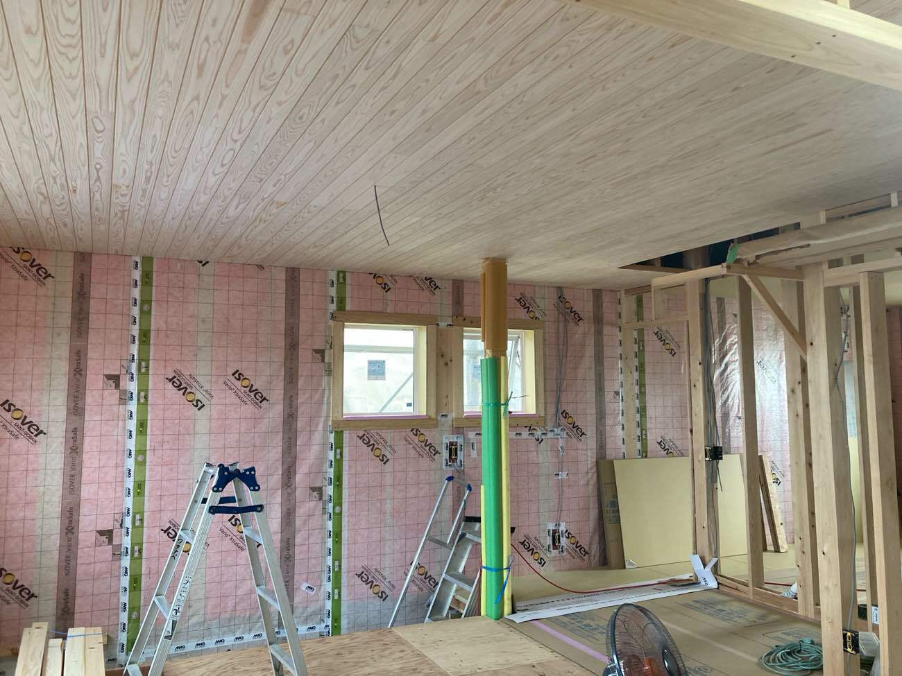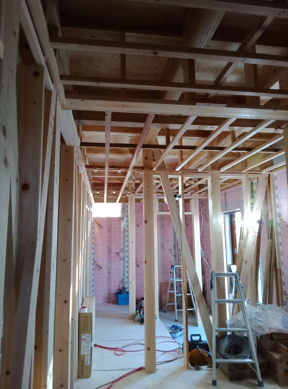 1階は天井下地を組んでいます。2階は床に石膏ボードを施しています。h典棟梁の相棒k池大棟梁も戻られましたので、木工事の進みがとても早いです👍