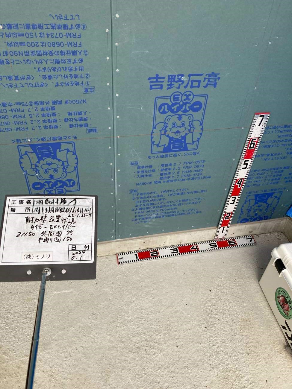 中間検査も行われました。耐力面材は、釘のピッチが正しく施工されているか、めり込みがないかなどの確認を行います。
