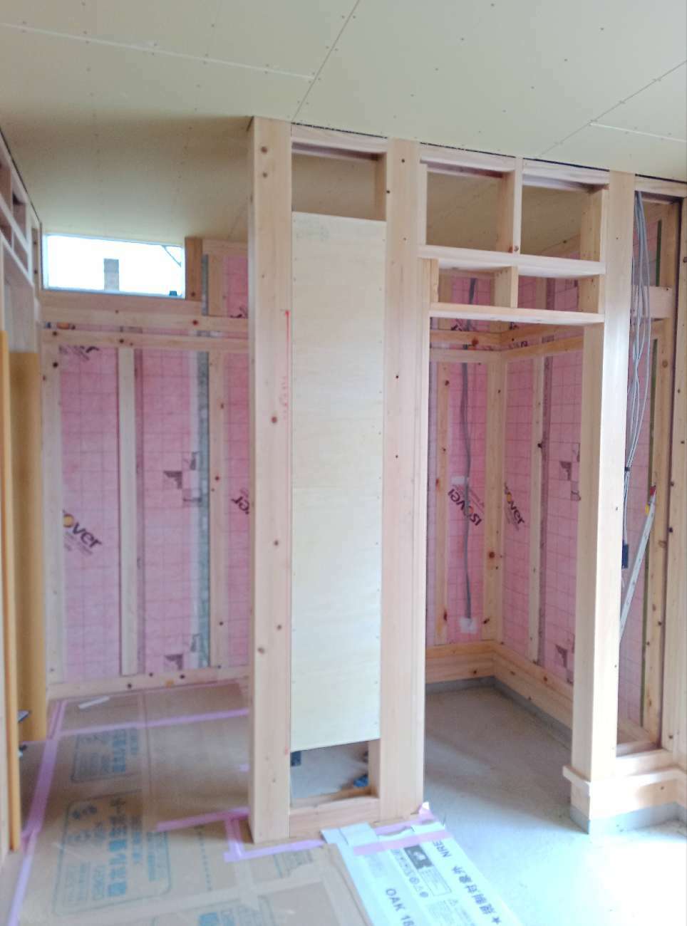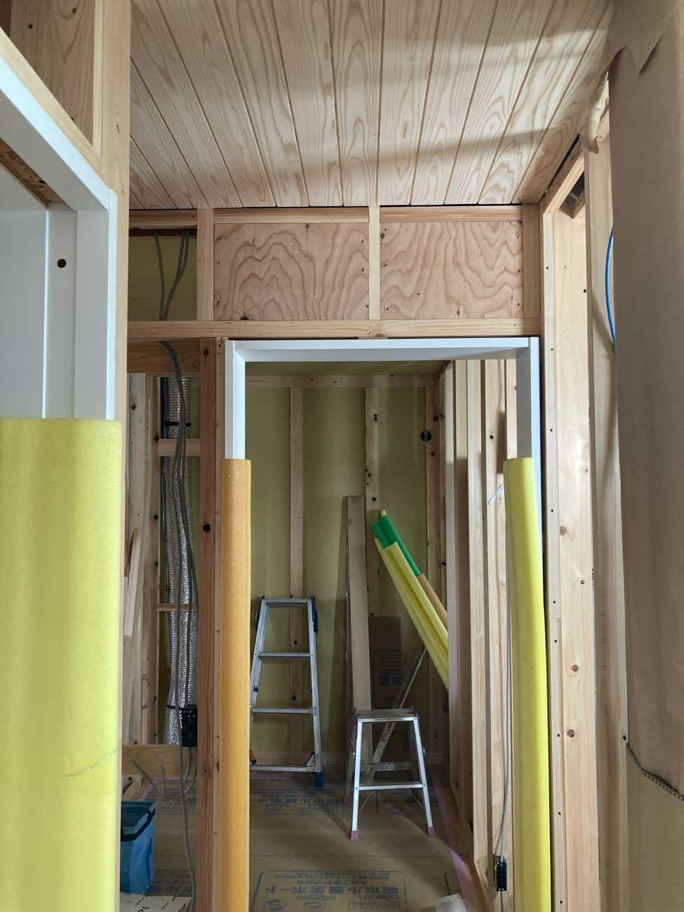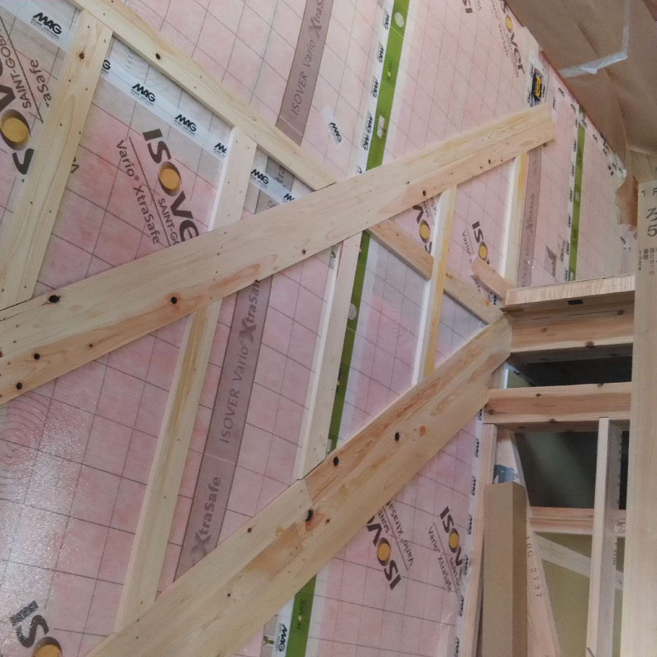 天井を張り終えて、壁の施工に入っています。階段や棚が取り付けられる部分に下地を入れている様子です。