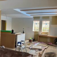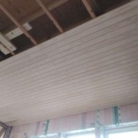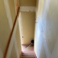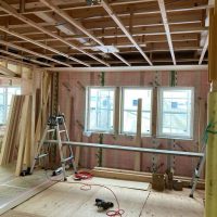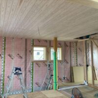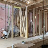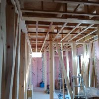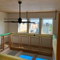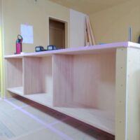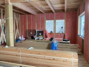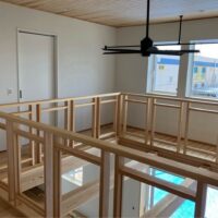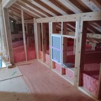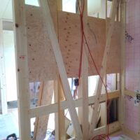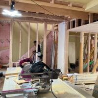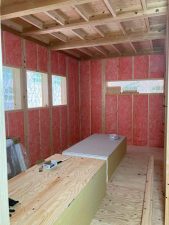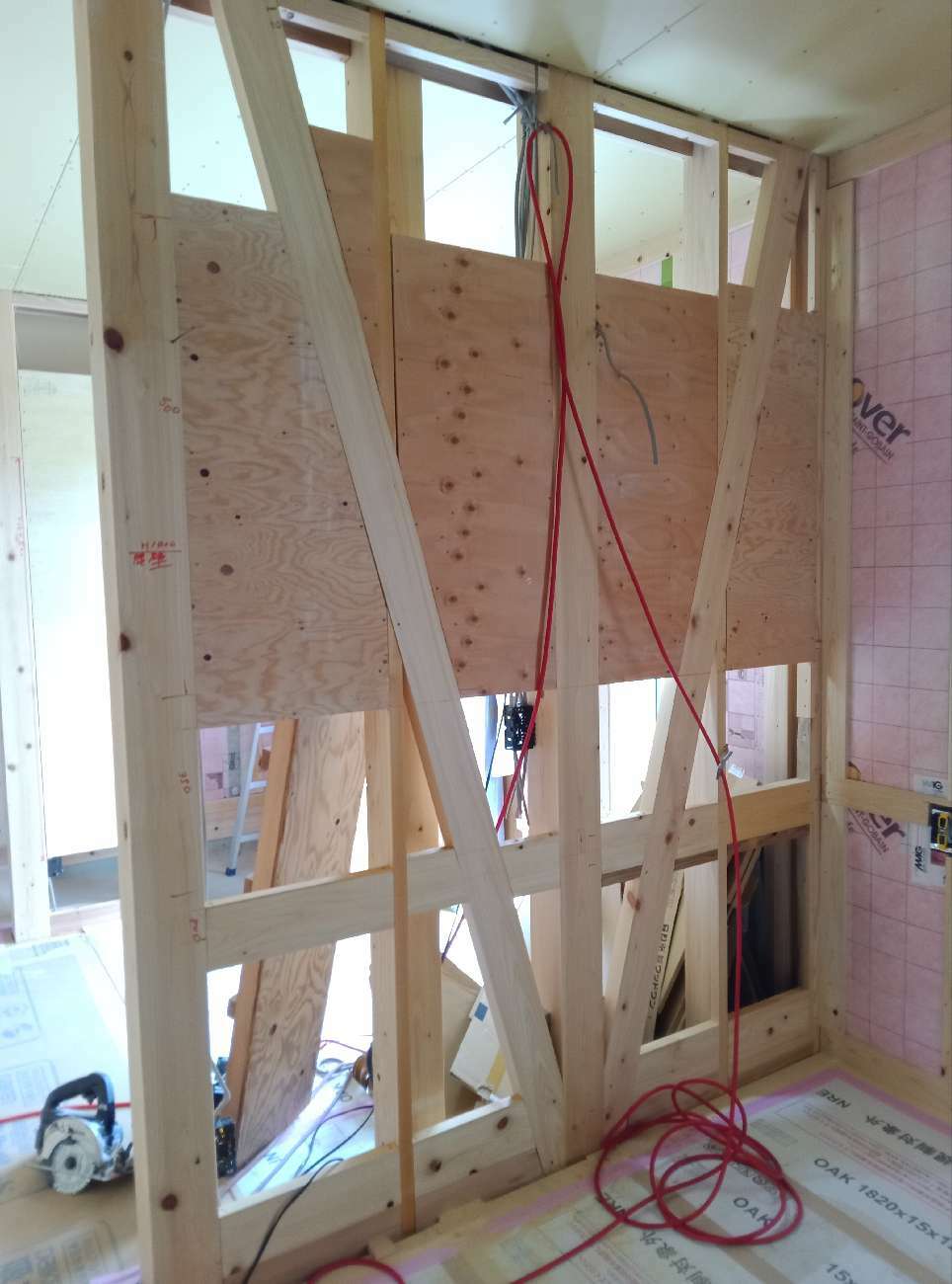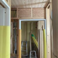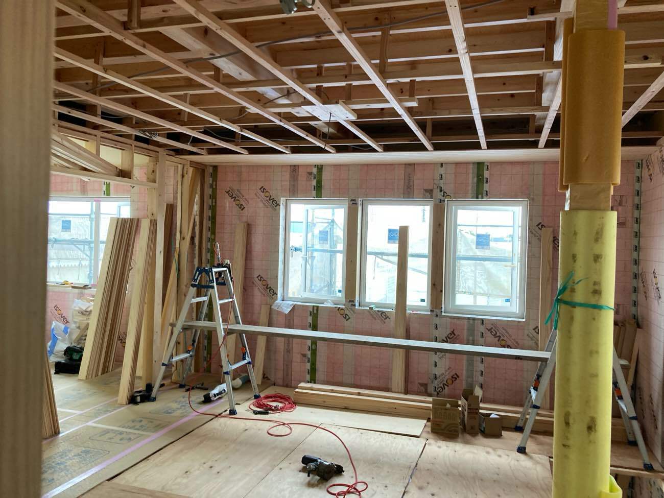 天井を張り終えて、壁の施工に入っています。階段や棚が取り付けられる部分に下地を入れている様子です。