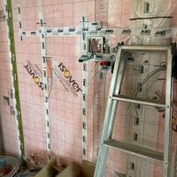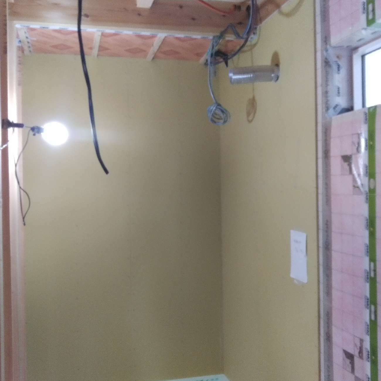 本日ユニットバスを施工していますので、その部分を先行してh場さんがダクトや配線工事を行い、h典棟梁が外壁面に石膏ボードを張り終えました。明後日現地に行かれるとユニットバスが取り付けられていますので、楽しいかも知れません。扉からそっと覗いてみてくださいね。
