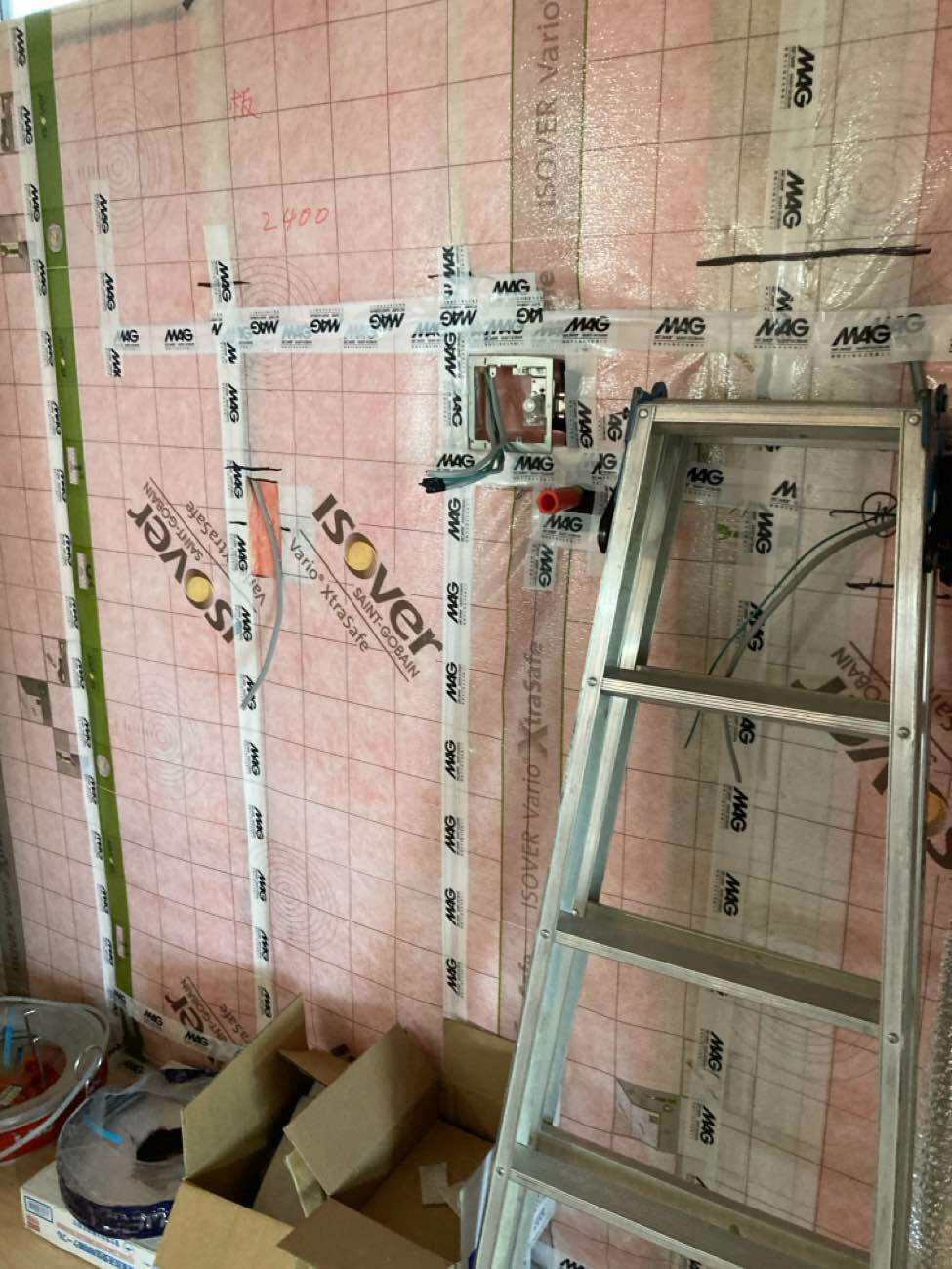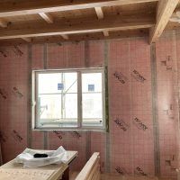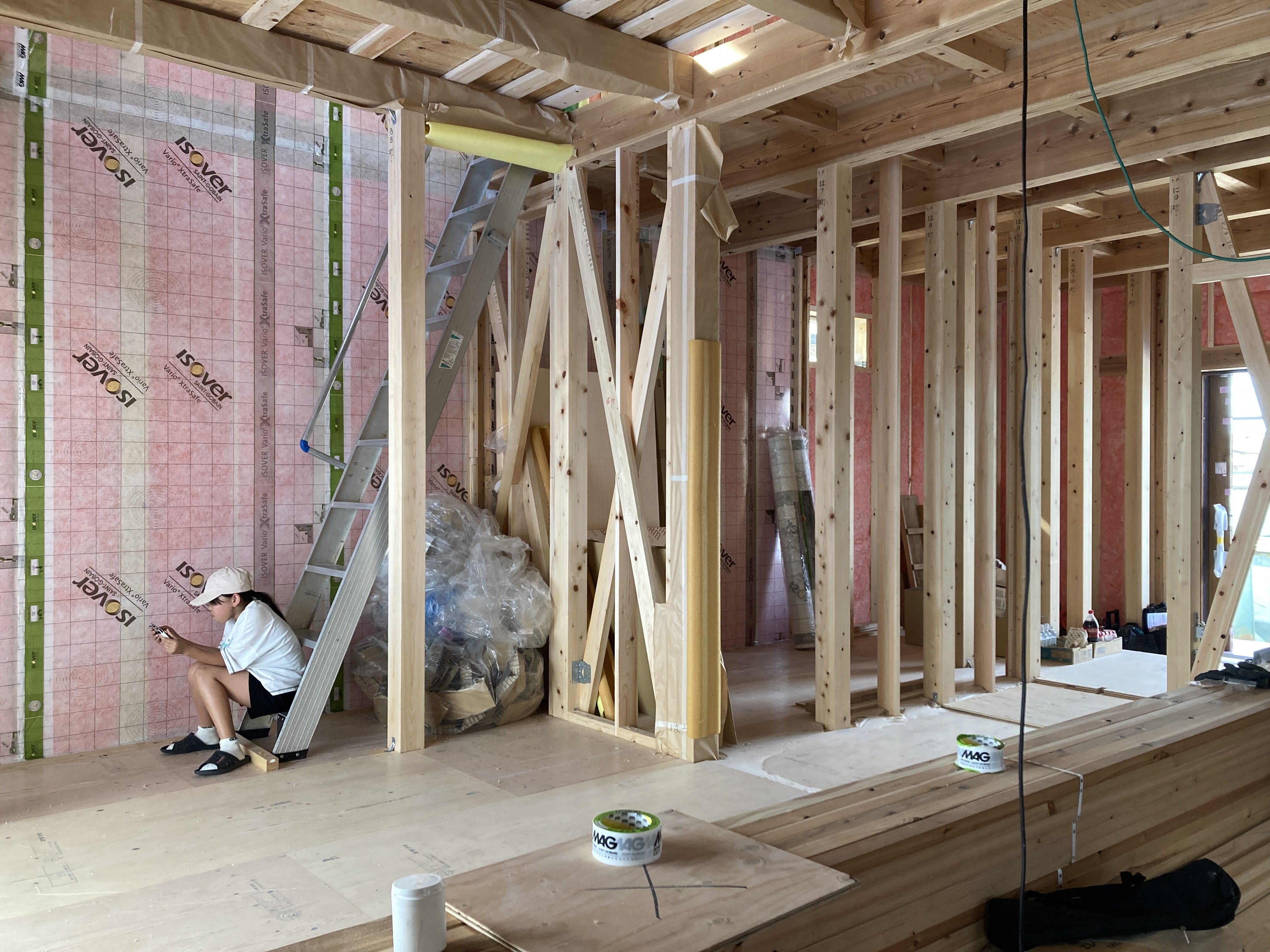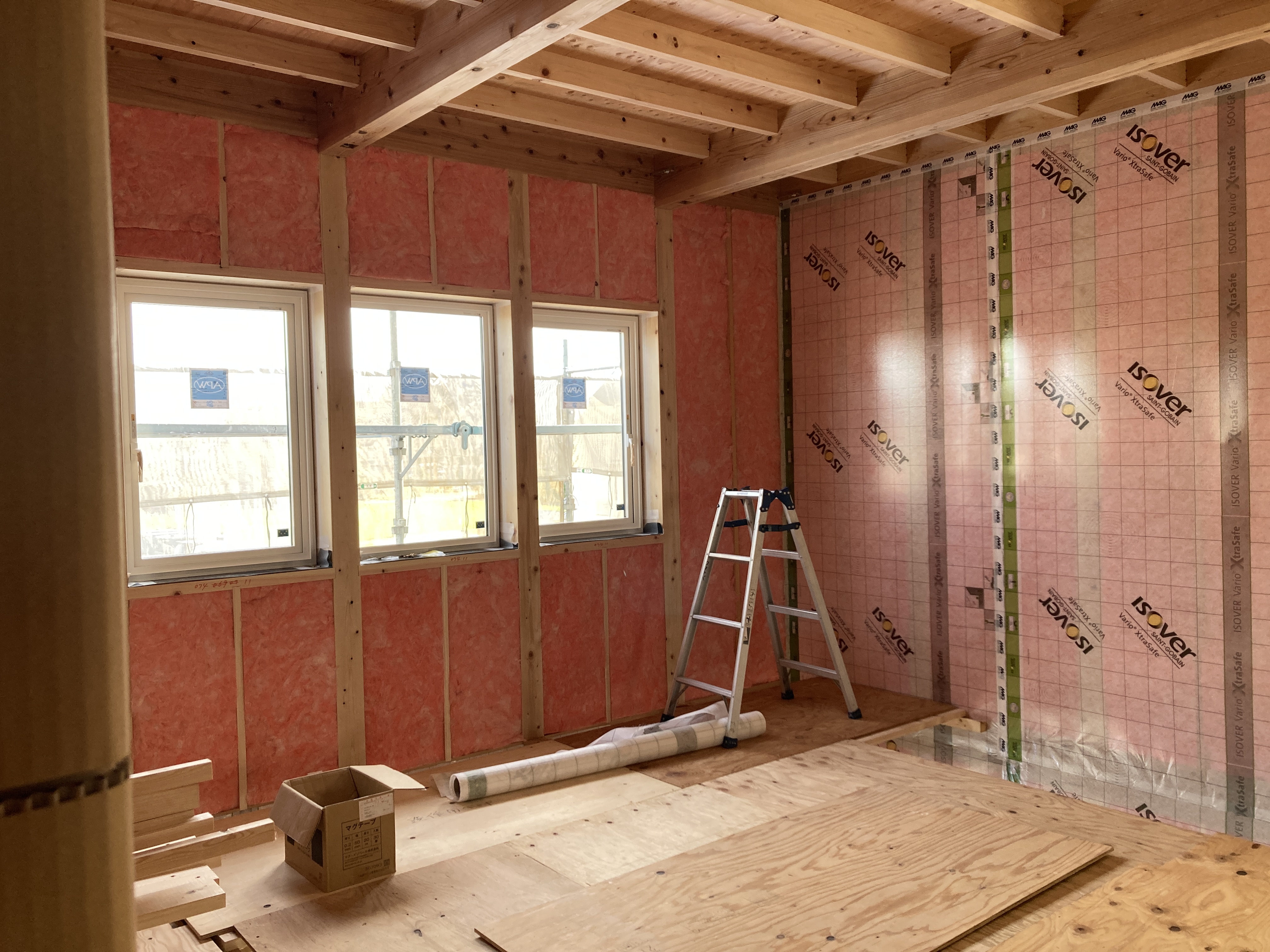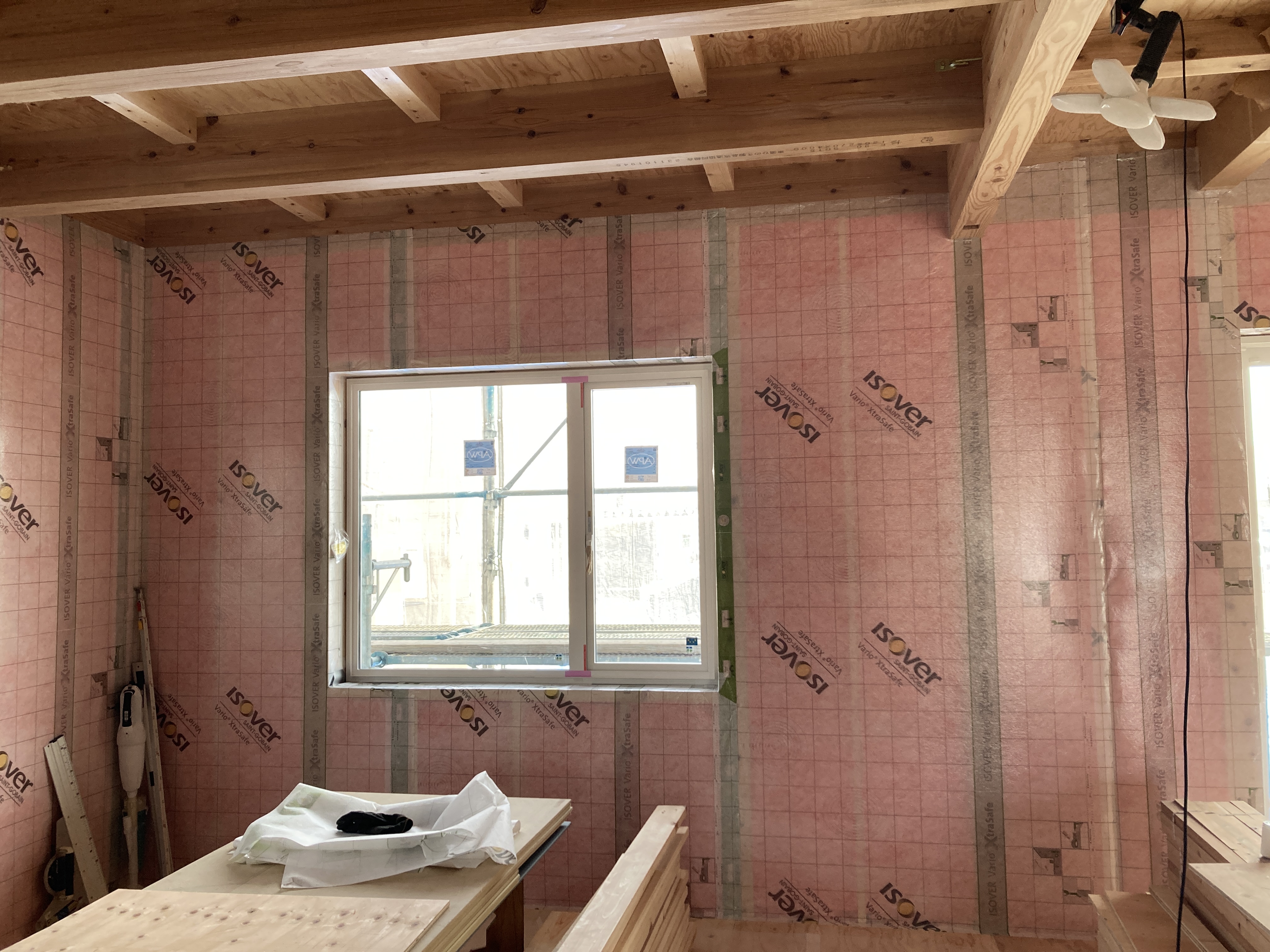 充填断熱が入れ終わり、可変性調湿気密シート張りを行っています。ぴったりきれいに張られています。以前はシートを横張りしていましたが、縦張りの方が柱や間柱のところにジョイントがくるので、施工性が良くきれいに張れるのでより良いと、k池大棟梁が気付いてくださいました👍流石!タッカーはテープでしっかり覆われますし、テープも下地があるのでしっかり押さえて貼れます。