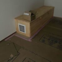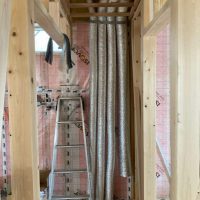 ユニットバスも設置され、電気配線工事と共に、24時間換気のダクト工事も進んでいます。熱交換換気扇『澄家』を採用されましたので、排気用ダクトが2階床下に配管されるので、1階にダクトスペースが必要になります。