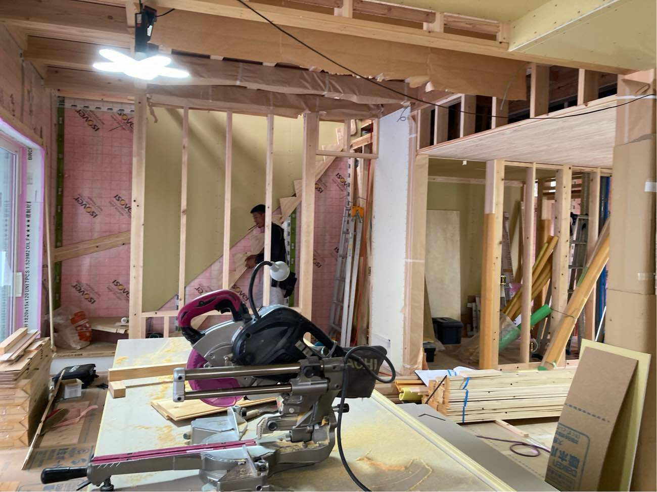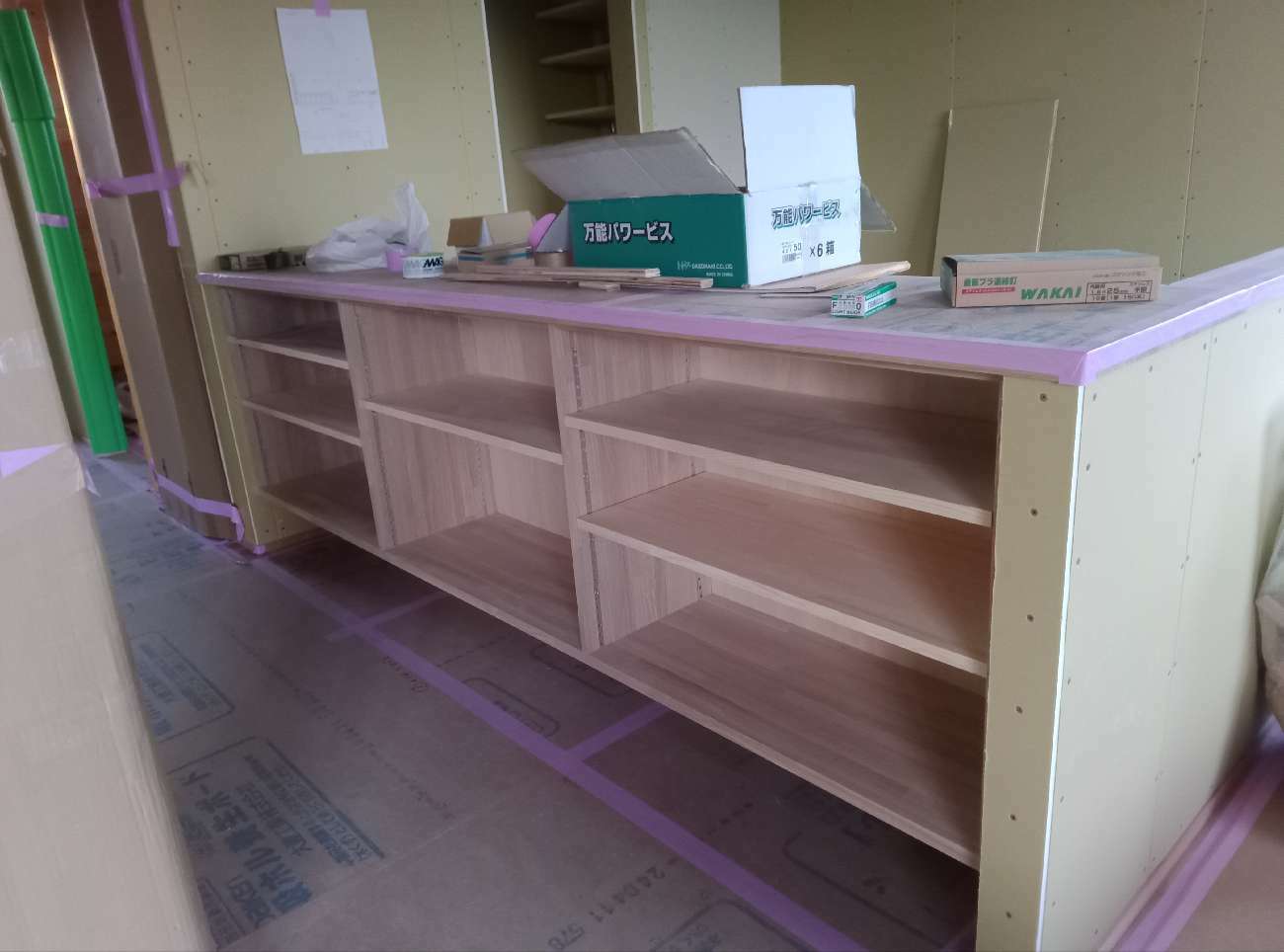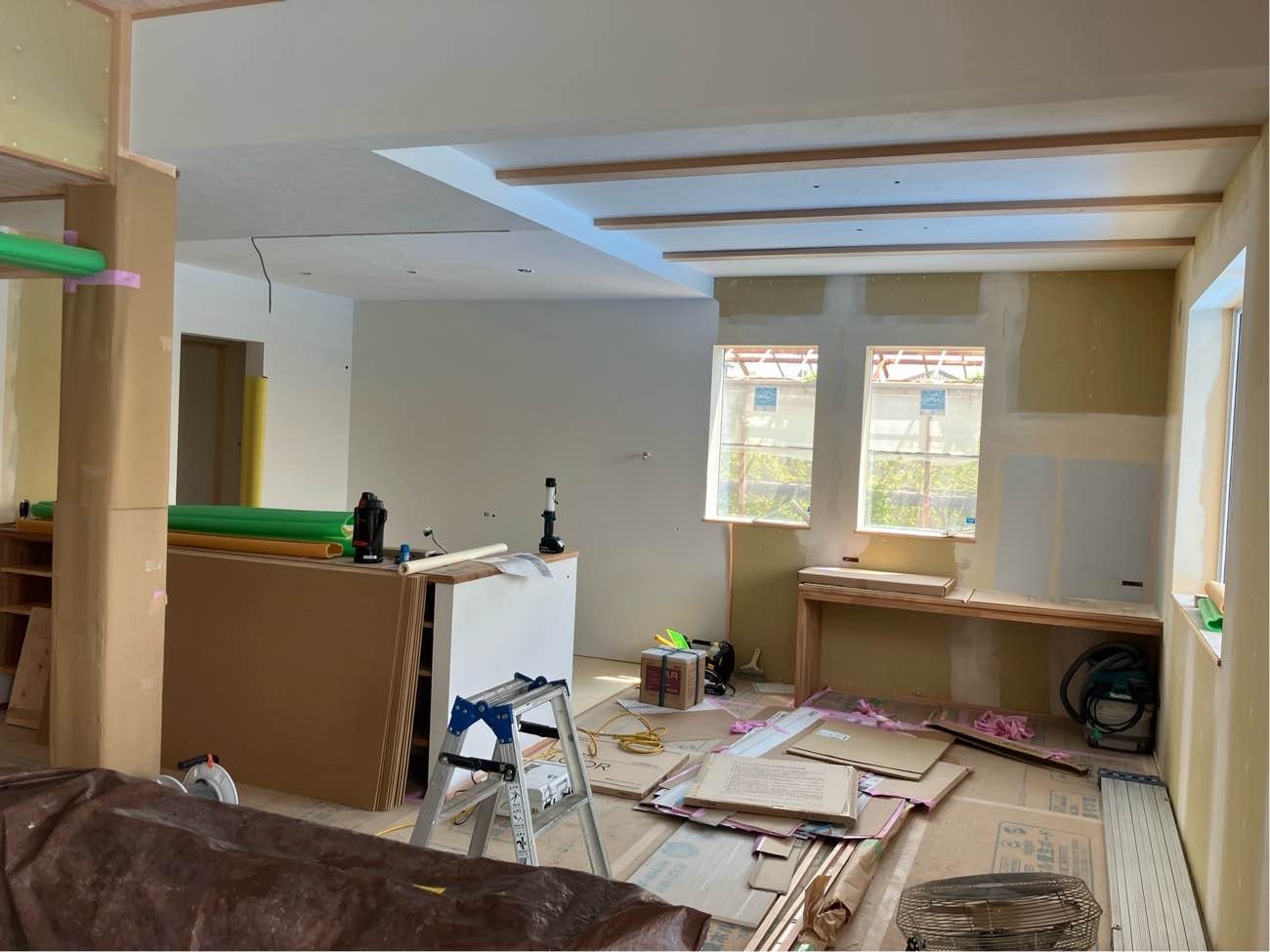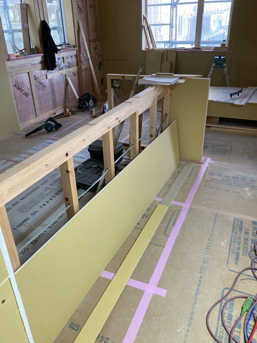 内部は、ドア枠やキッチン周りの造作収納カウンターなどの造作工事が急ピッチに進んでいます。