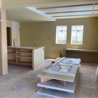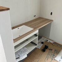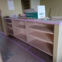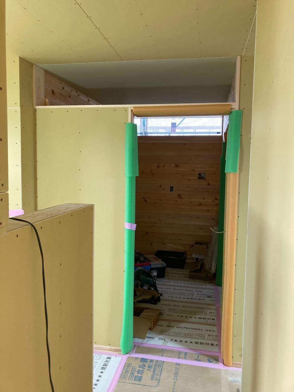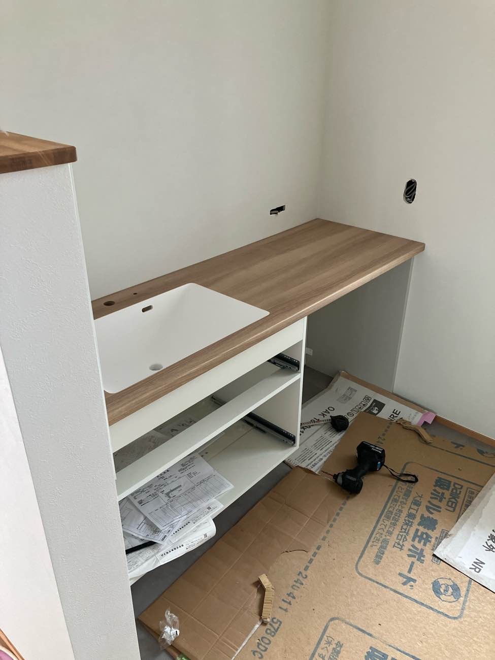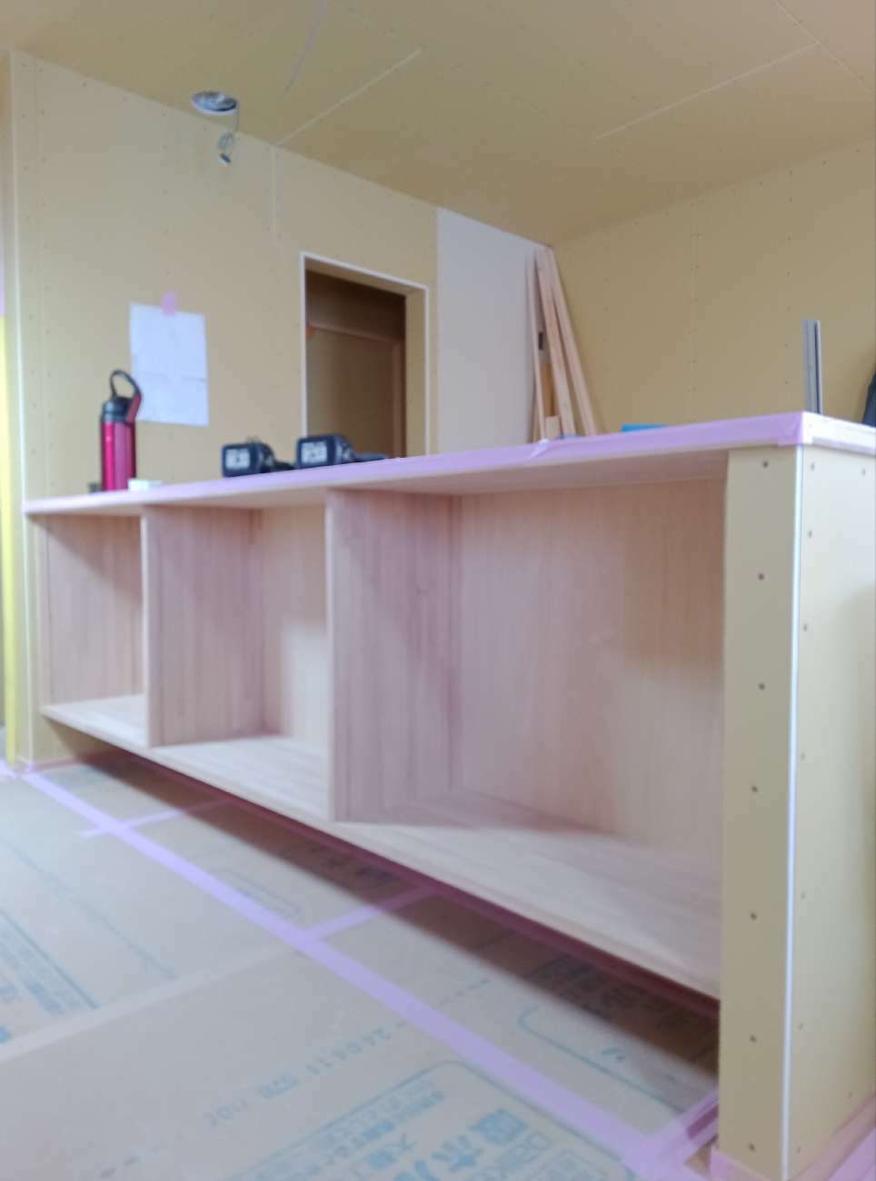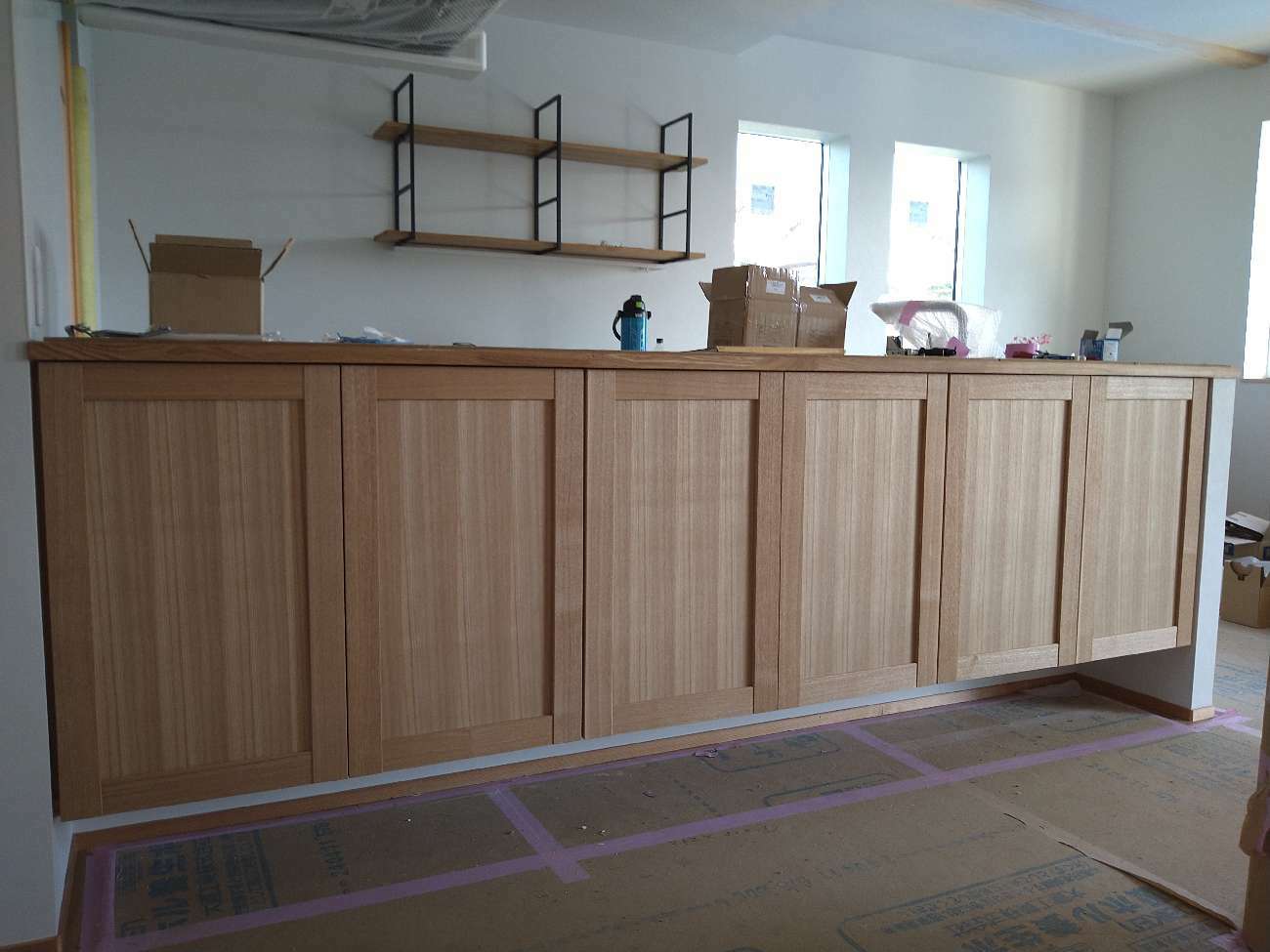 内部は、ドア枠やキッチン周りの造作収納カウンターなどの造作工事が急ピッチに進んでいます。