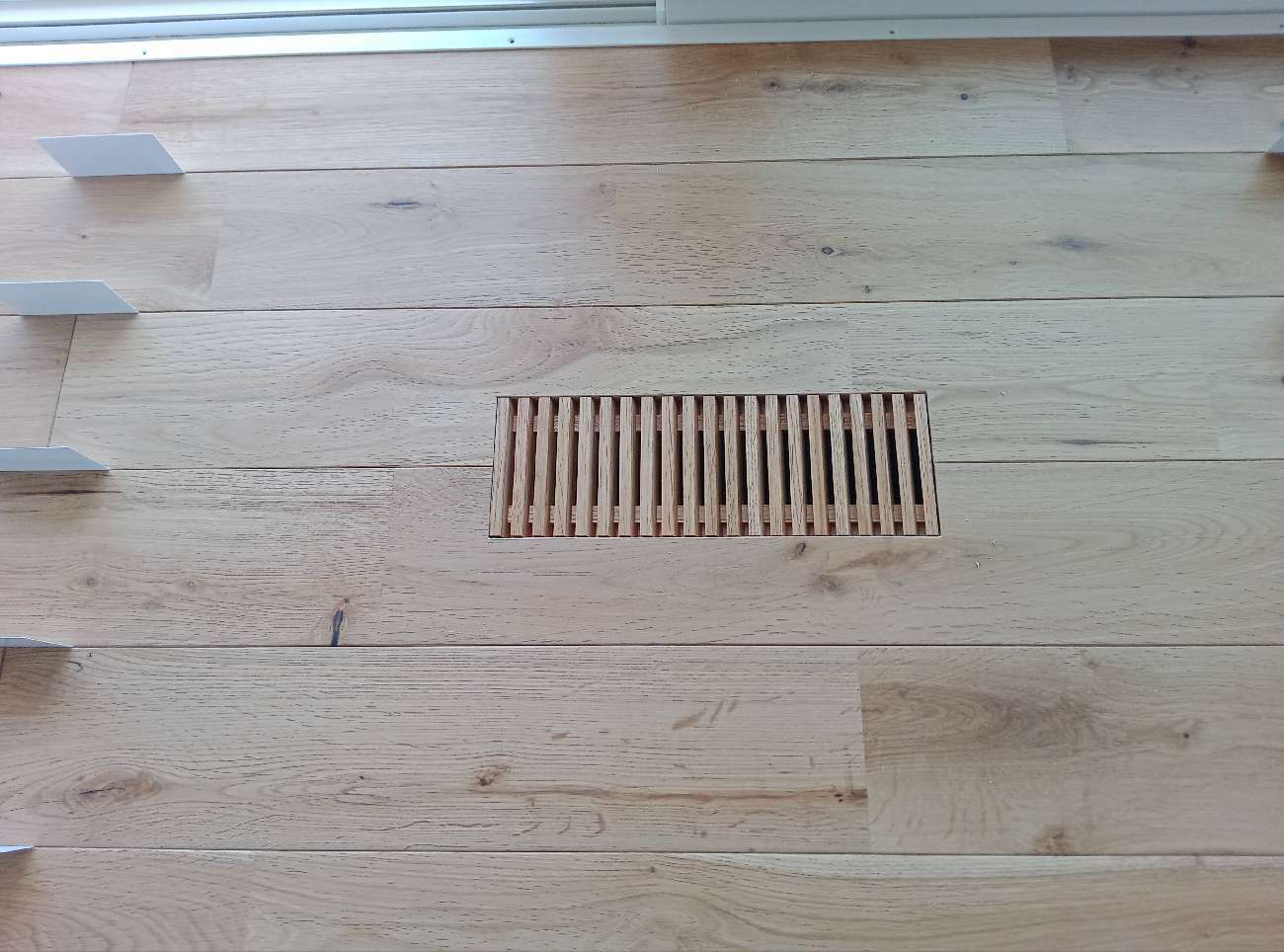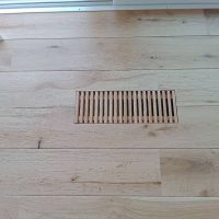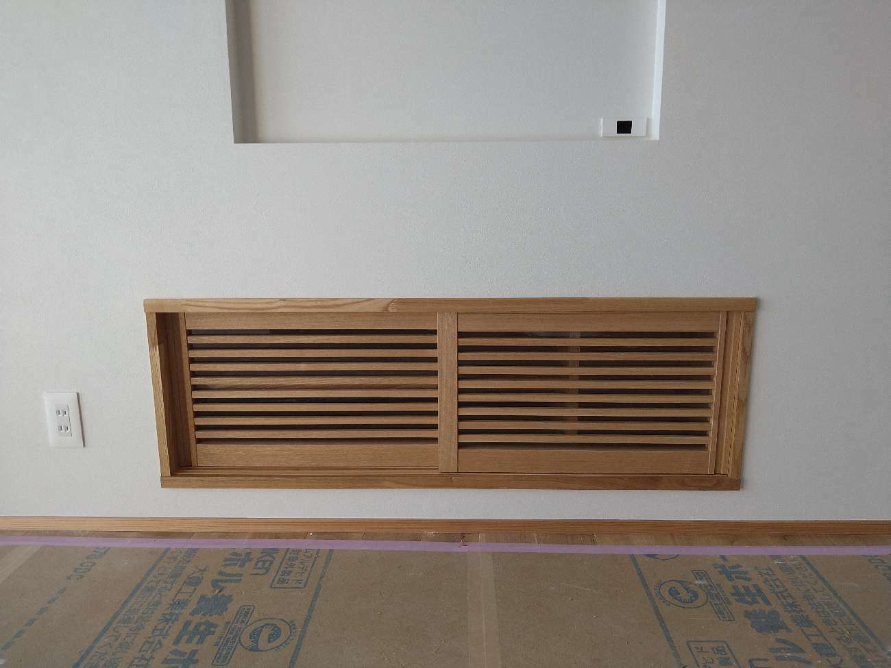 内部は、床張り工事も進んでいます。1階はナラフローリング、2階はカバフローリングです。ナラフローリングに合わせて、今回は24時間換気の給気口を換気メーカーのガラリにされました。無垢のフローリングなので切口(小口)が見えても良い為、ガラリに合わせて枠を入れずにすっきりした納まりにしています👍