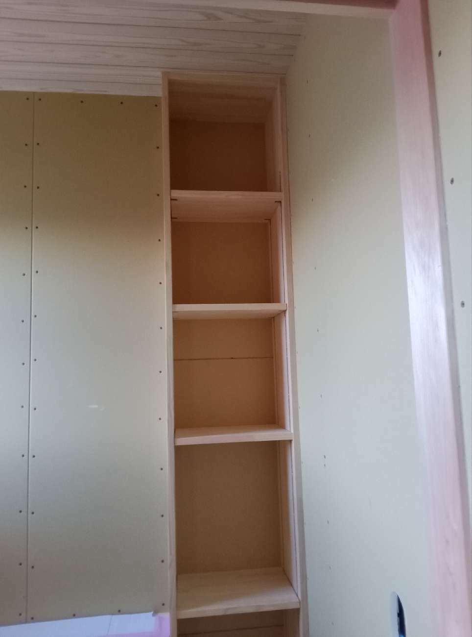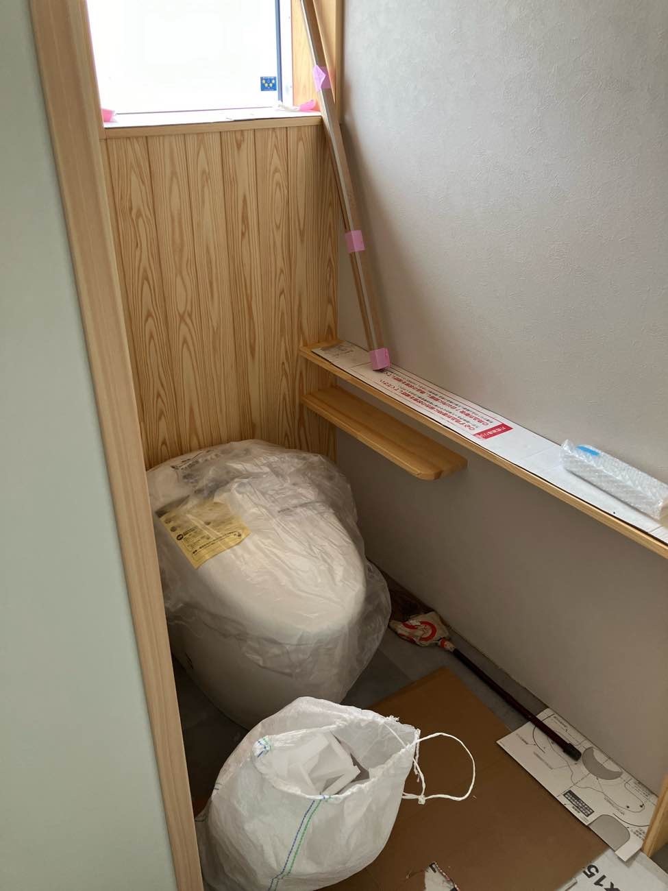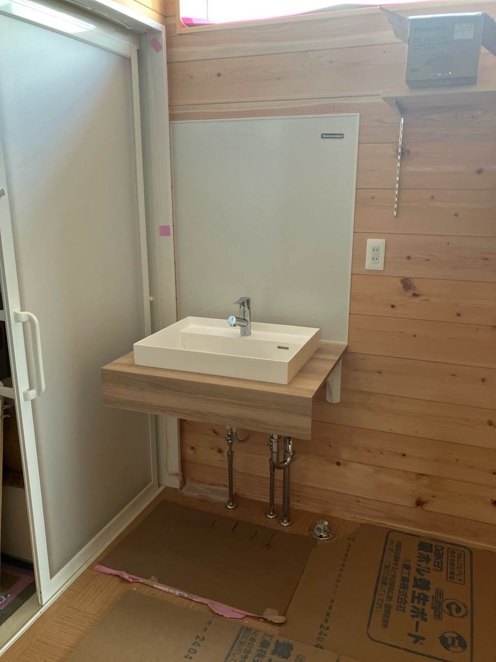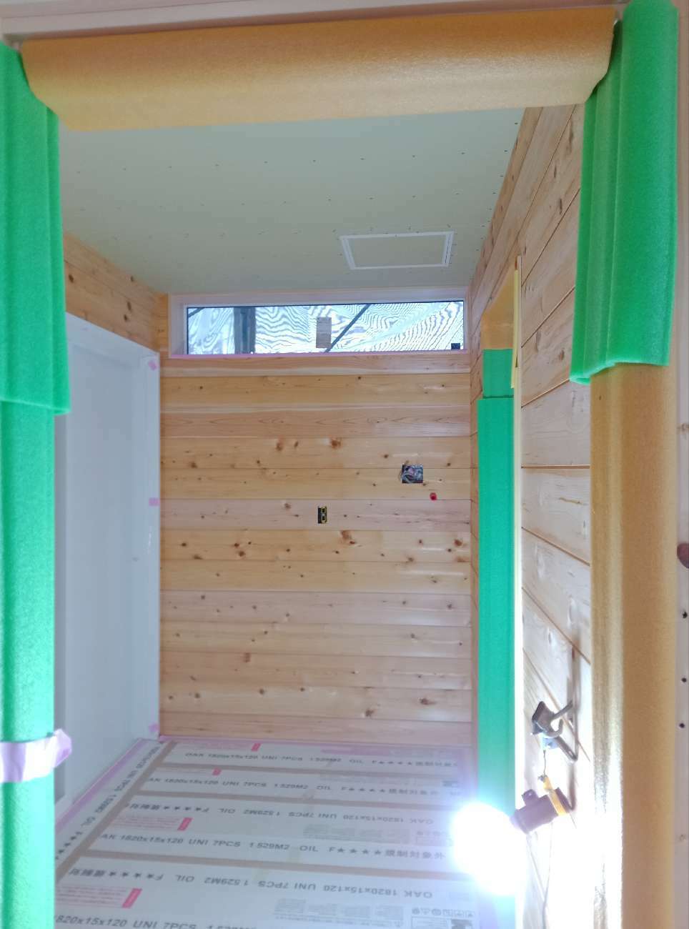 脱衣室の壁は、サワラ材を張り終えています。トイレにはカウンターと小物置きが取り付けられ、背面と天井に杉の羽目板が施されました👍
