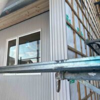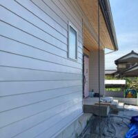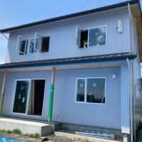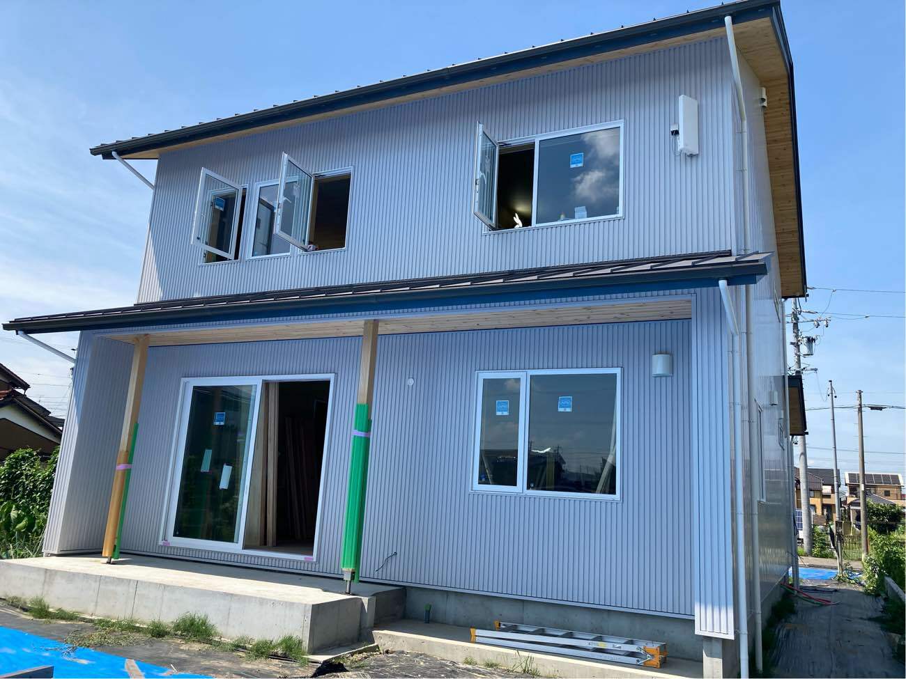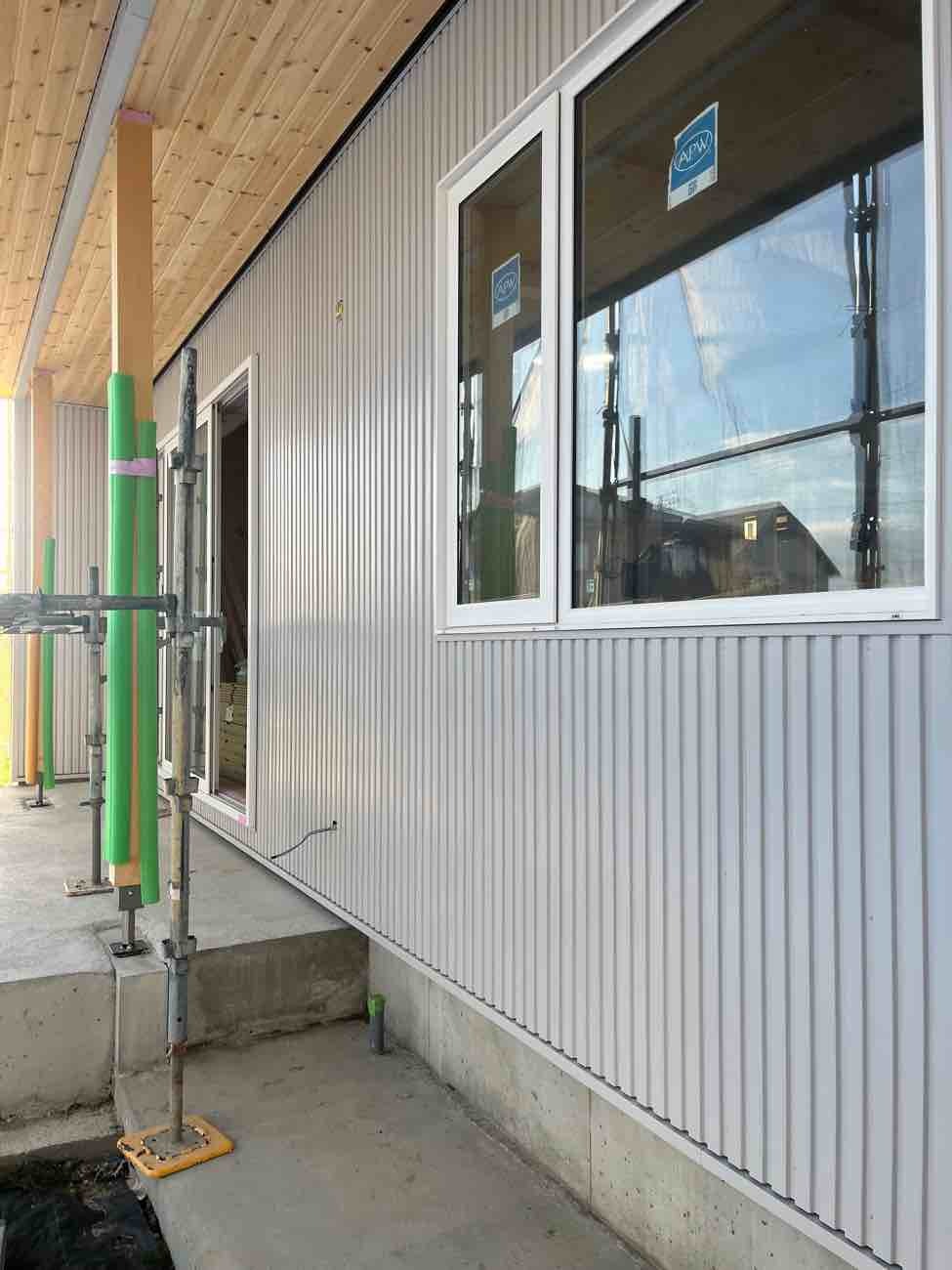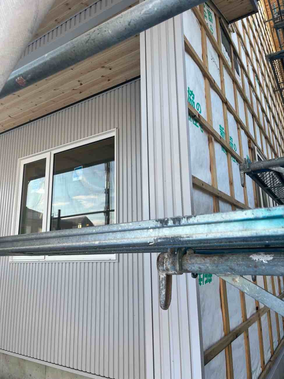 道路正面は横張り、そのほかの面は角波8山です。色は、白に近い薄いグレー。y様邸は、西隣が畑で広い外壁面に西日が当たるので、車と一緒で白い方が熱を吸収しないのでいいですね👍洋服でも、真夏に黒で出かけるとしまった!って途中で思いますもんね💦