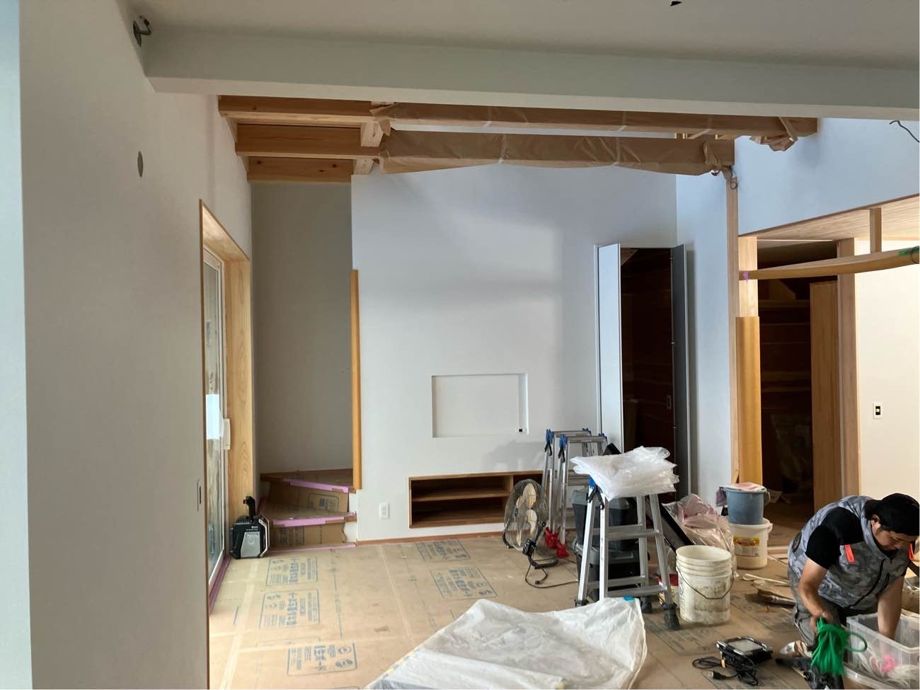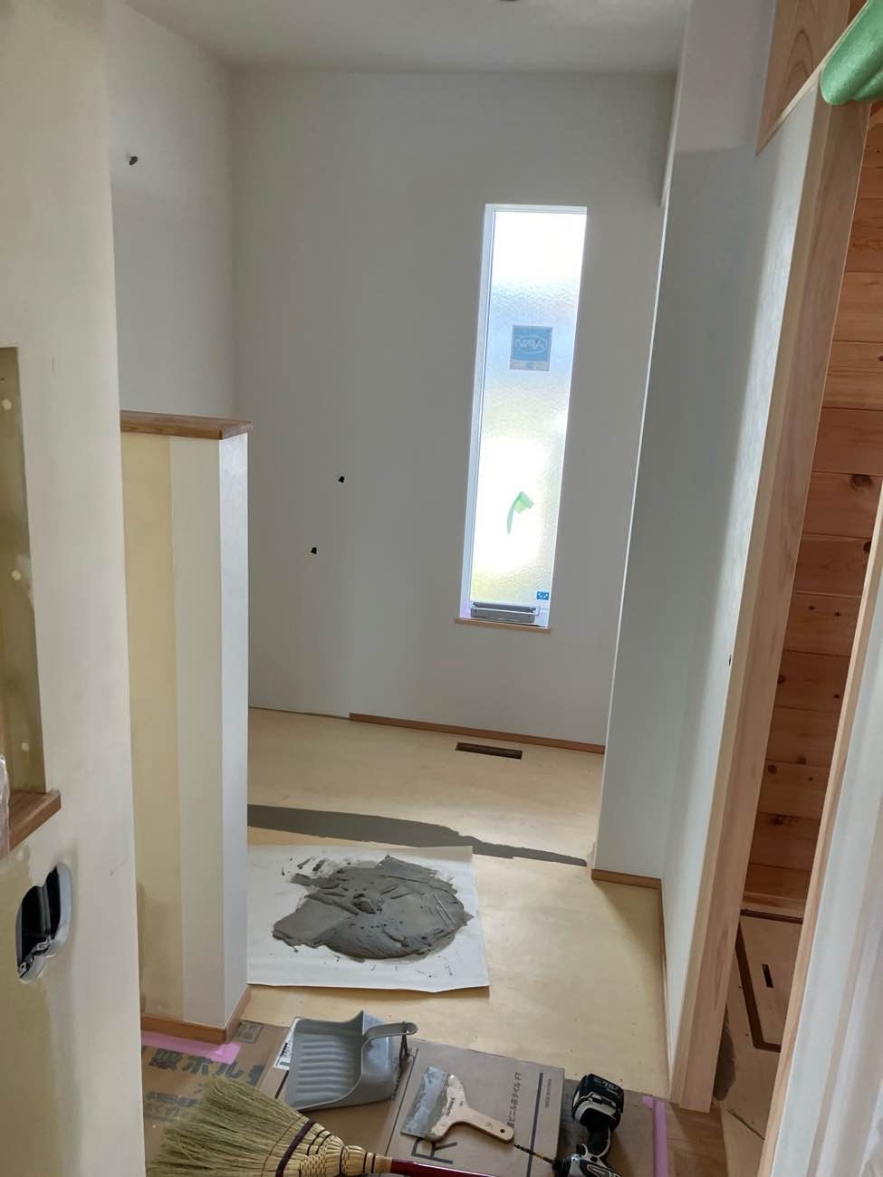 2階は、クロスのパテ処理を行ってクロスを貼っています。完成に向けて粛々と内装屋のs美さんが頑張っています。あとちょっと!9月21~23日にy様のご厚意により見学会を開催させていただく事になりました。また近々ご案内をHPに掲載させていただきます。出来上がりが楽しみですね。y様ありがとうございます!