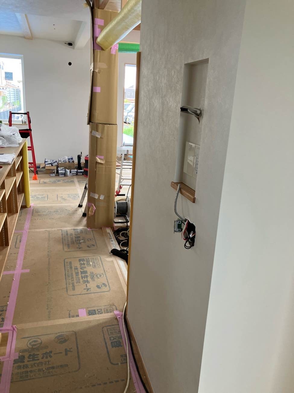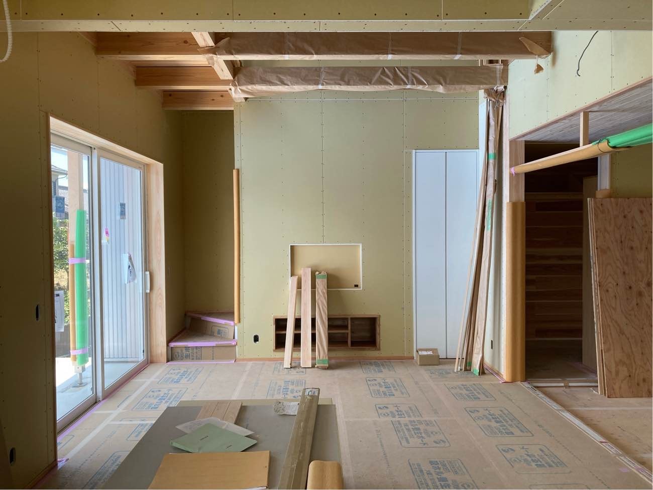 木工事(大工工事)がほとんど終わり、わずかな残工事がある程度になりました。これから、仕上げ工事へ。クロス屋さんや左官屋さんにバトンタッチしてきます。仕上げが行われると、再び電気屋さんや水道屋さんなど、各種設備機器の取付に入れ替わり立ち代わり業者さんが入ってきます。仕上げがまだなので、完成までまだまだかなぁ~と思えますが、大工さんの工事が終わると案外あっと言う間に完成とお引渡し日がやってきます。y様邸も、完成日がすぐそこまでやってきています!