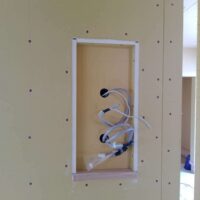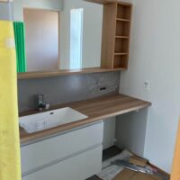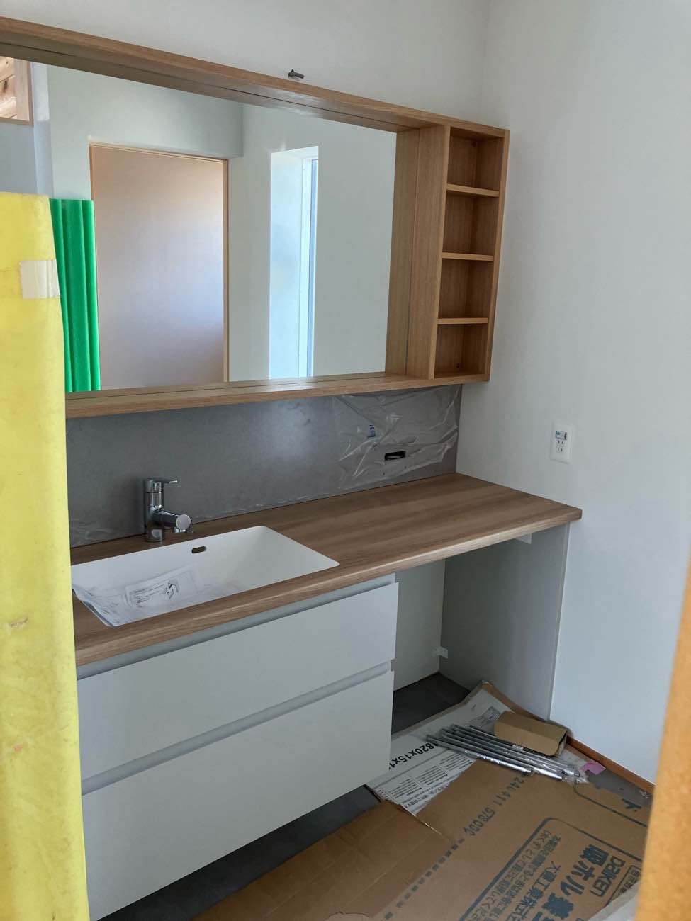洗面化粧台の鏡が取り付けられる部分にも下地を施しています。留めるビスの位置がいろんな場所にある場合は合板を入れておきます。