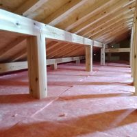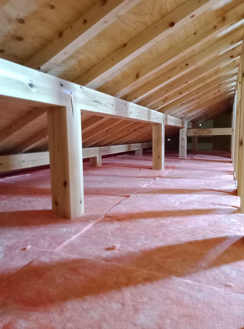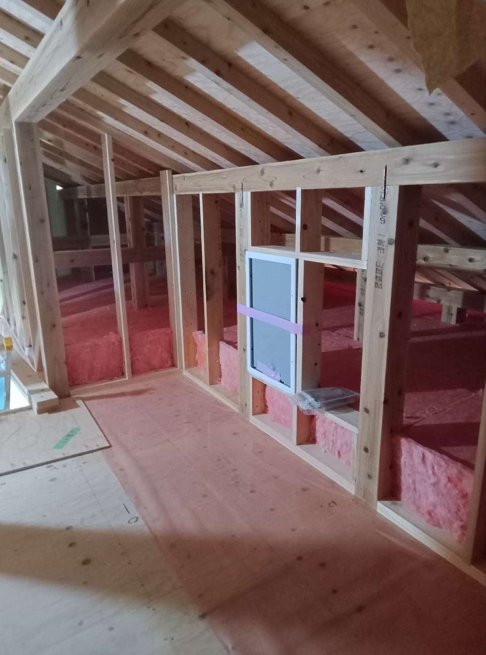 小屋裏の断熱材が敷き詰められました。天井断熱の部類になりますが、本当の天井はこの合板の下に造られます。