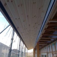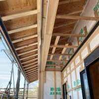 電気配線やダクト工事が進み、棟梁達は外部の通気胴縁や外壁下地材、軒裏のパイン羽目板張りを行っています。