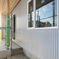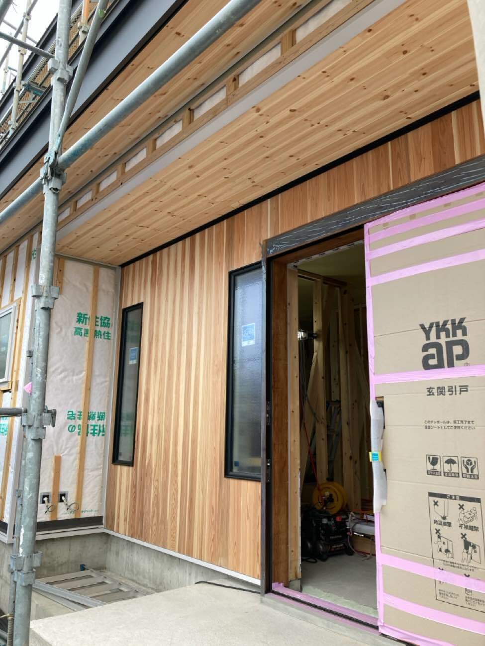 外壁に杉の板が張られました。玄関廻りだけポイントに張っています。