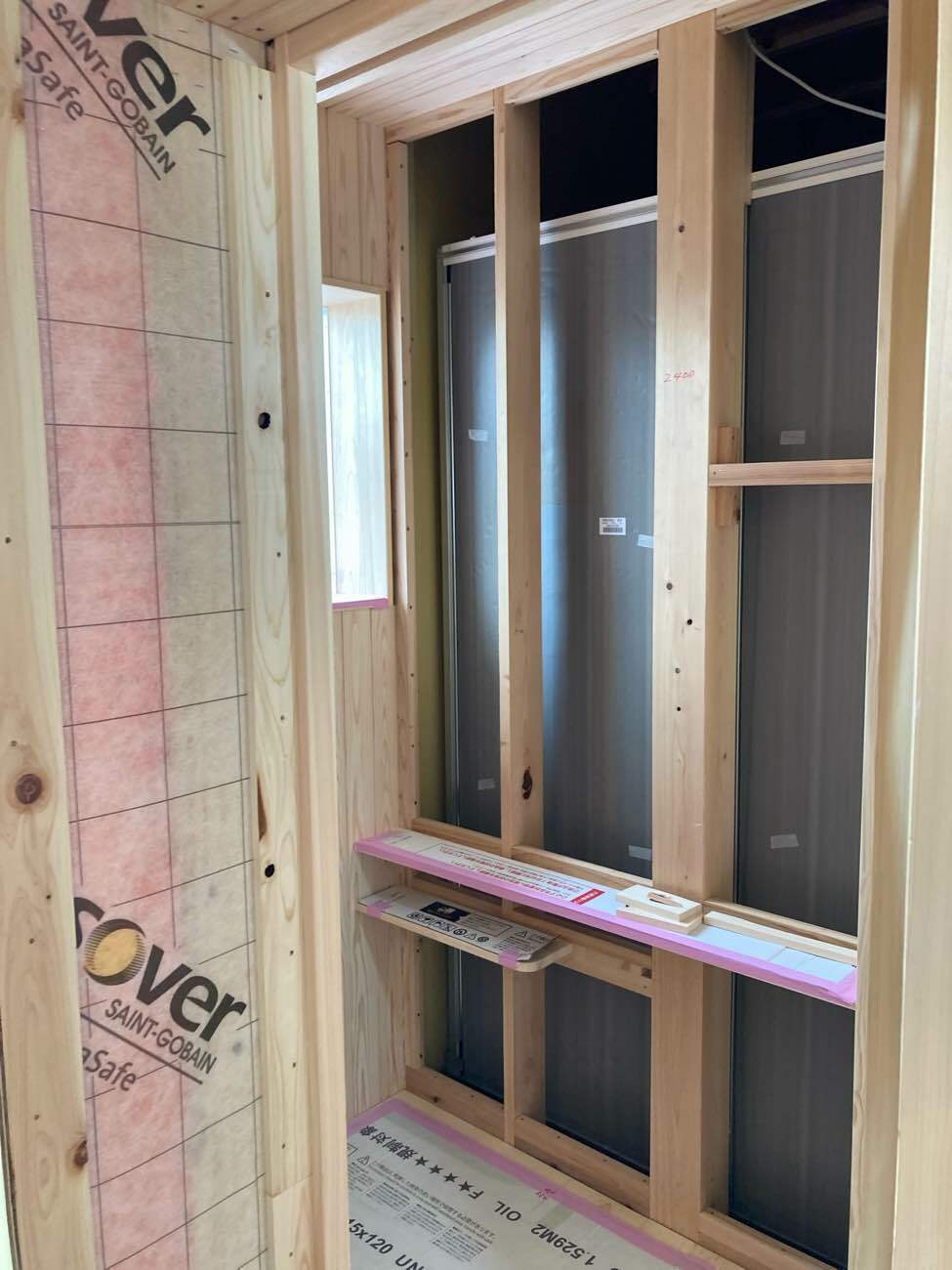 内部の充填断熱入れも進んでいます。柱と間柱間に隙間なくきれいに入れられています👍高性能グラスウールは弾力性があるで、地震などで一旦変形しても、もとに戻ってくれるそうです。