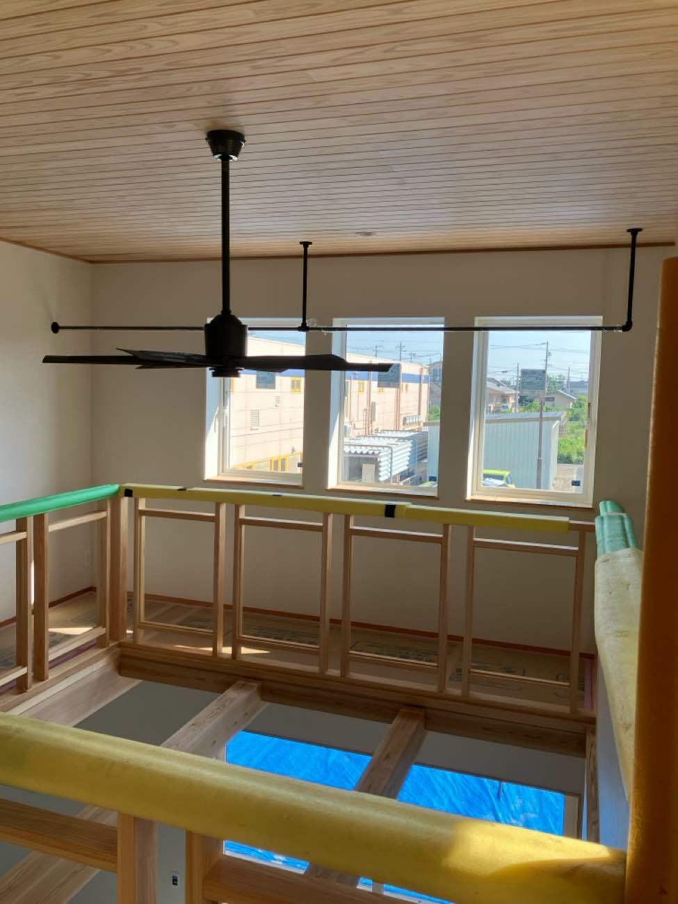 並行して、空調設備、電気設備の取付も進んでいます。24時間換気扇は『澄家』。小屋裏収納を設け、エコエア―システムも採用しています。エコエアーは、温度センサーによって、小屋裏に集まった暑い(暖かい)空気を、床下に送り込み冷たい空気を引き上げ、室内の空気を循環させるシステムです。上下階の温度ムラが少なくなり、快適性がUPします👍