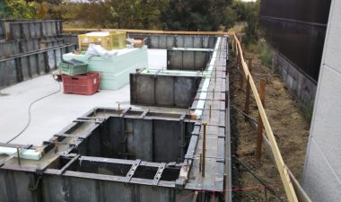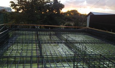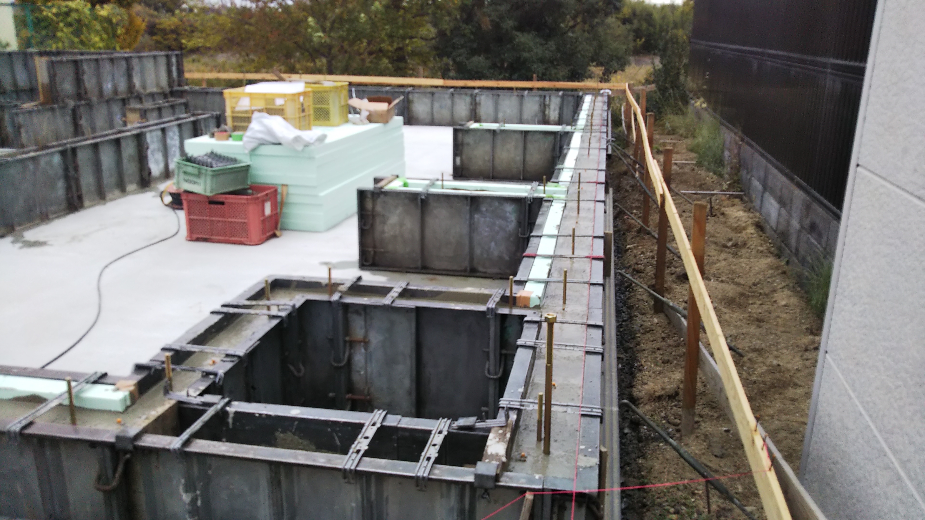 コンクリートの立上り部分の型枠を組む前に、設備業者による配管孔スリーブ設置と、鉄工業者による採寸を行いました。コンクリートを打設してしまうと、見えなくなってしまう部分なので、精密に寸法を測って作業を進めていきます。