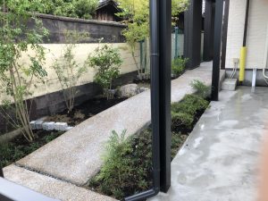 アプローチは豆砂利洗出し仕上のスロープです。自転車等も奥へ持っていくのに階段状とはせず、押して歩けるように勾配を付けました。軽く曲線を描いた通路の両脇に植栽を施します。