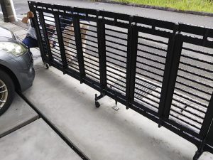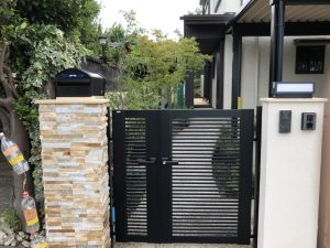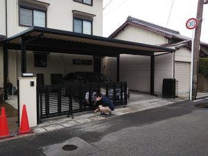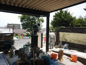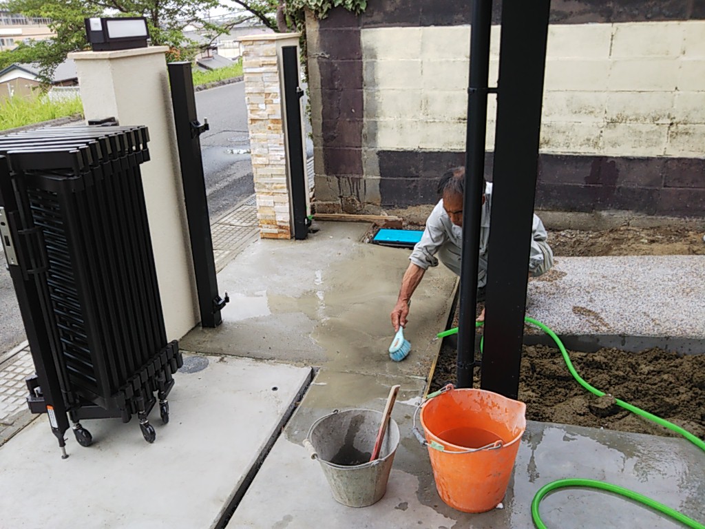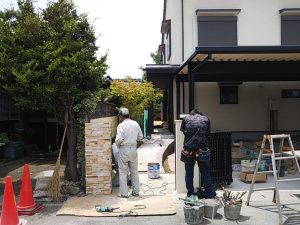 外構工事もだいぶ出来上がってきました。梅雨の合間を狙った日程、今日は外構業者さん、外構の門に照明を取付ける電気業者さん、カーゲートを取付けるアルミ業者さんが入り乱れての作業となります。