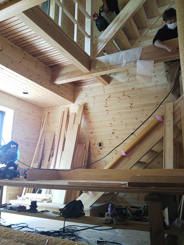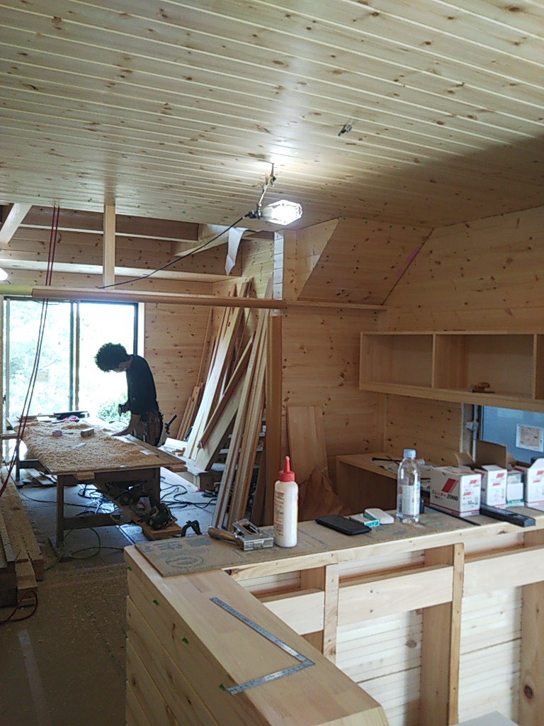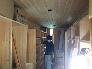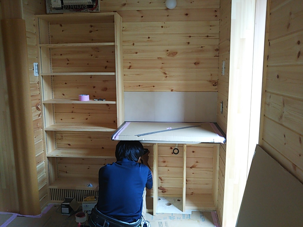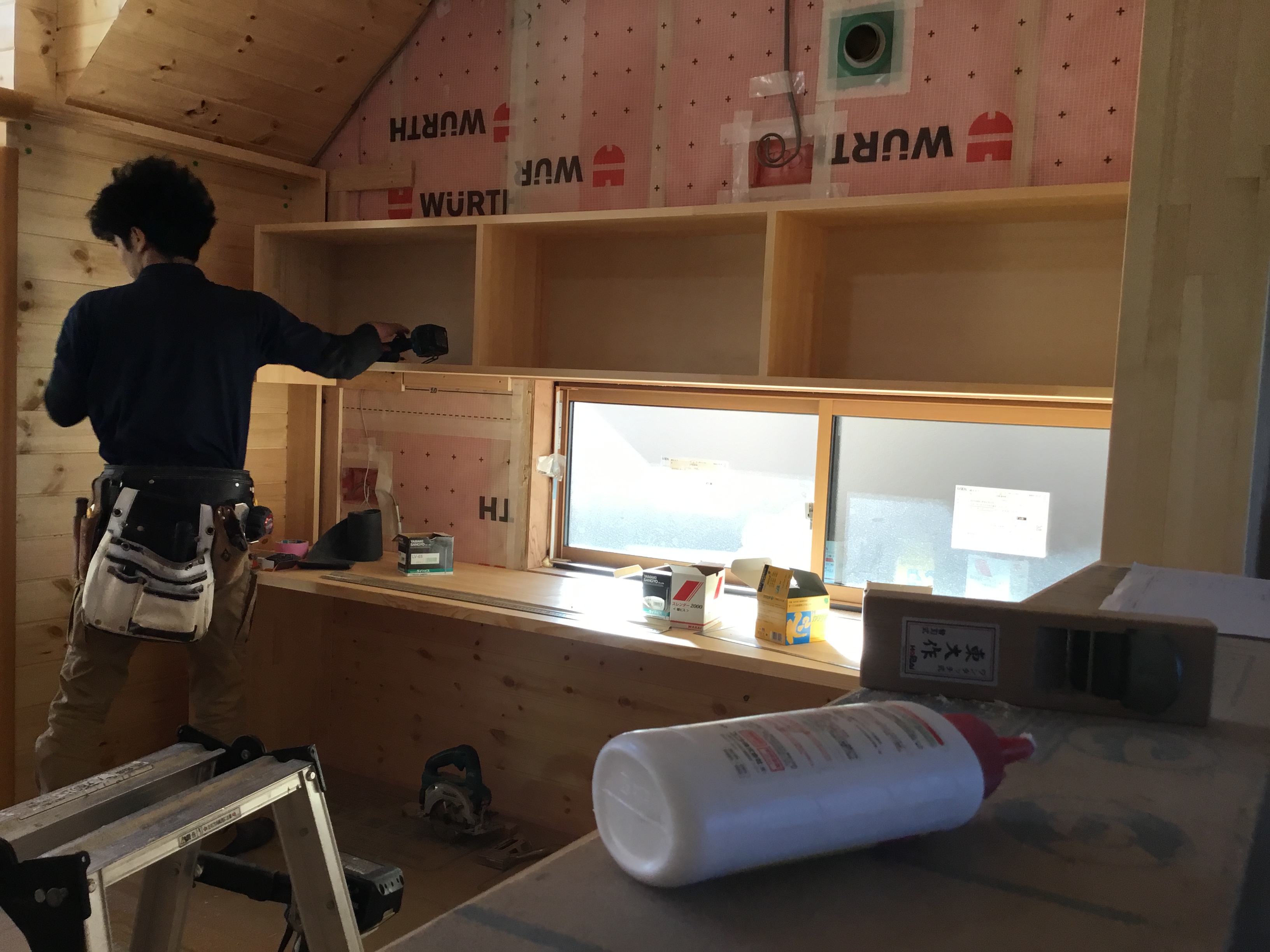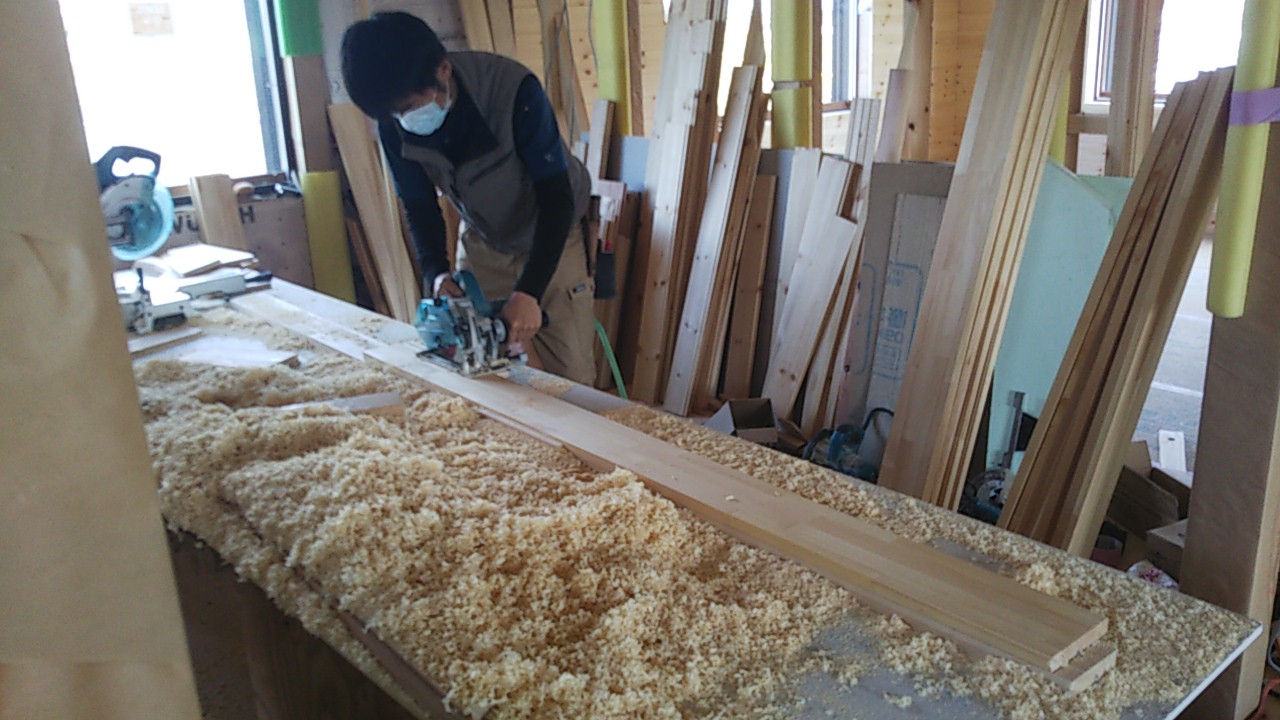 応援のH谷川君にはひたすら棚板の加工をしてもらっています。2人とも造作工事もあとひと踏ん張り。