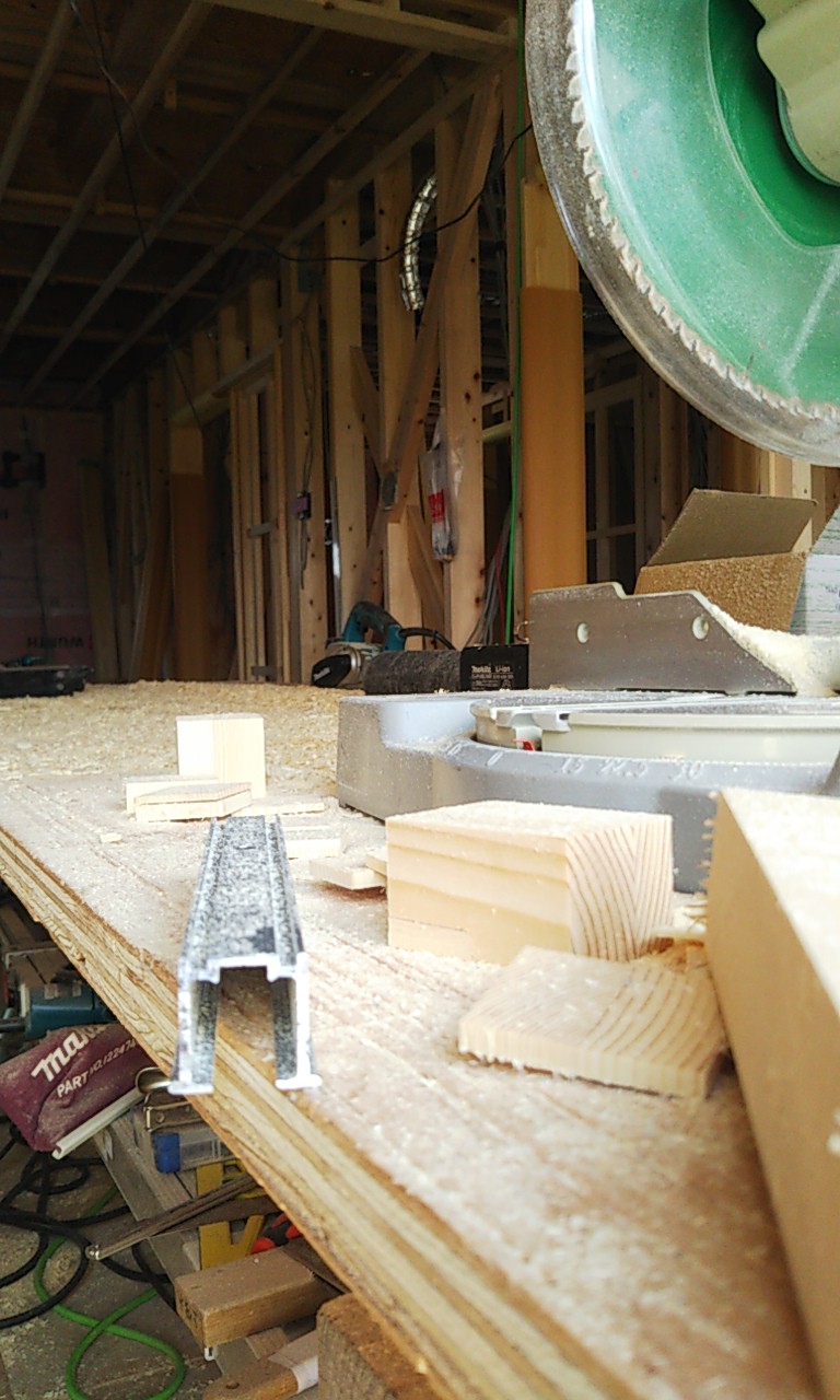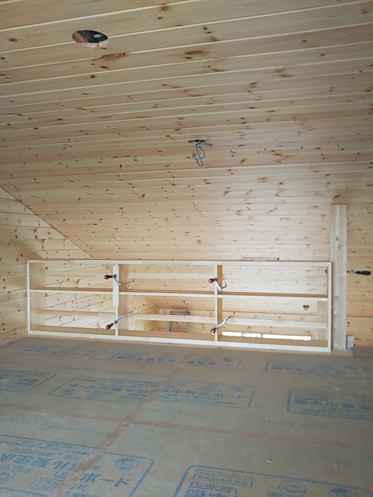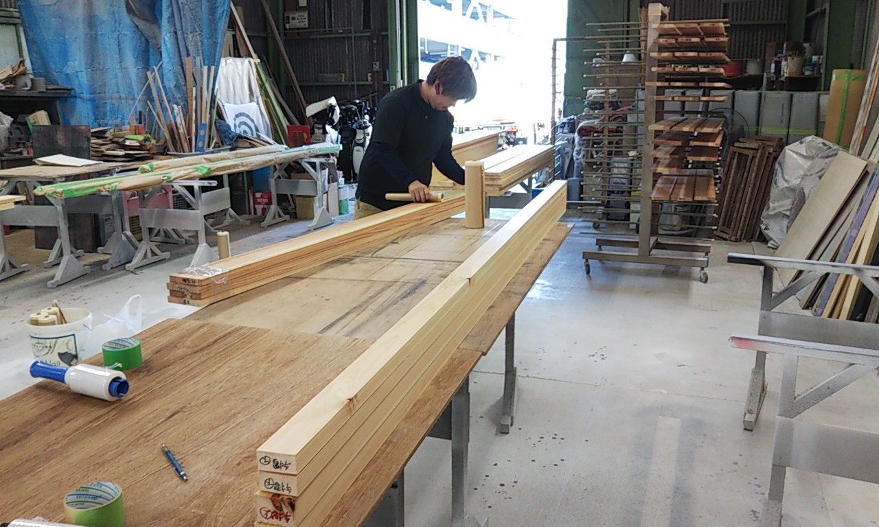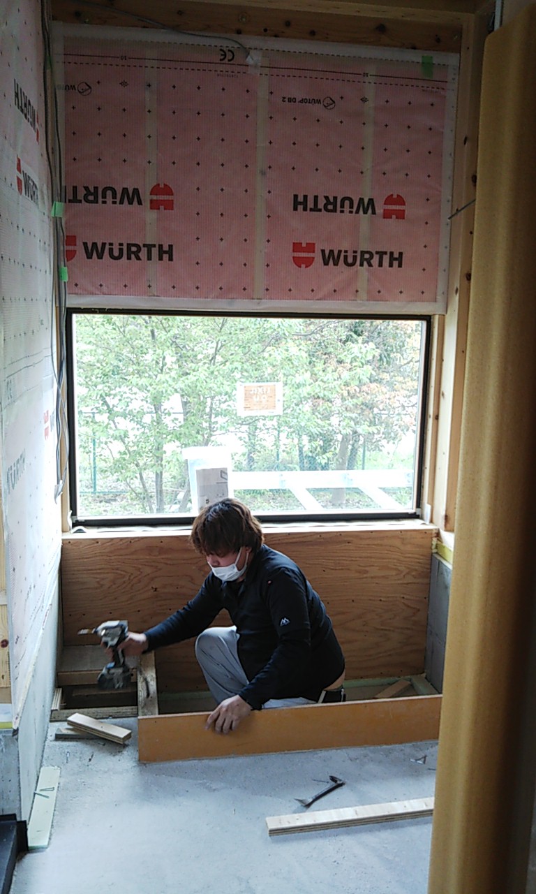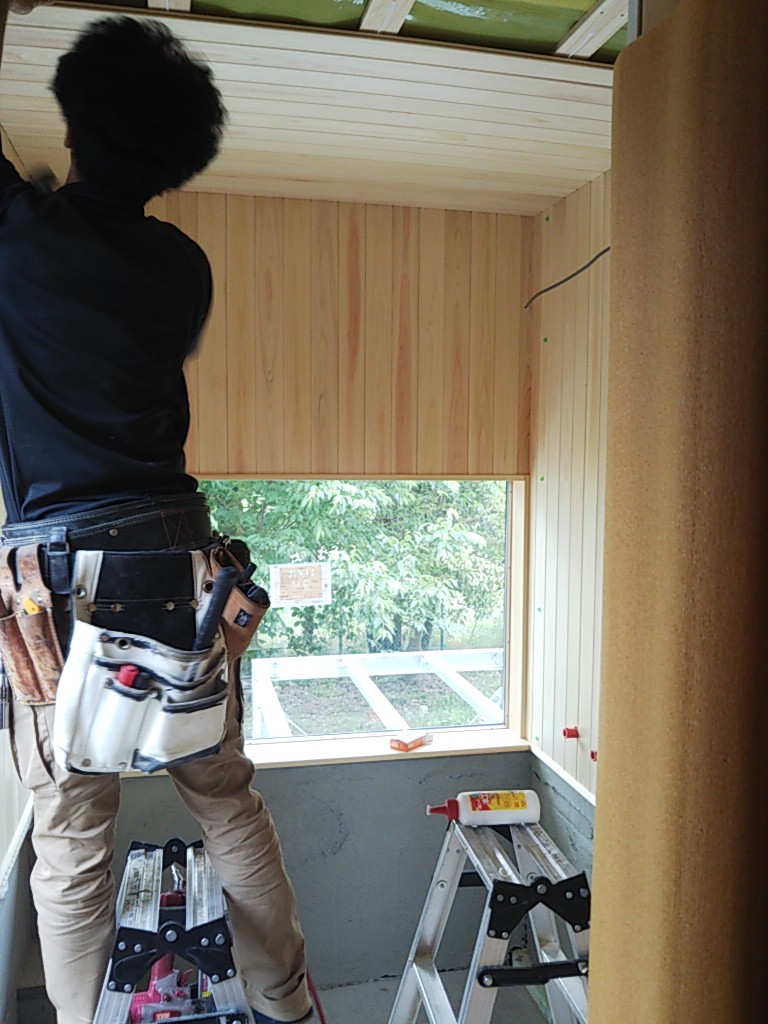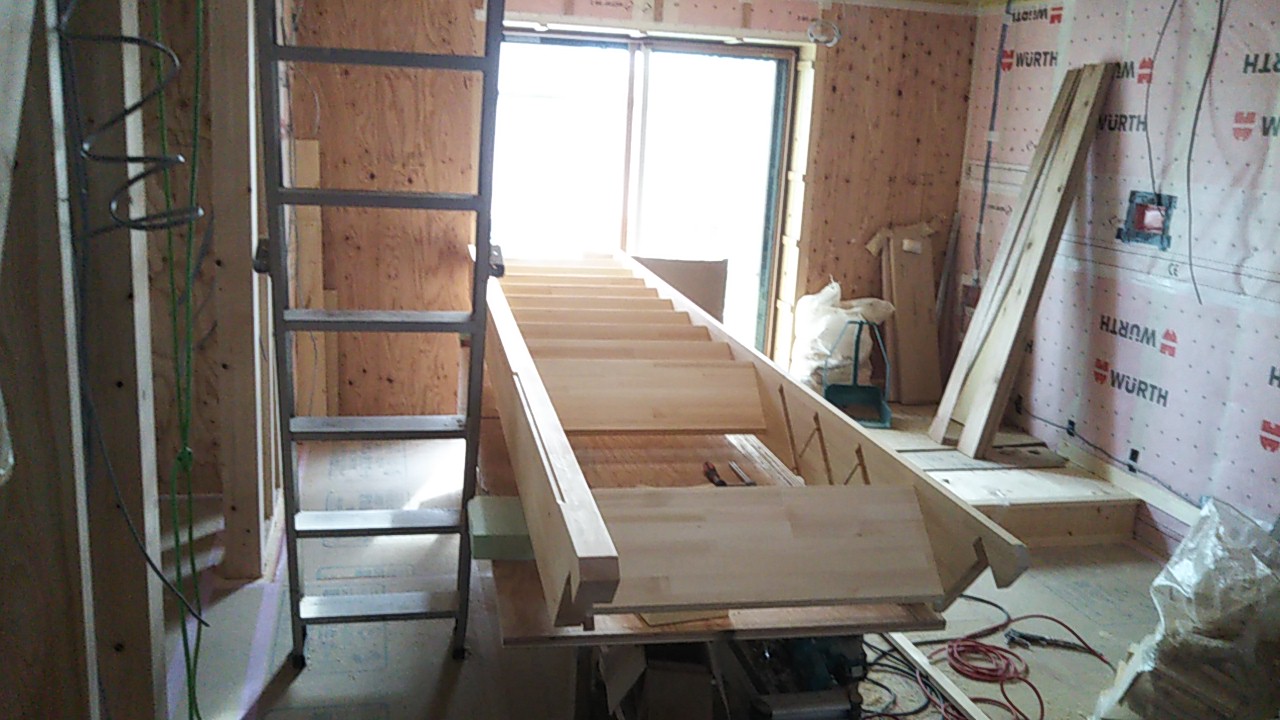 応援のH谷川君にはひたすら棚板の加工をしてもらっています。2人とも造作工事もあとひと踏ん張り。