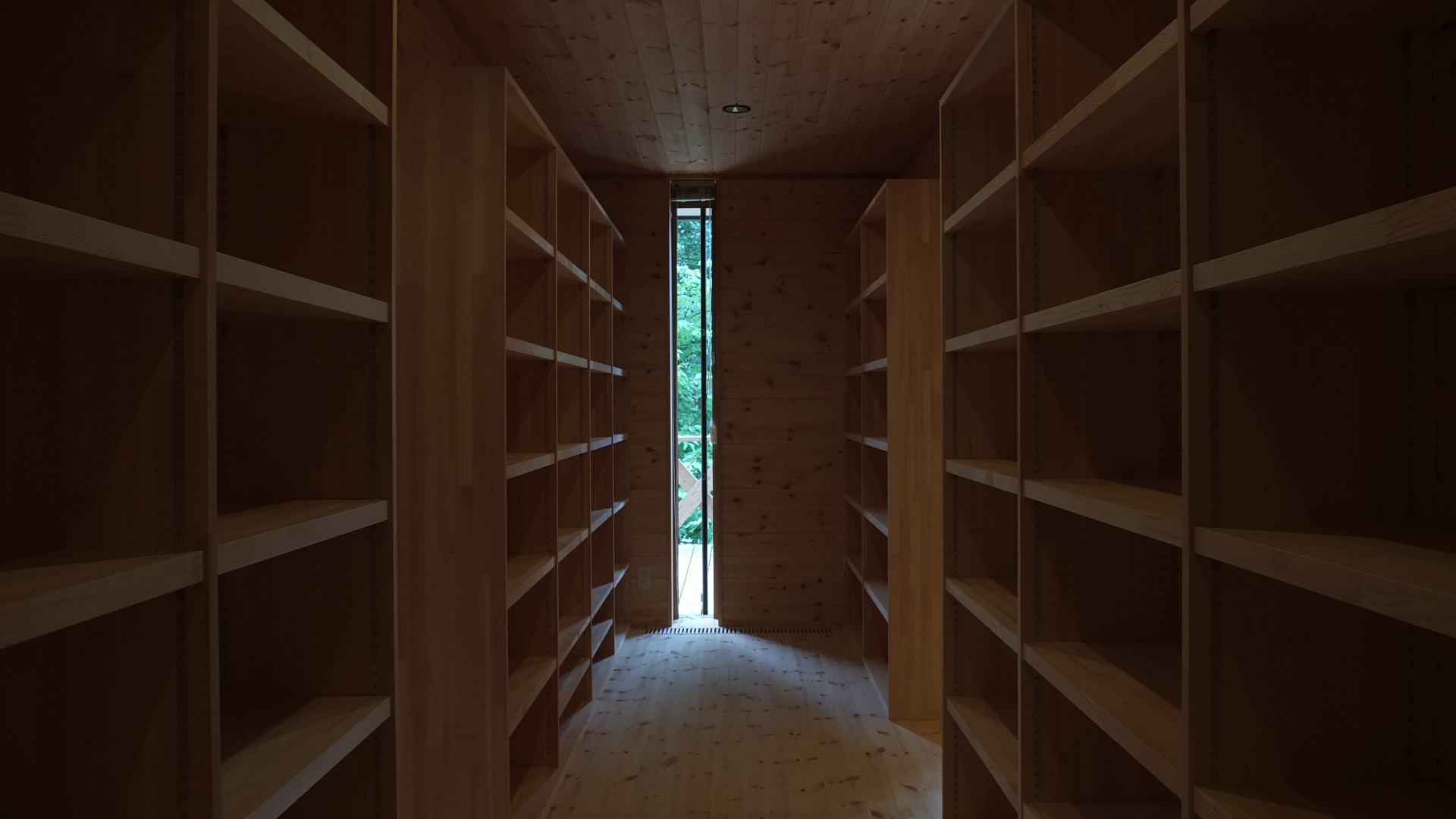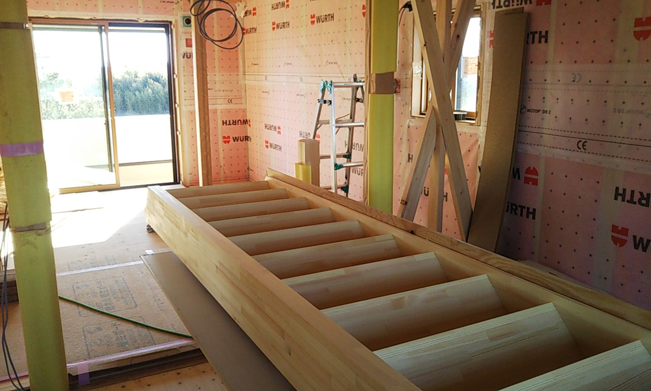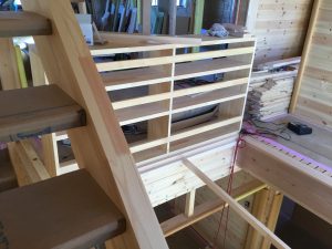 各部棚の造作工事。sn様は書籍をたくさんお持ちのため、廊下や通路などの共用部は本棚を据えていろいろな機能と兼ねる場所がたくさんあります。吹抜に面して本棚を造り、手摺と兼ねたりしています。
