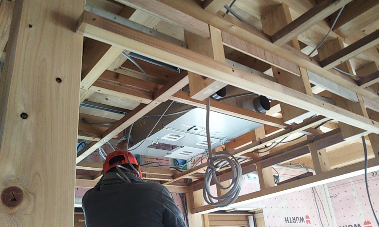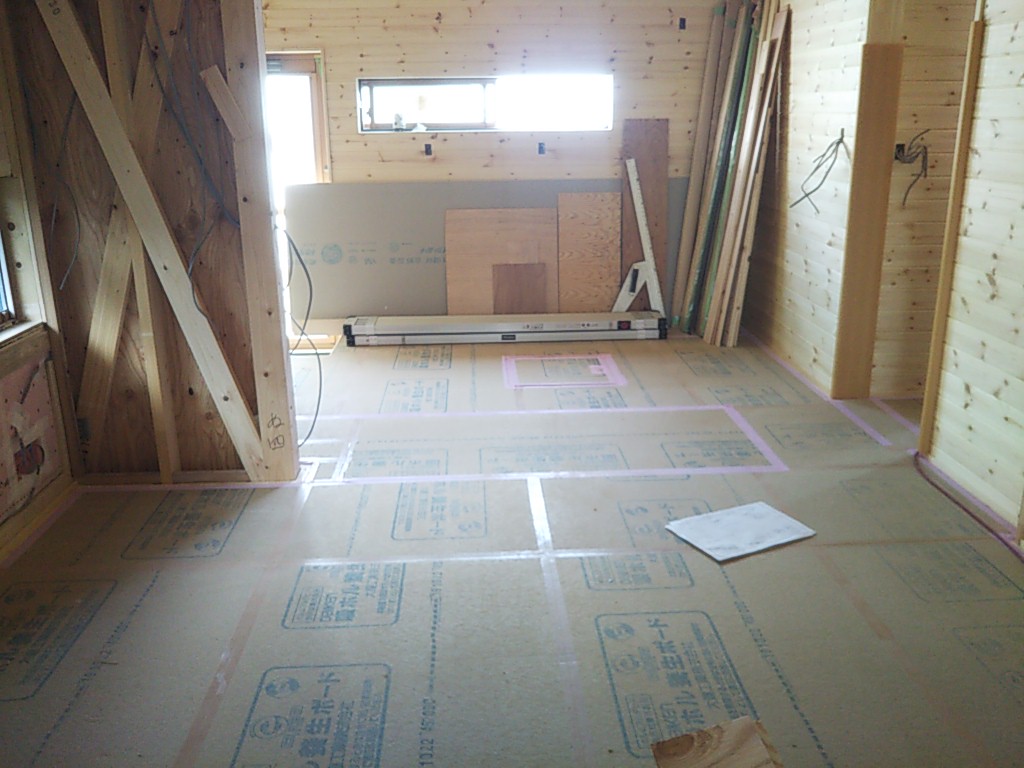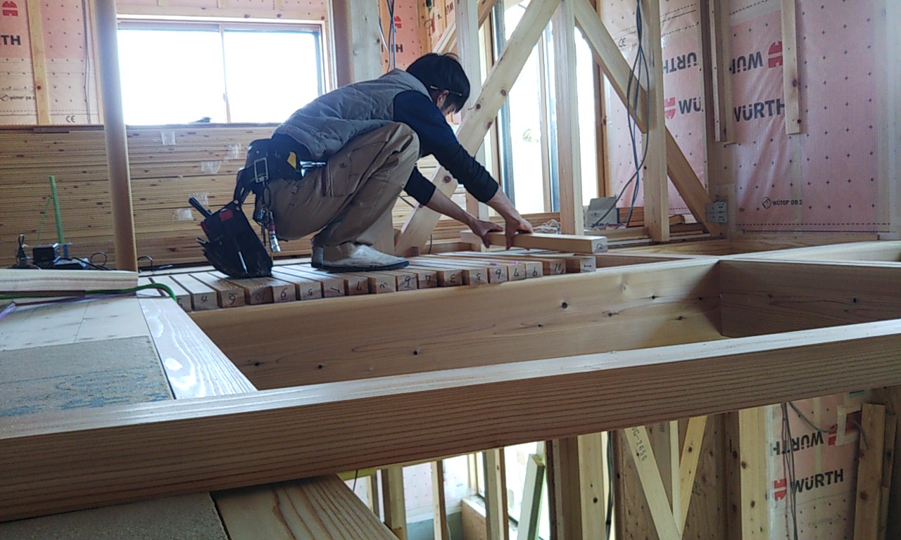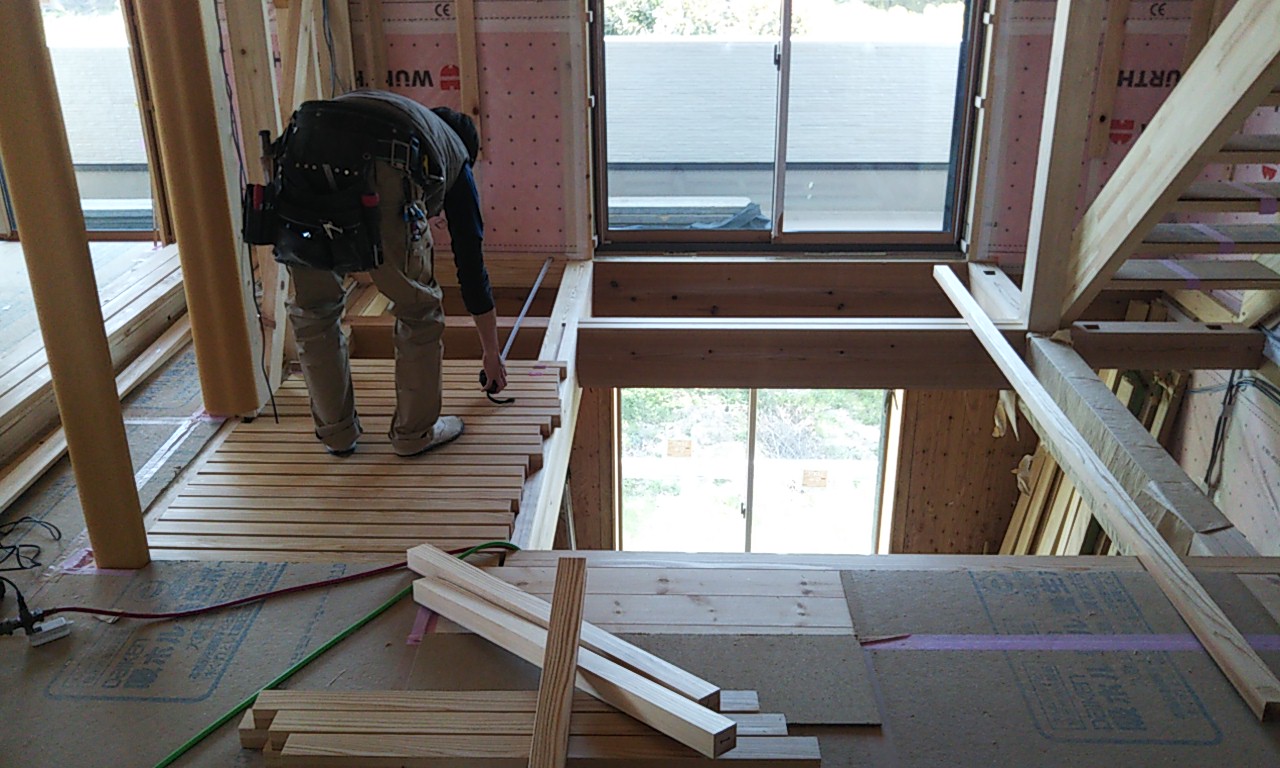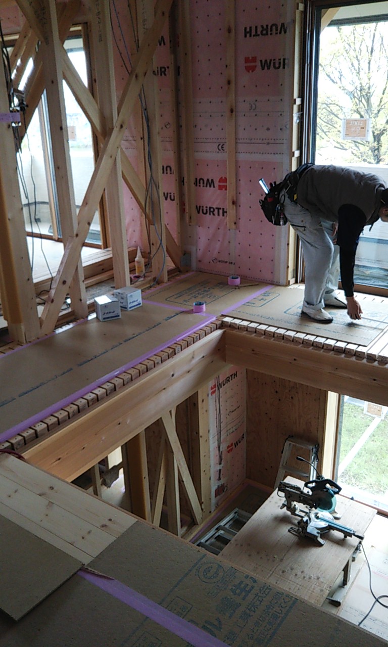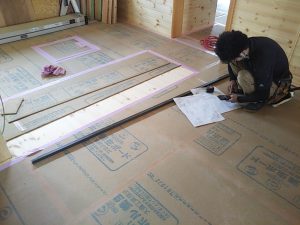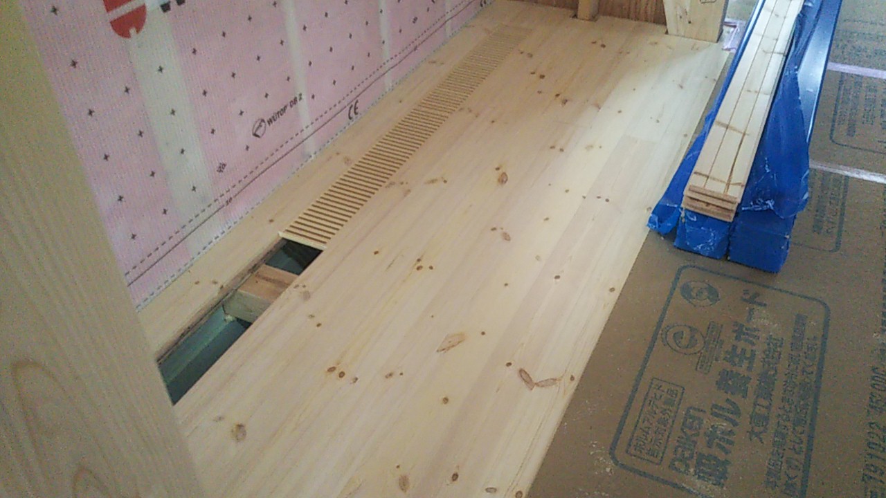 室内ではひたすらフローリング張工事です。フロアを張っていくのと同時に、床換気口の位置も決め、開口を施していきます。