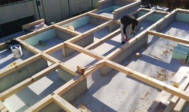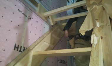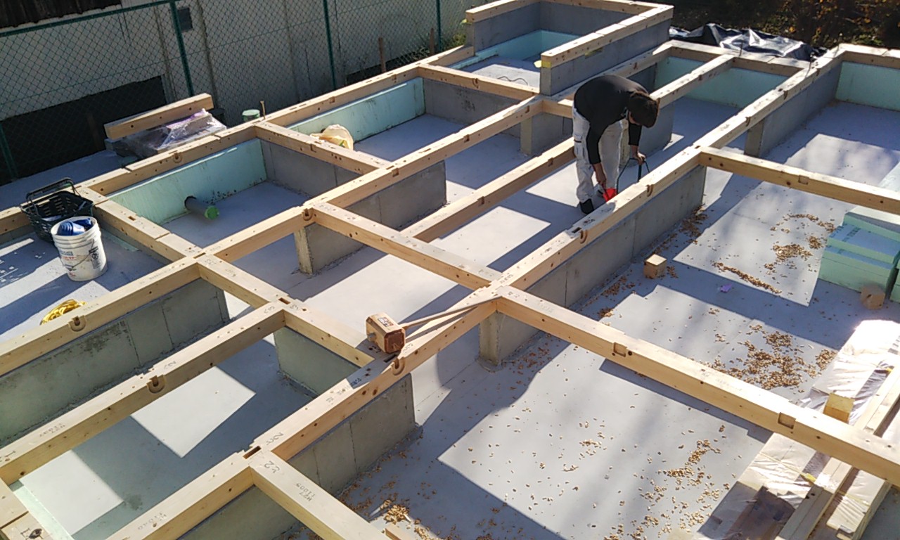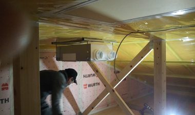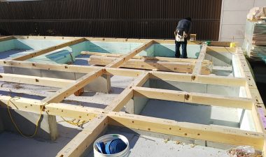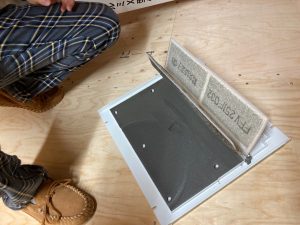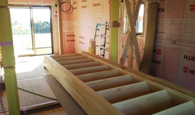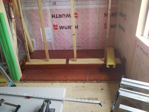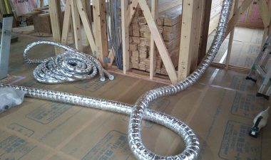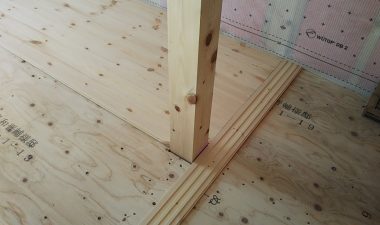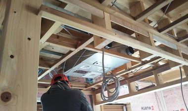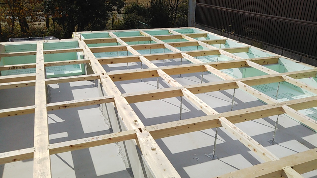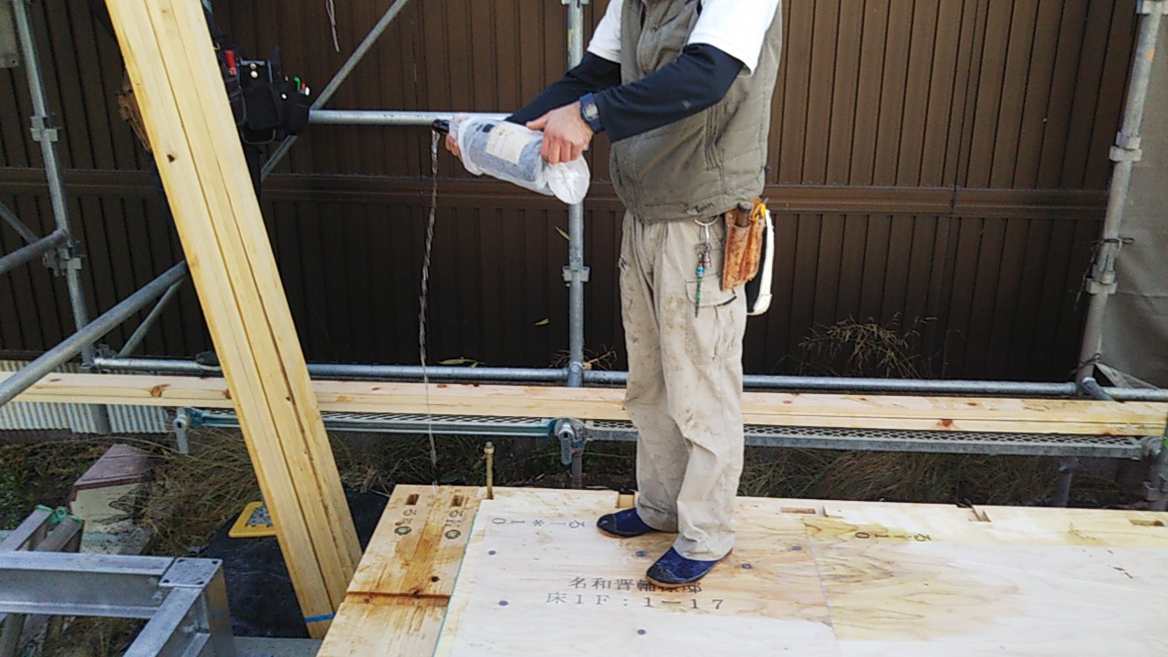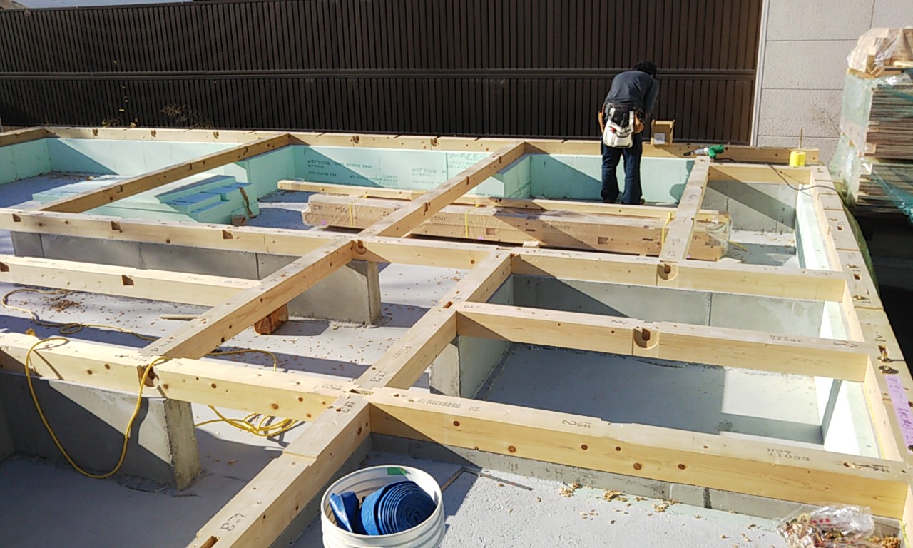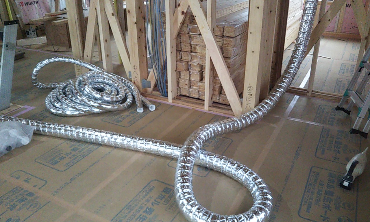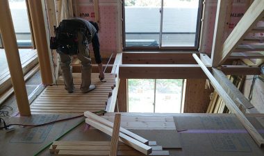 室内ではひたすらフローリング張工事です。フロアを張っていくのと同時に、床換気口の位置も決め、開口を施していきます。