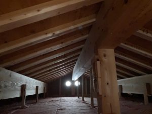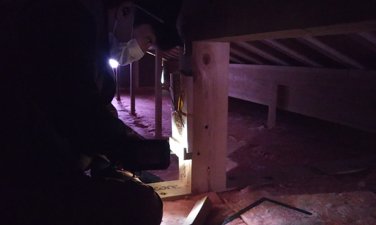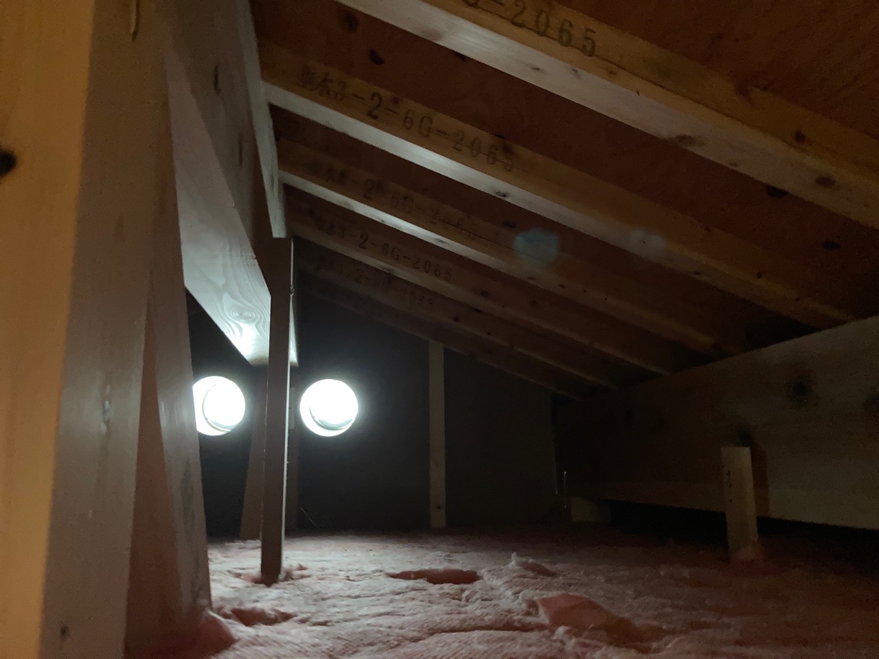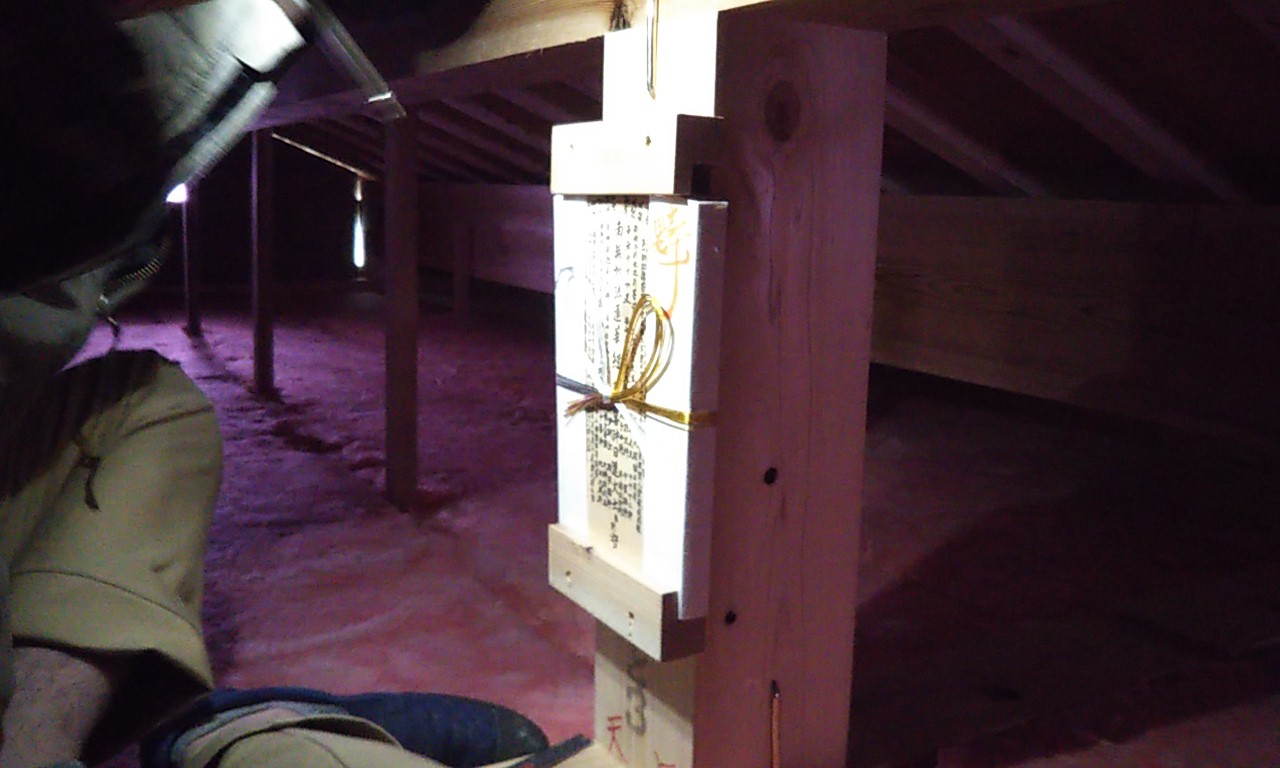 小屋裏空間をチェック。特に漏水などの後も見られず、お引渡し当時のままです。上棟式の時にもらって工事中に安置したお札も見られます。