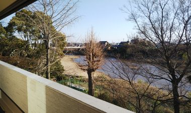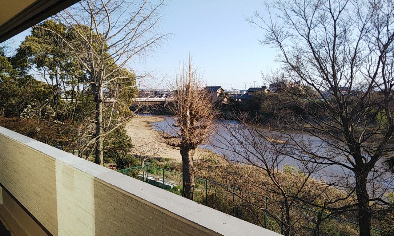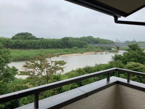 南のバルコニーから見られる川の流れ。このところの雨でかなり増水しています。